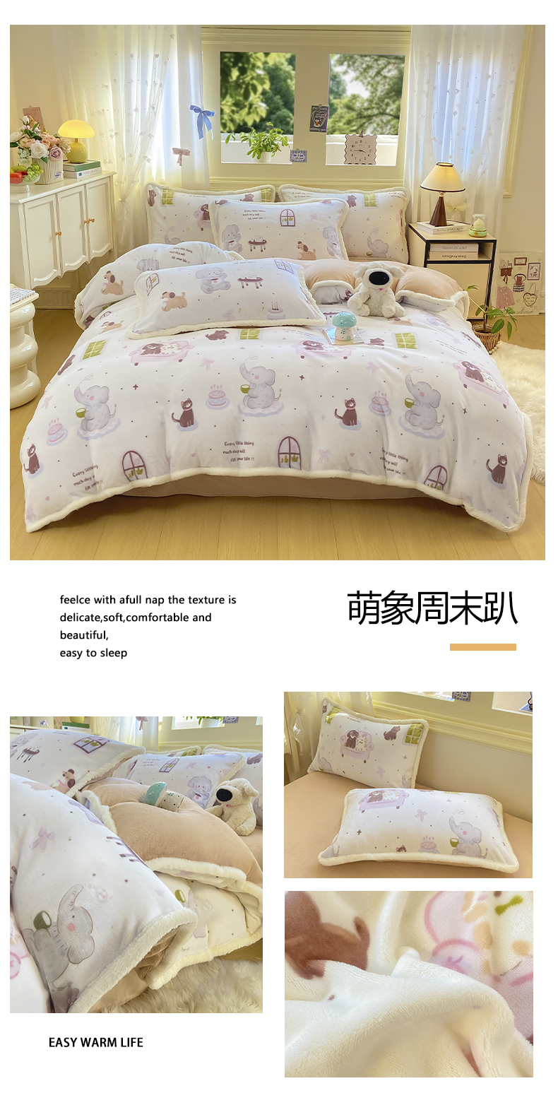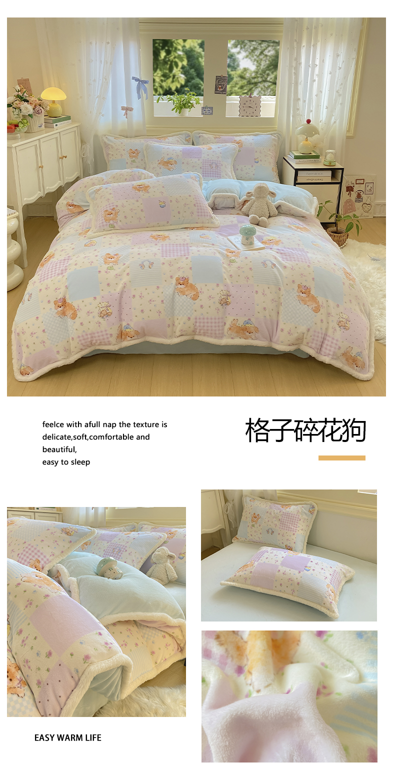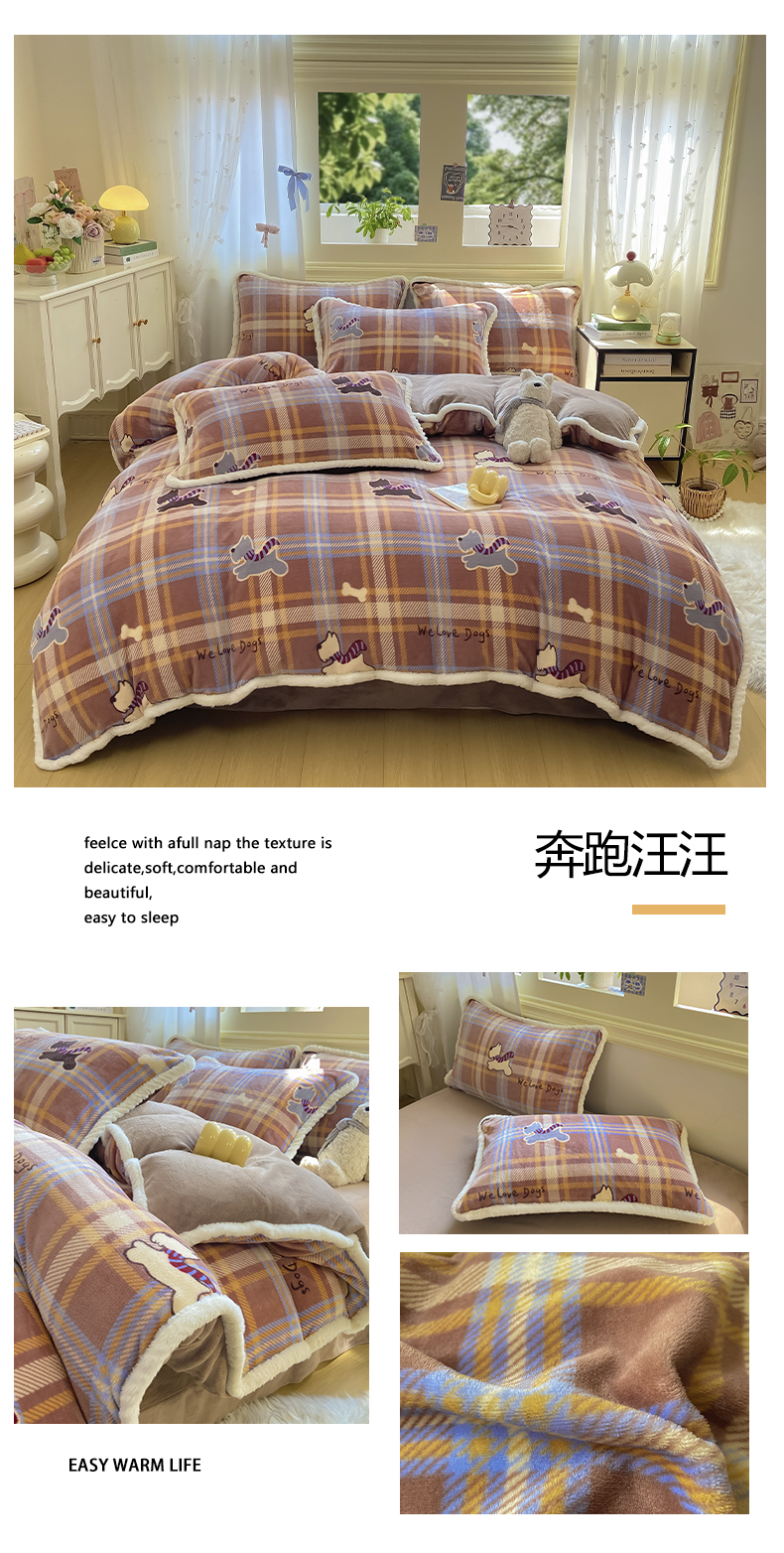 (总)大麦家纺 2025年新款兔毛花边印花牛奶绒四件套,奔跑汪汪,步步生花,草地小狗,磁带熊仔米,格子碎花狗,黑小格,快乐喵,腊肠狗联盟,萌趣布布,萌象周未趴,幸运狗狗
