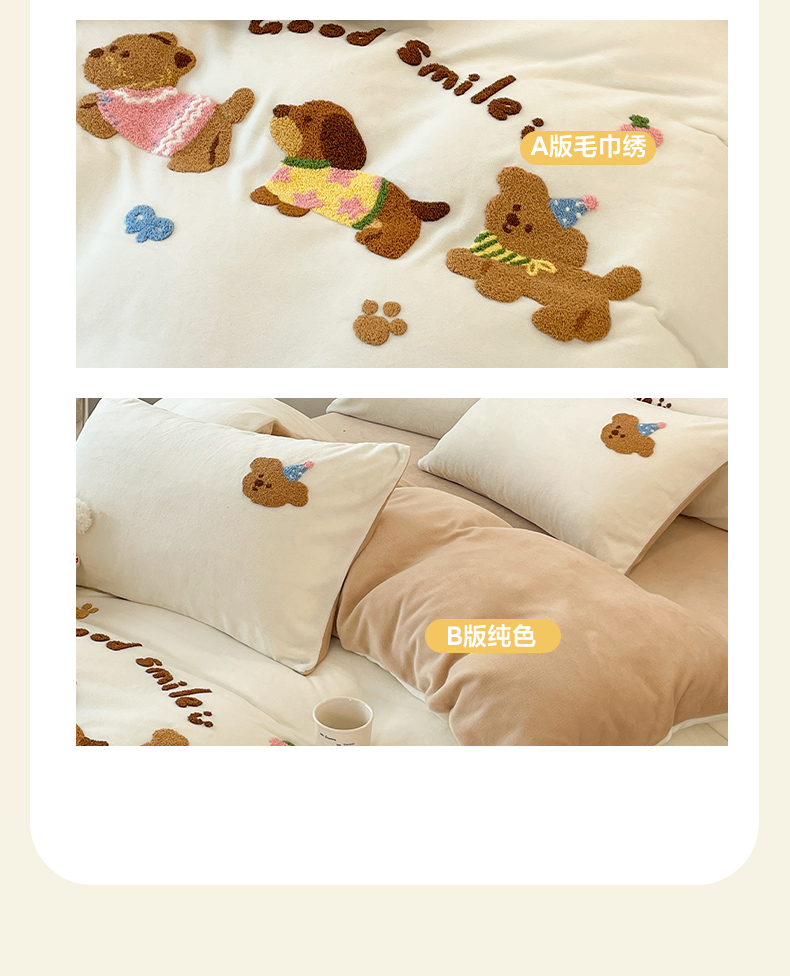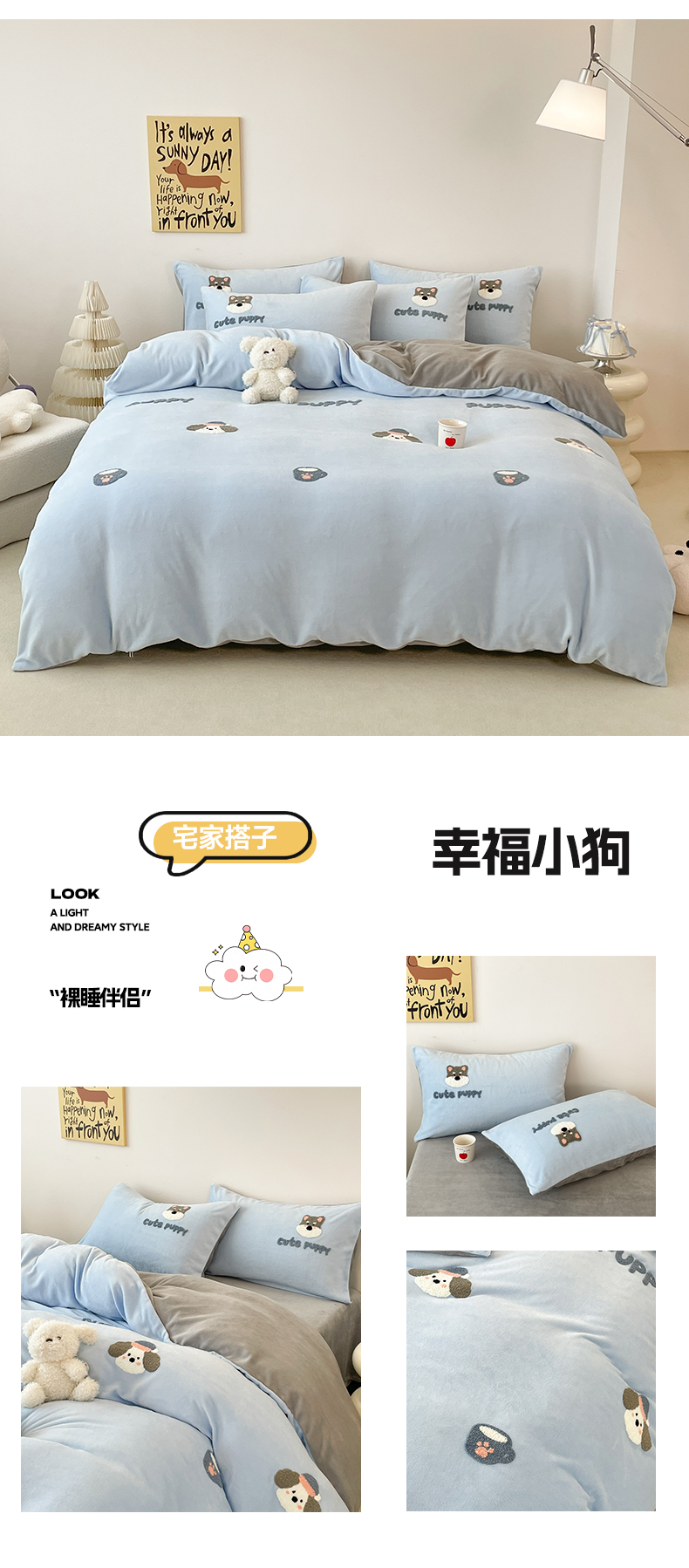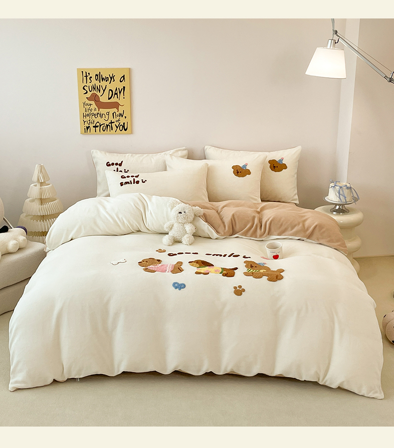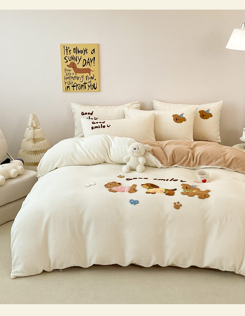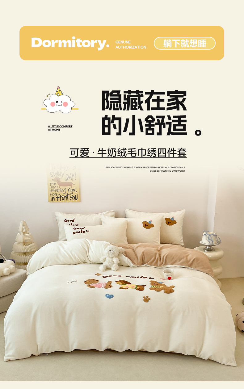 当前位置: 91家纺网 > 商品网购 > 床品套件 > 四件套 > 牛奶绒四件套 > 启发 2025新款牛奶绒毛巾绣四件套场景一 腊肠狗狗