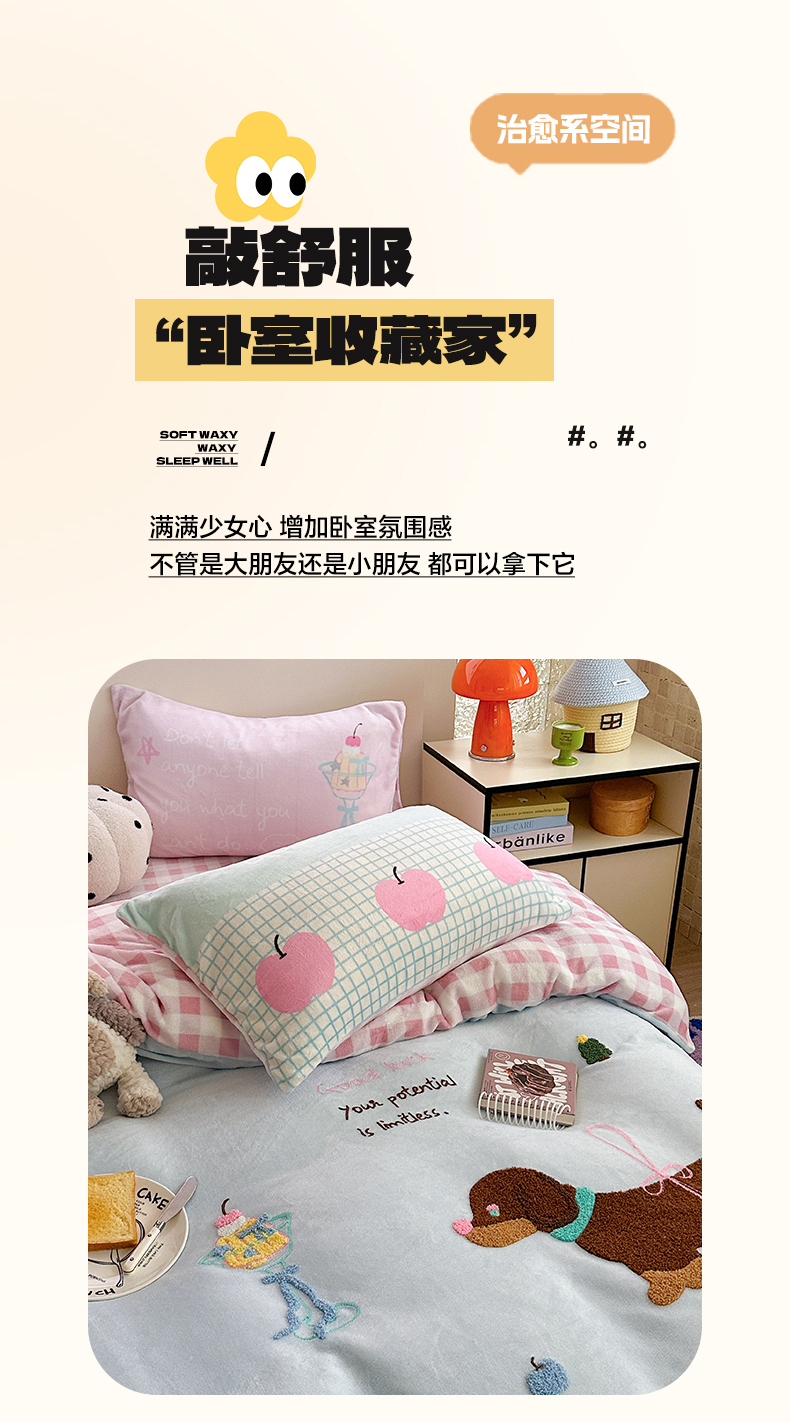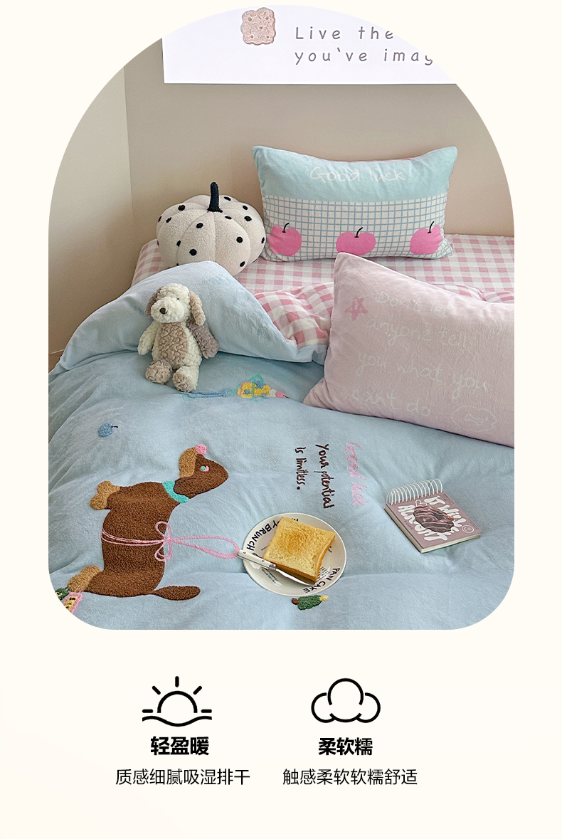 美乐迪家纺 2025新款牛奶绒卡通绣花四件套 甜趣卡通