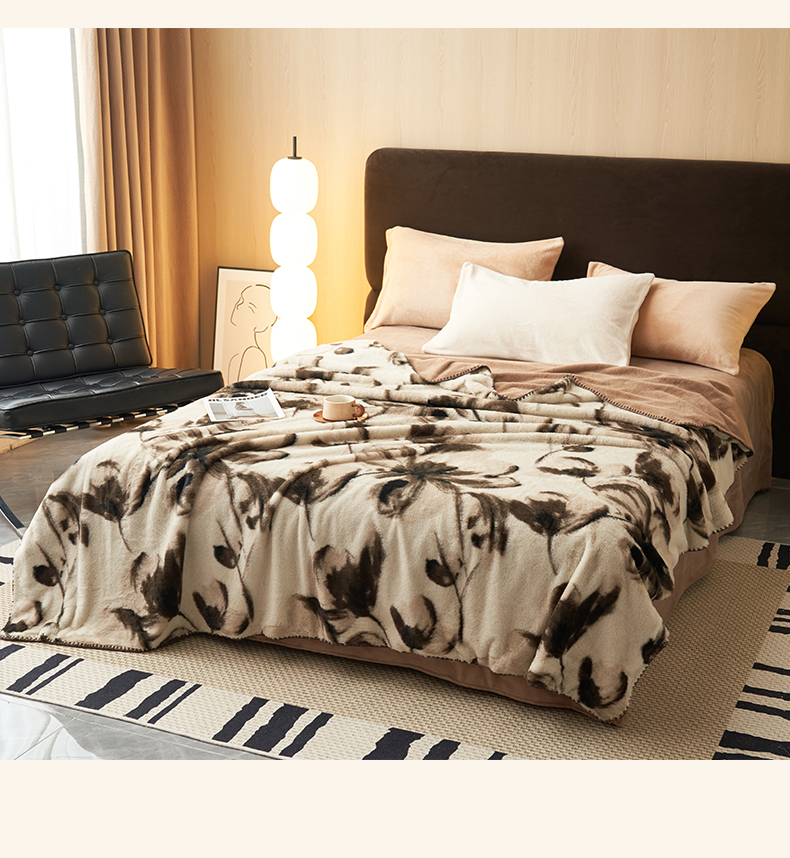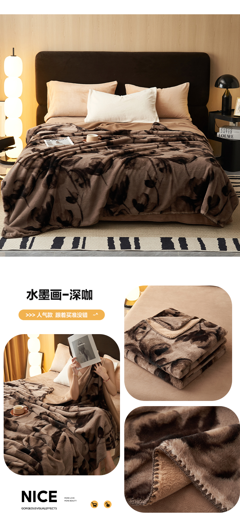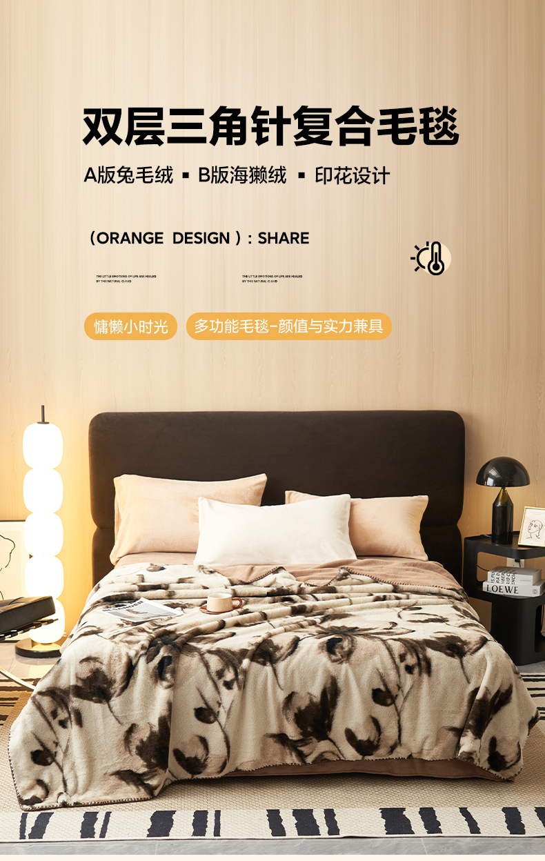 晨曦家纺 2025新款兔毛绒海獭绒双层毛毯三角针复合毛毯 幽梦咖