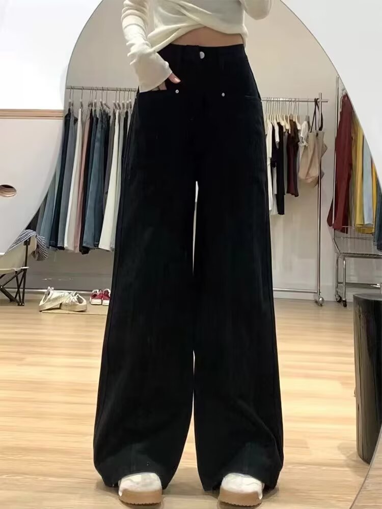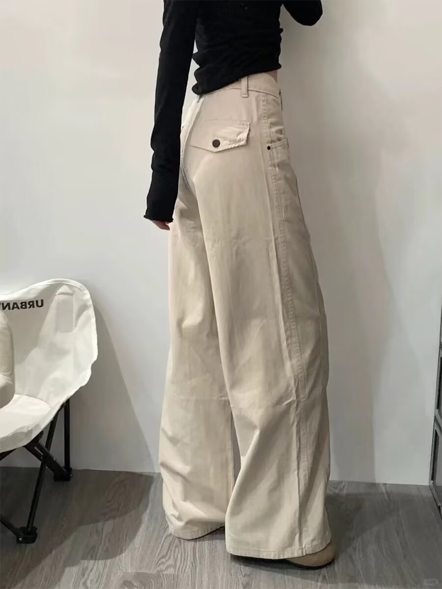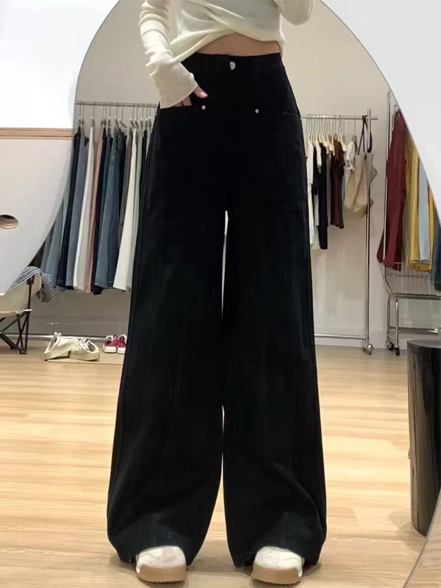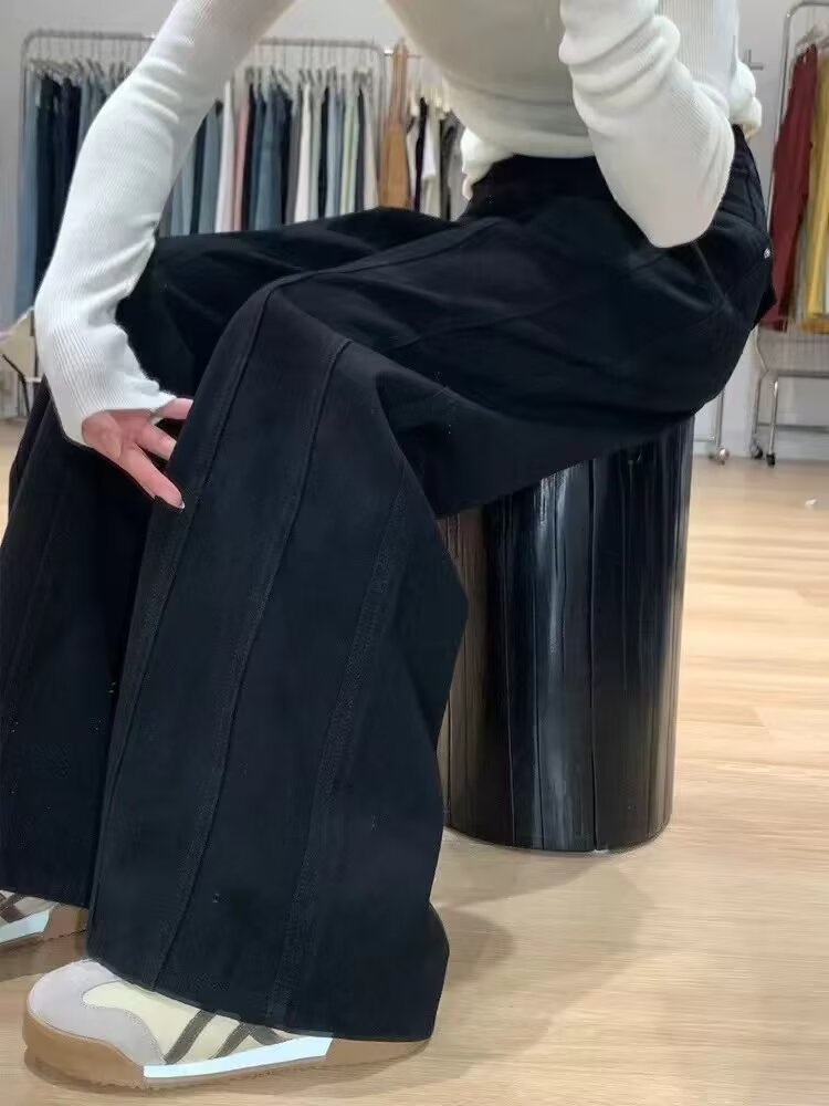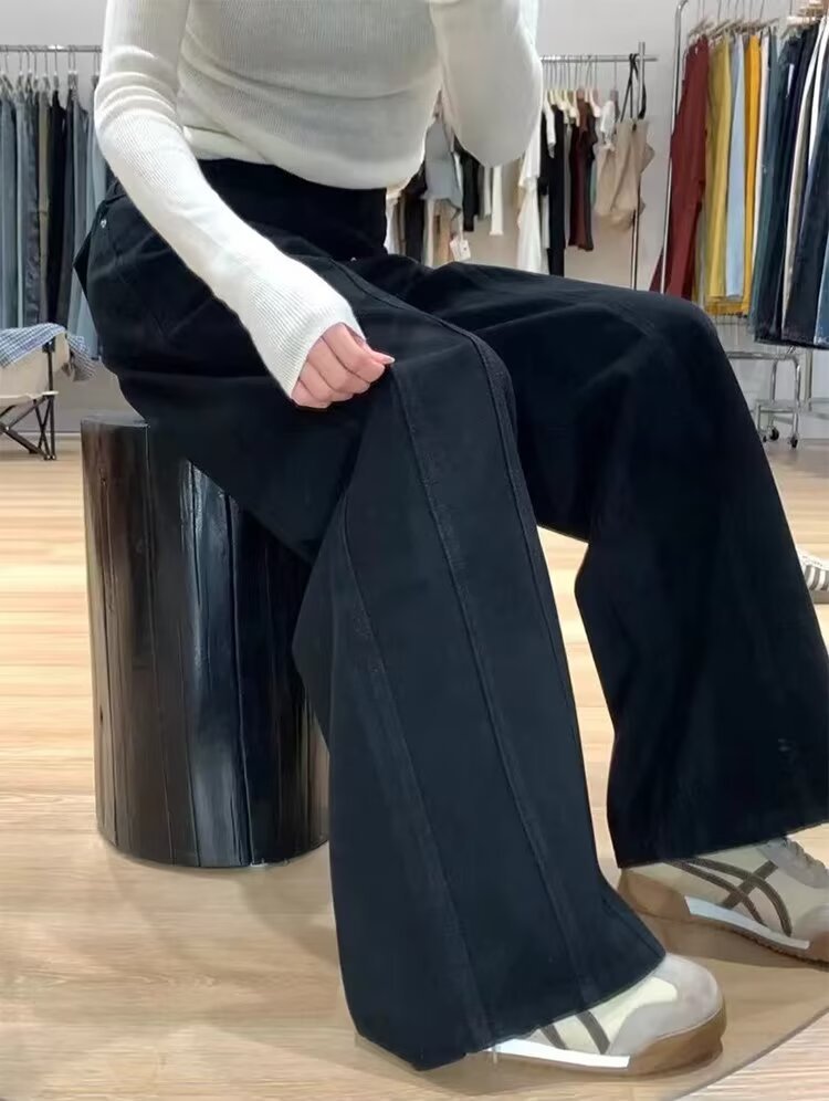 商品名称:洛兰沙家居馆【只代发】【只代发】 2025新款只代发 批发牛仔裤米杏色阔腿休闲工装裤女春季新款设计感高腰宽松显瘦直筒牛仔裤子 黑色