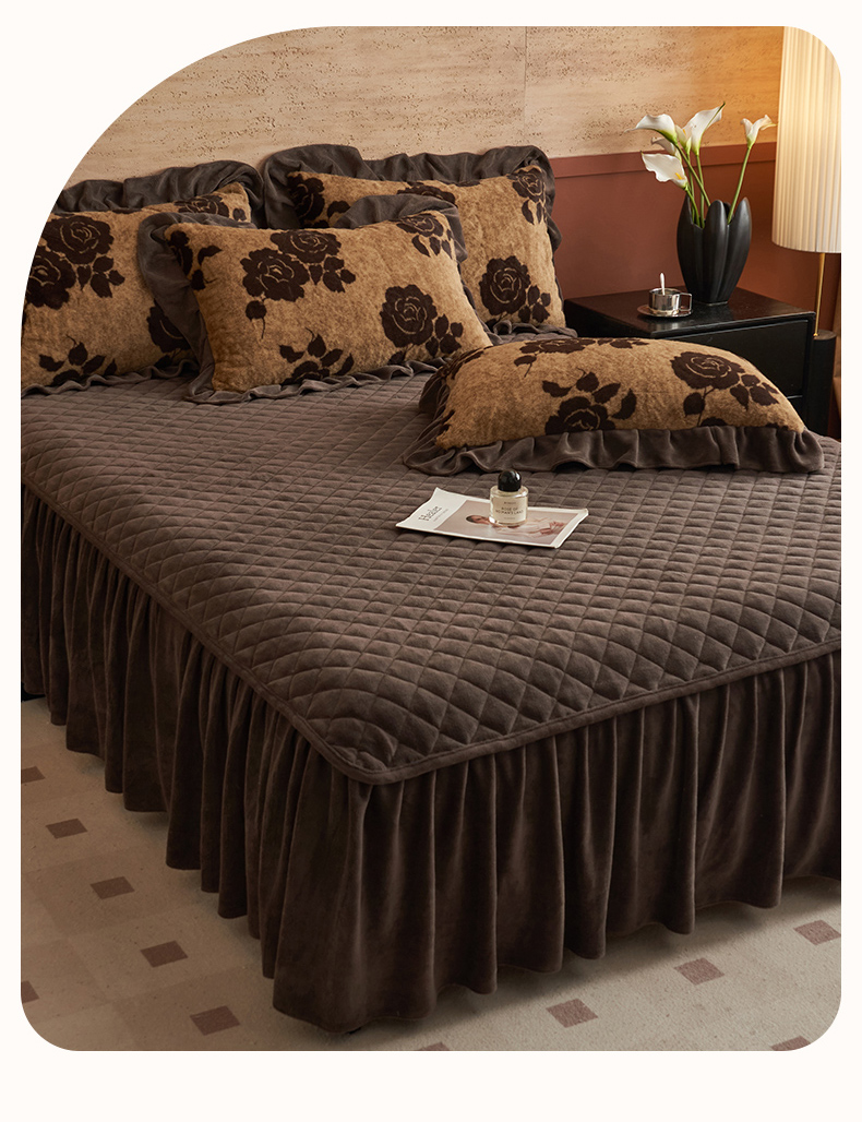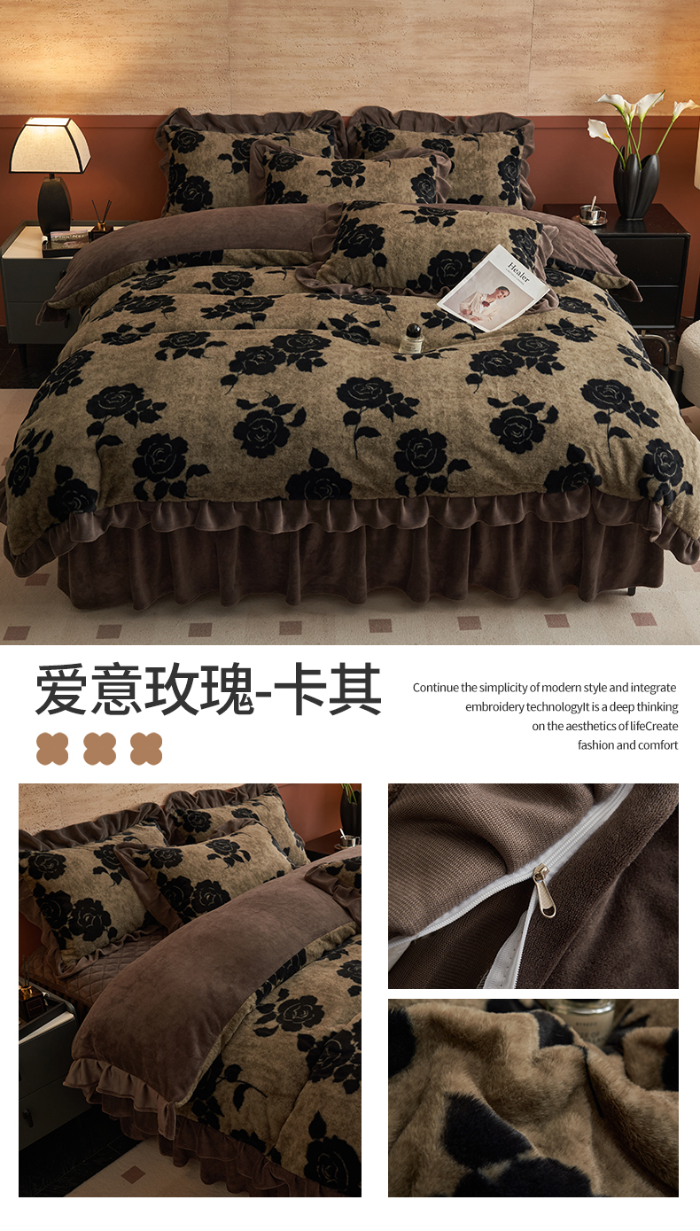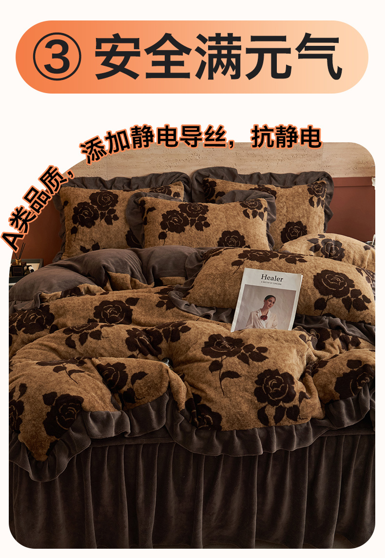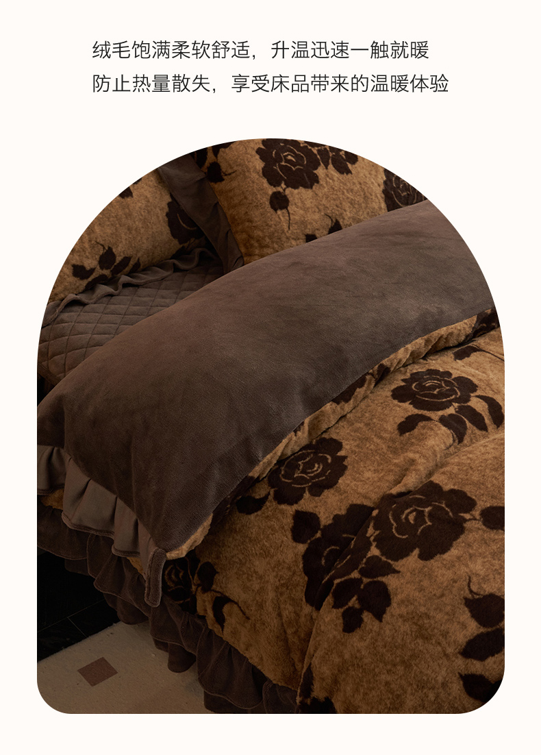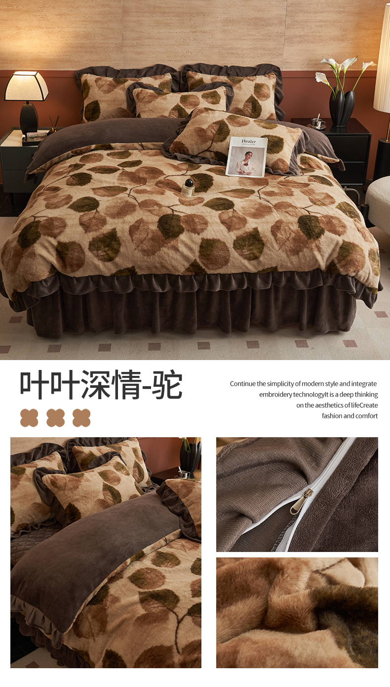 商品名称:金鹰 2025新款A类兔毛绒夹棉床裙四件套加厚牛奶绒四件套 叶叶深情-驼