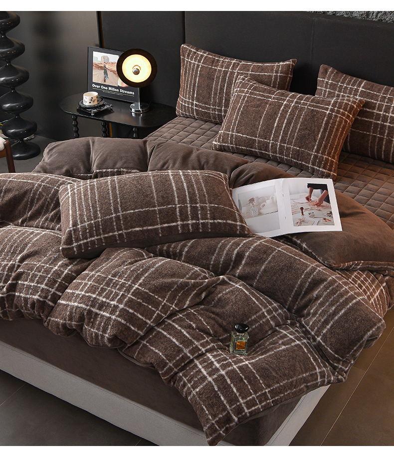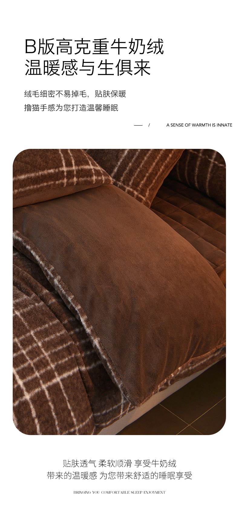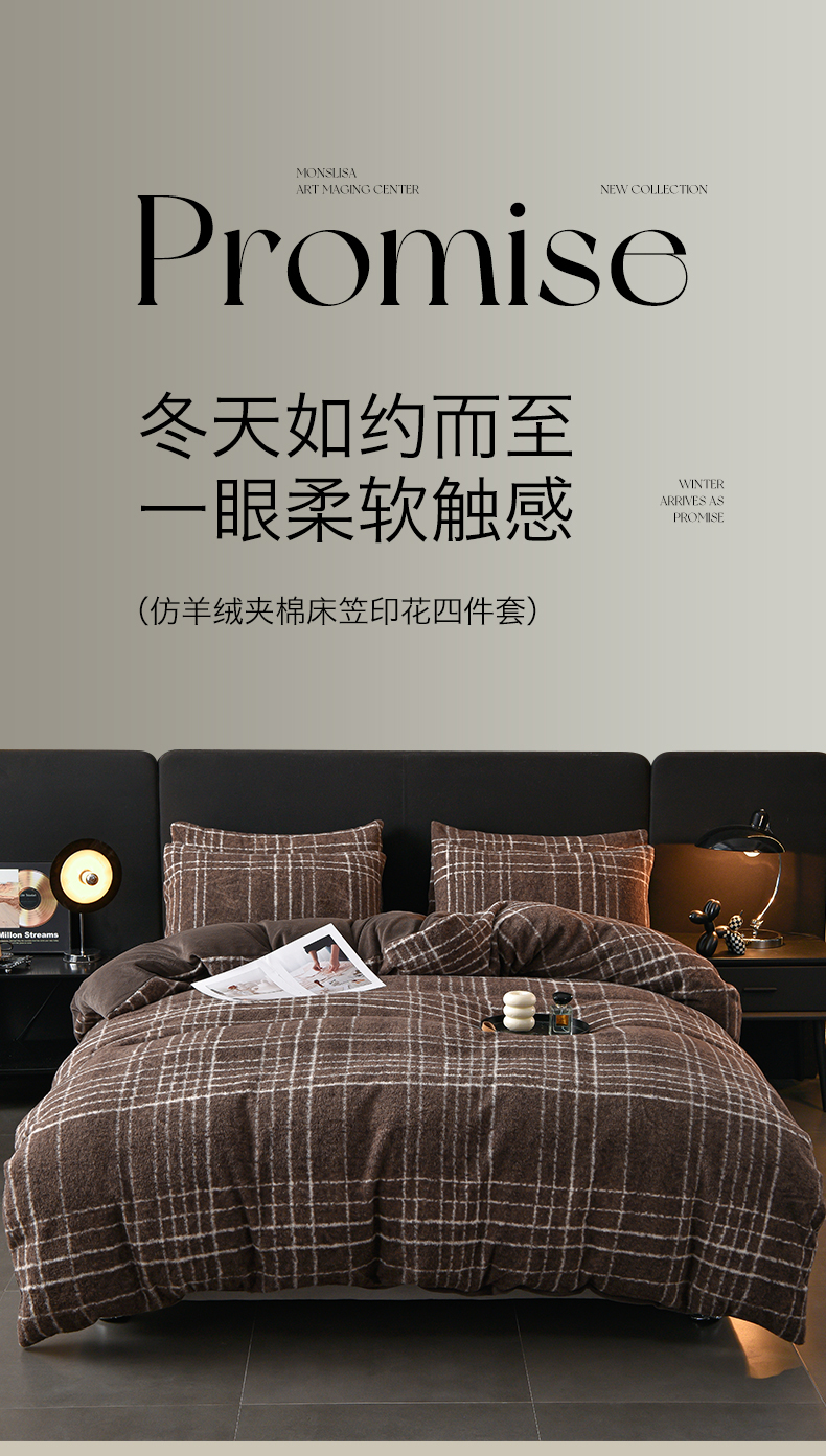 金鹰 2025新款仿羊绒夹棉印花床笠四件套加厚牛奶绒四件套 米兰-咖