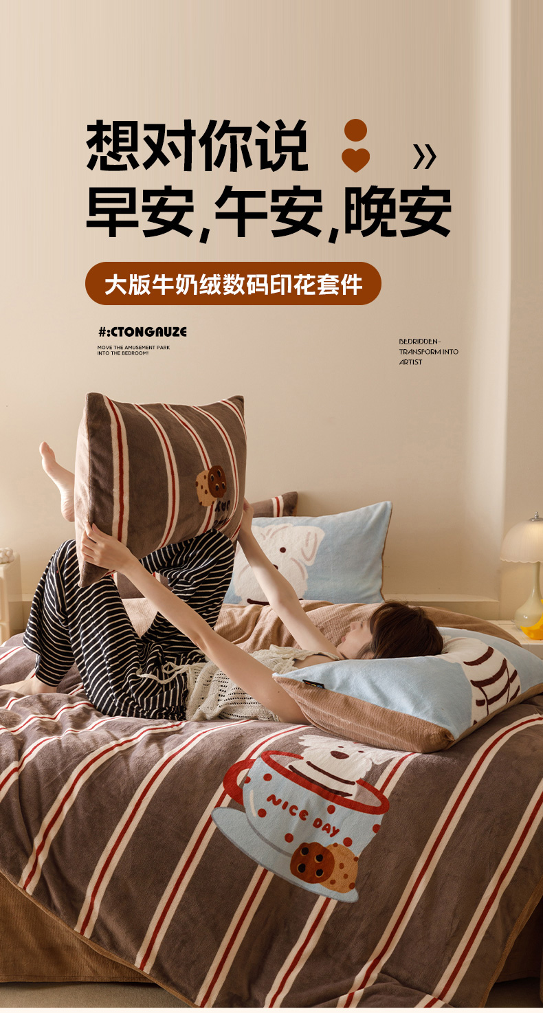 (总)RYB红黄兰 2025新款设计师原创数码印花牛奶绒夹棉床盖三件套,豹纹蝴蝶结,豹纹奶牛猫,黑猫日记,蓝条哈基米,魔法星星熊,奶油熊宝,森林兔子,圣诞西高地,顽皮兄弟,幸运加马,包装