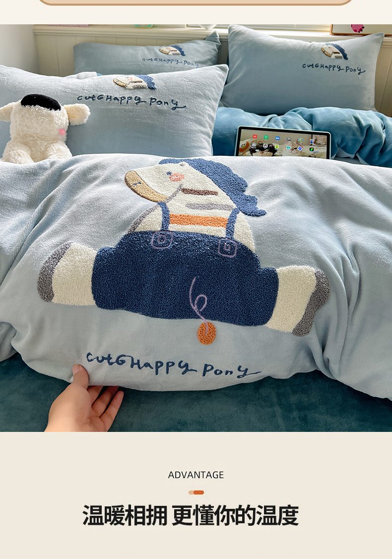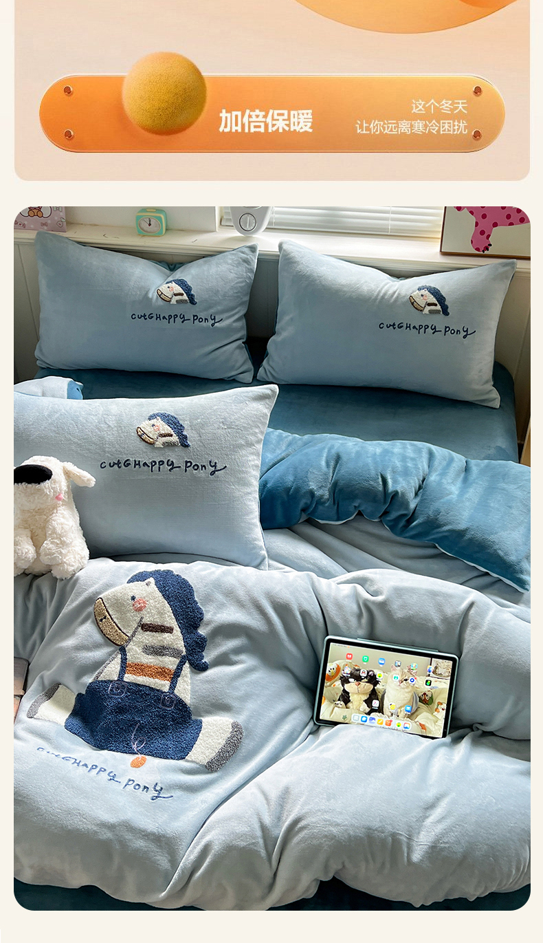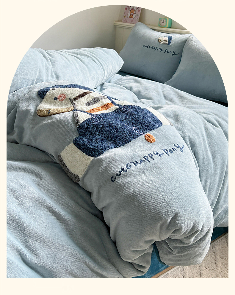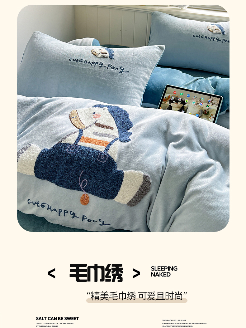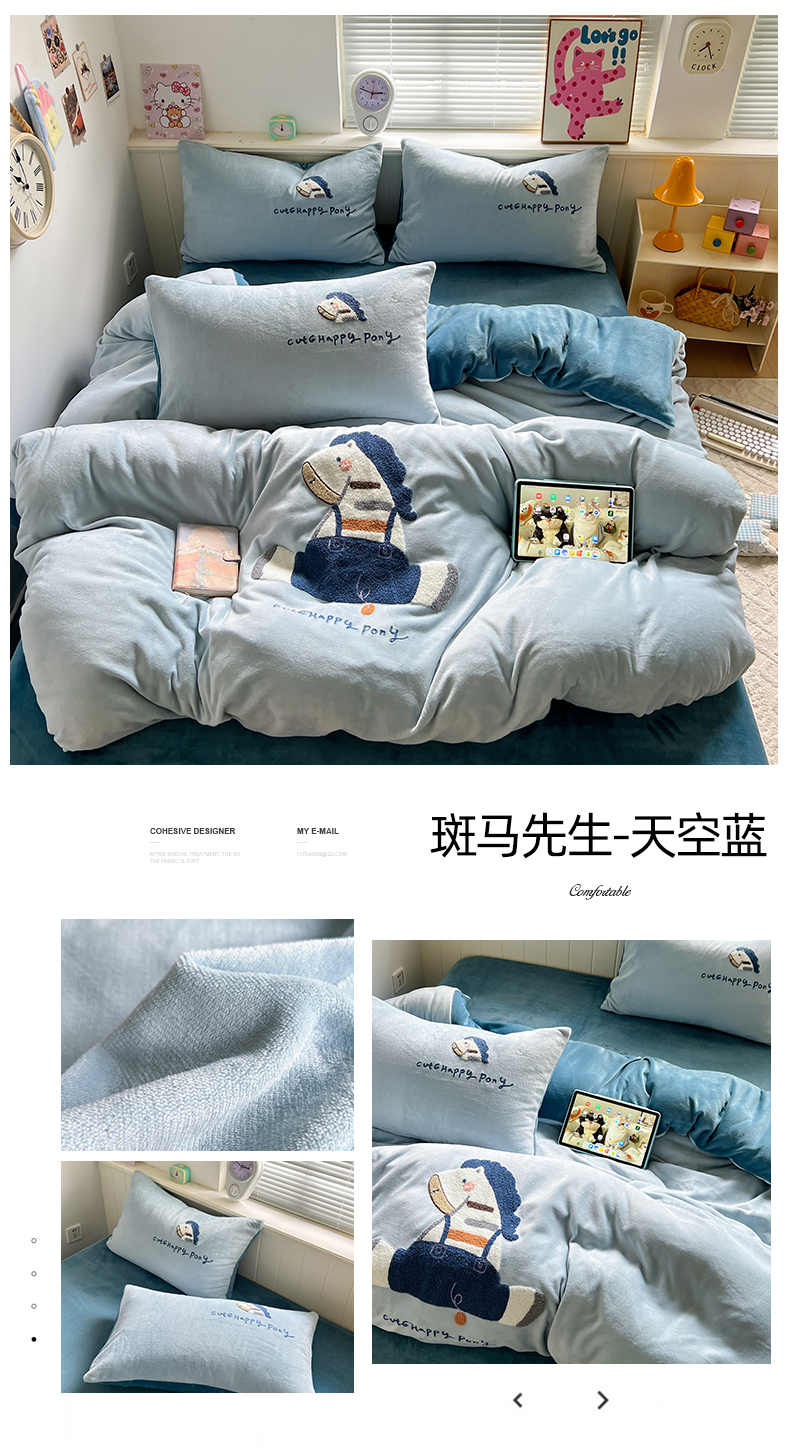 商品名称:凯洛奇 2025新款牛奶绒毛巾绣系列四件套-斑马先生(提供买家秀) 斑马先生-天空蓝