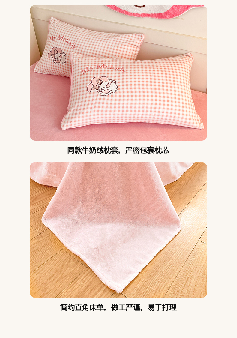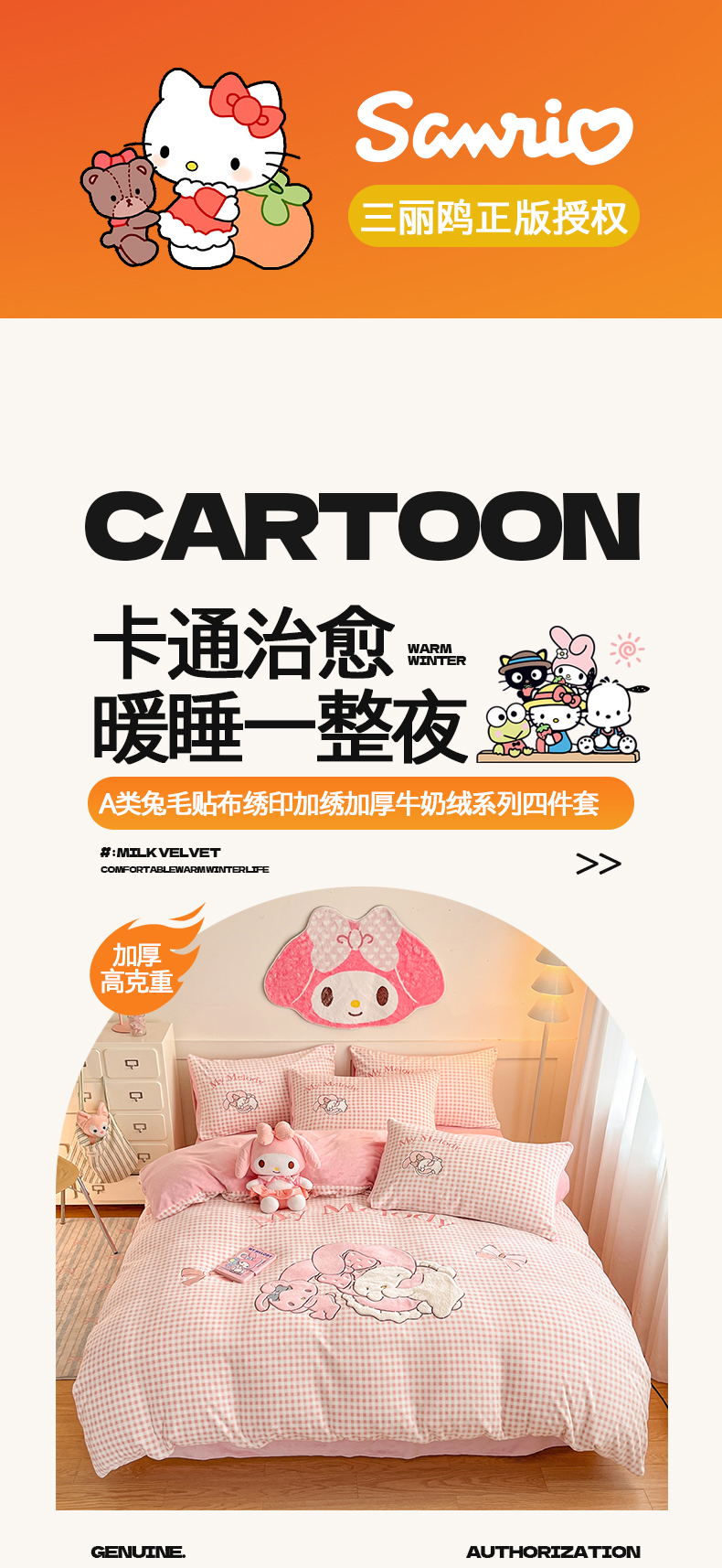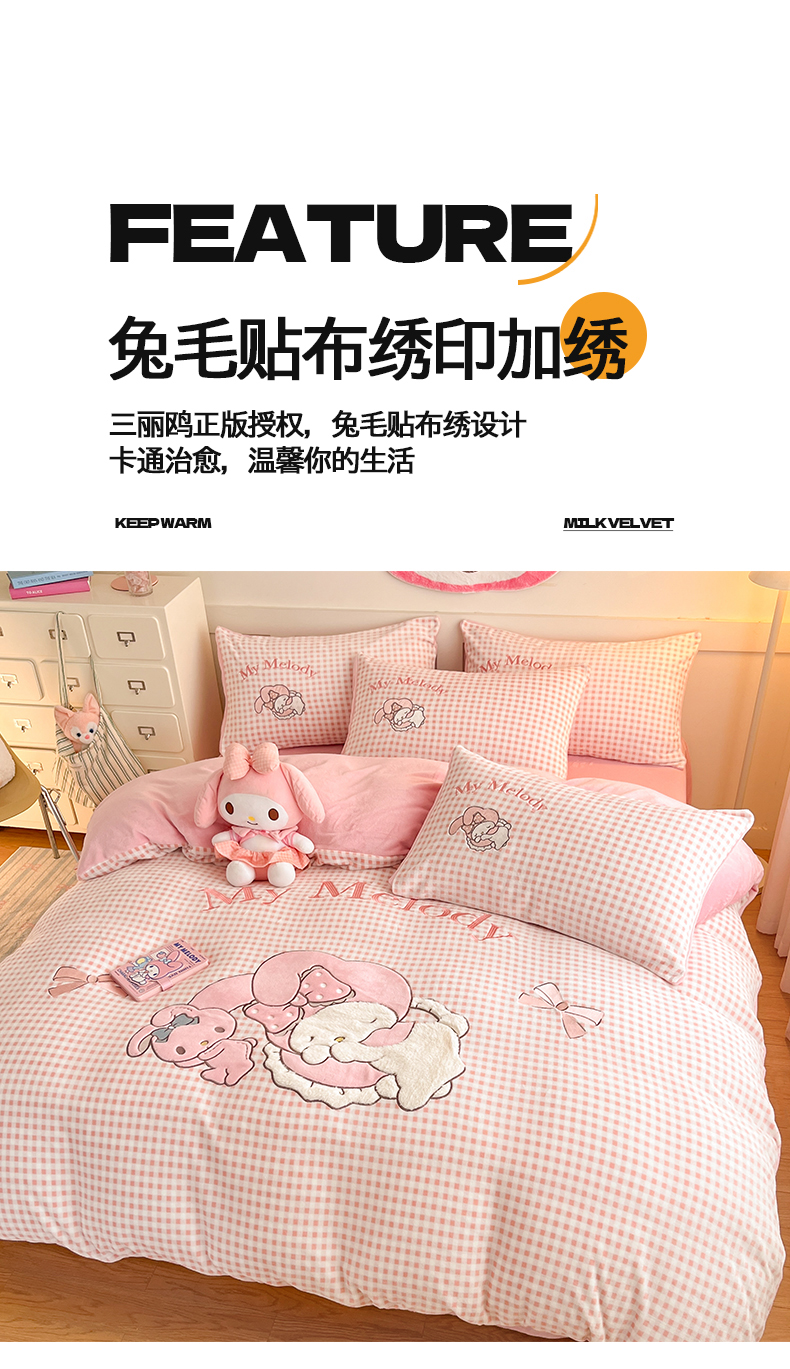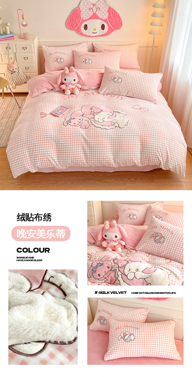 当前位置: 91家纺网 > 商品网购 > 床品套件 > 四件套 > 牛奶绒四件套 > 金爱家 2025新款A类三丽鸥授权Kitty兔毛贴布绣毛巾绣印加绣卡通少女加厚牛奶绒系列四件套 绒贴布绣-晚安美乐蒂