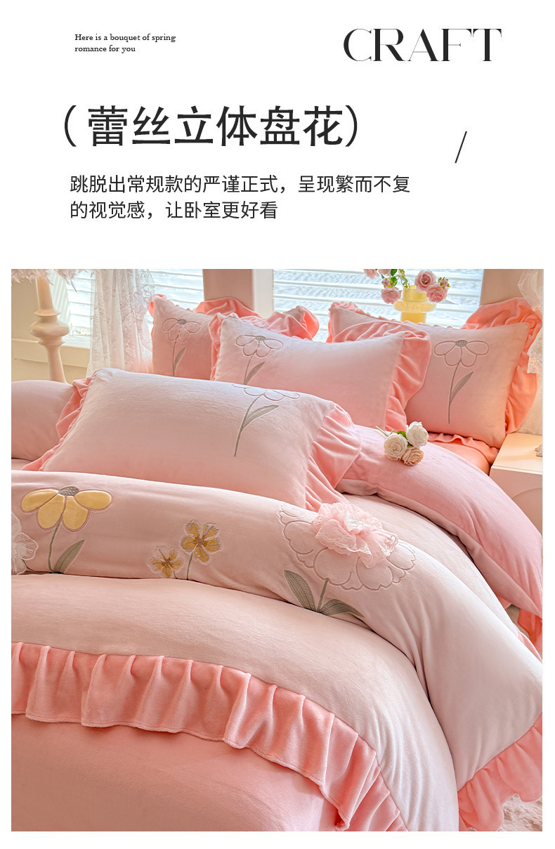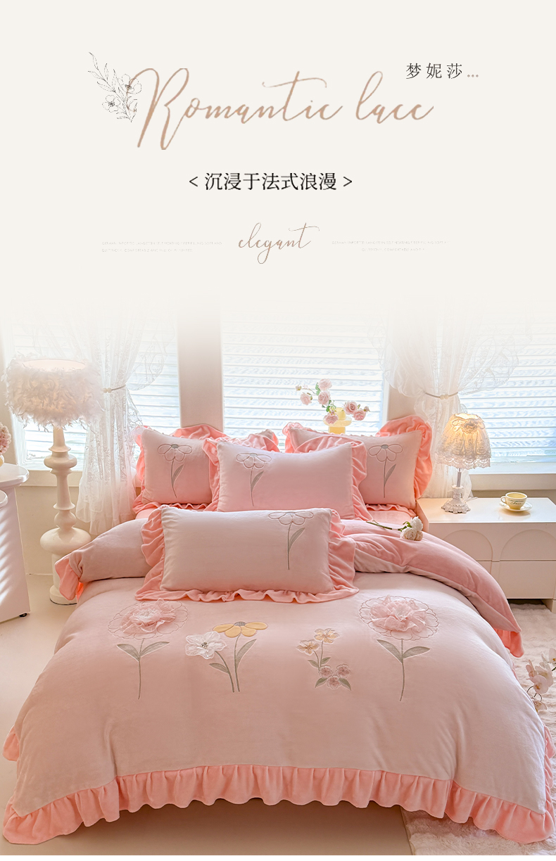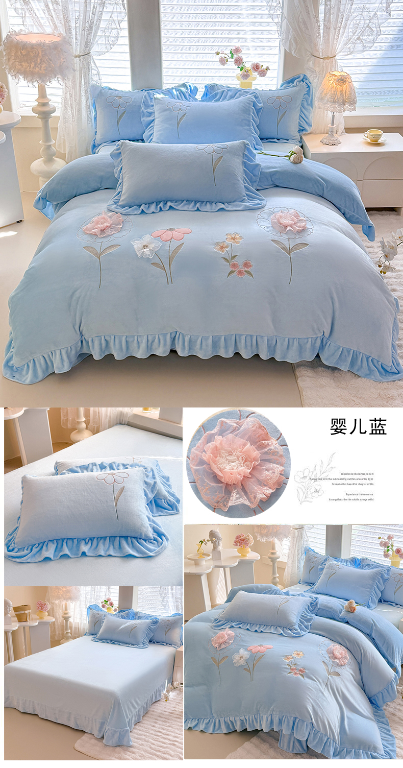 当前位置: 91家纺网 > 商品网购 > 床品套件 > 四件套 > 牛奶绒四件套 > 梦纤绒 2025秋冬新款230g高克重韩版立体盘花牛奶蚕丝绒绣花四件套-洛丽塔 洛丽塔-婴儿蓝