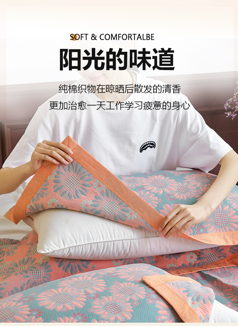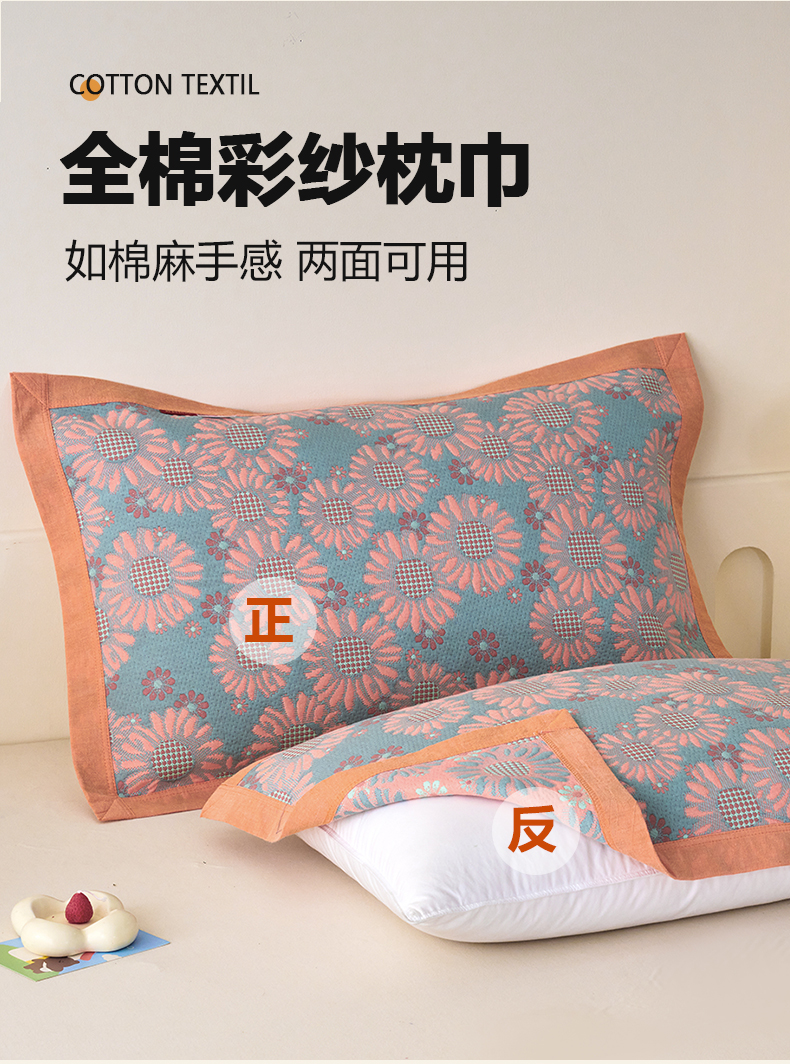 商品名称:棠薇家纺 2025新款全棉枕巾夹棉枕巾枕头盖巾彩纱三层纱枕巾 葵园蓝粉枕巾