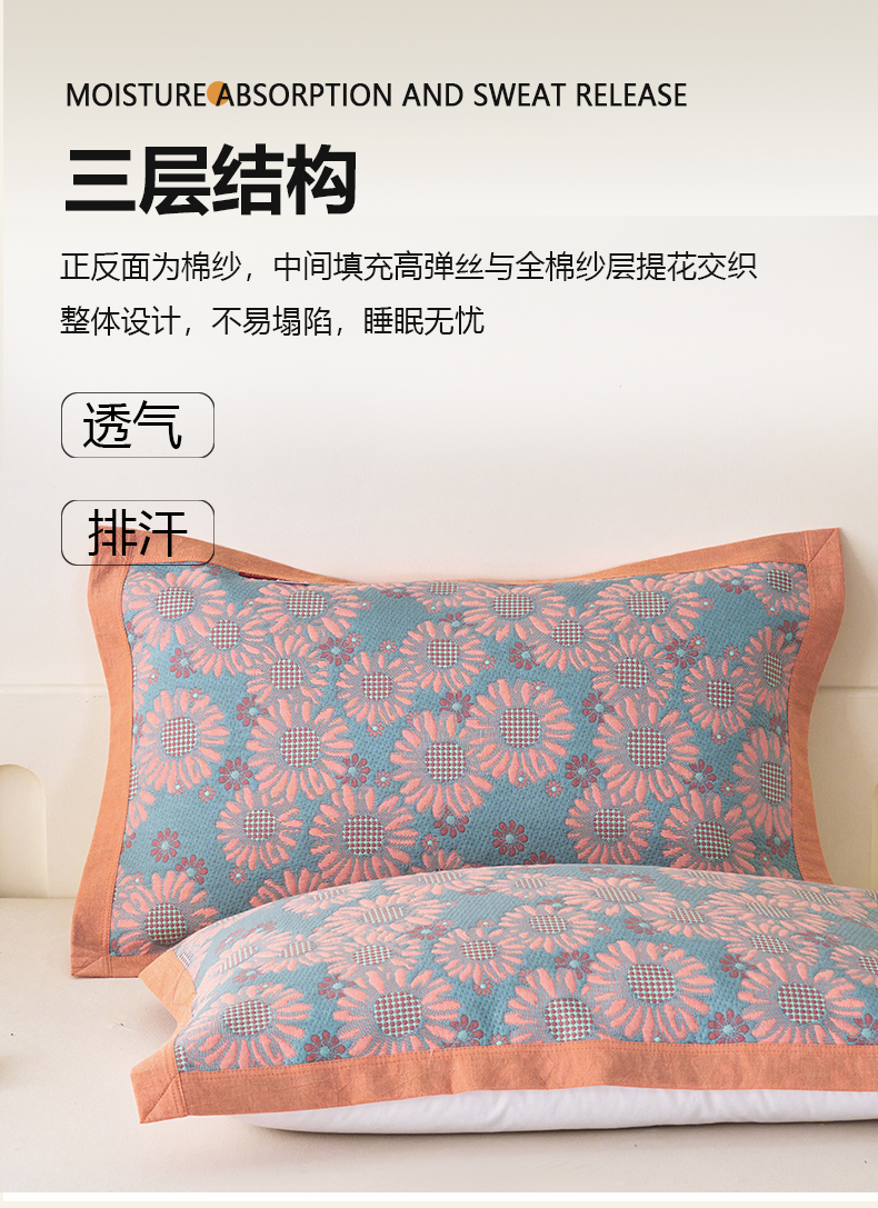 棠薇家纺 2025新款全棉枕巾夹棉枕巾枕头盖巾彩纱三层纱枕巾 葵园蓝粉枕巾
