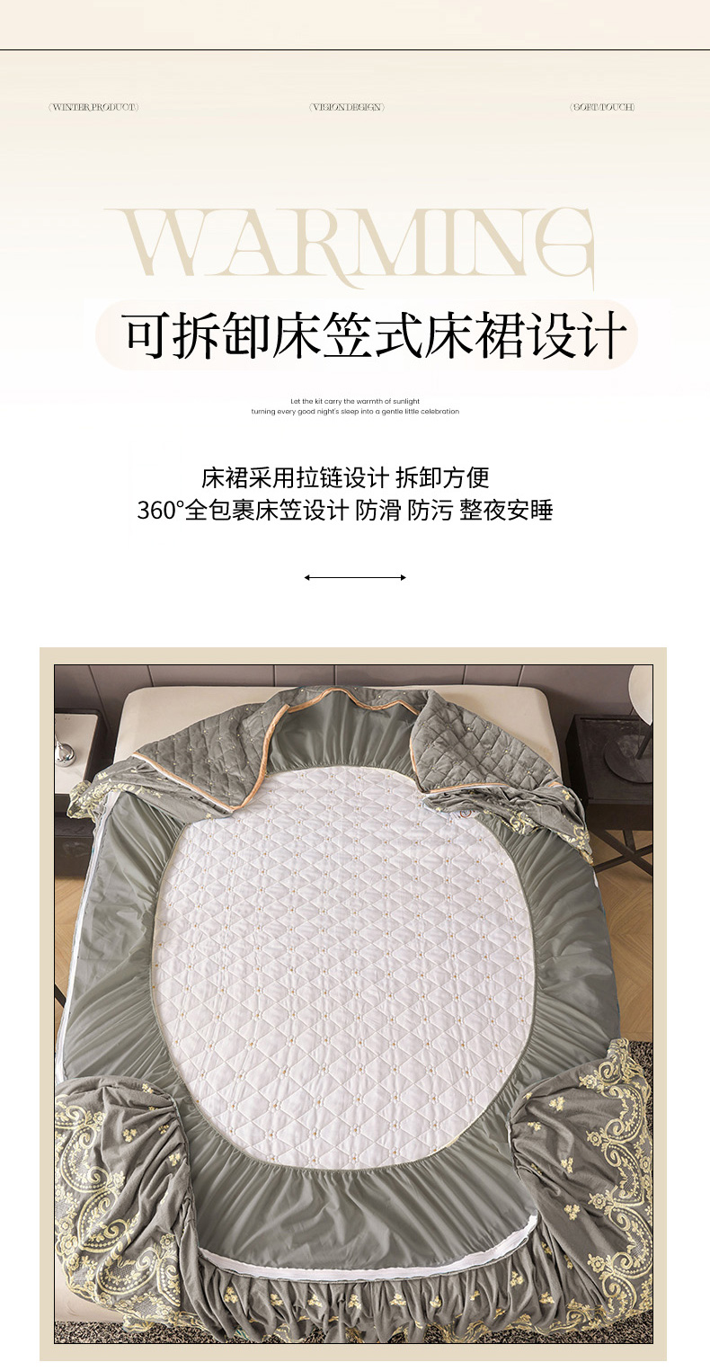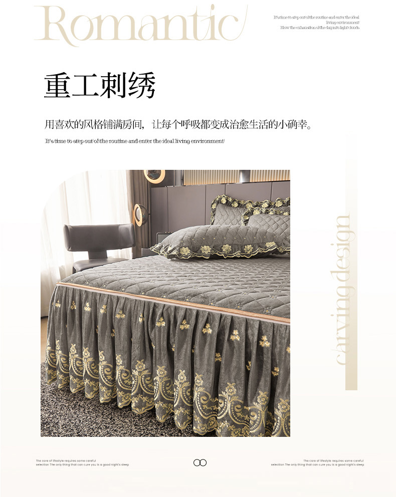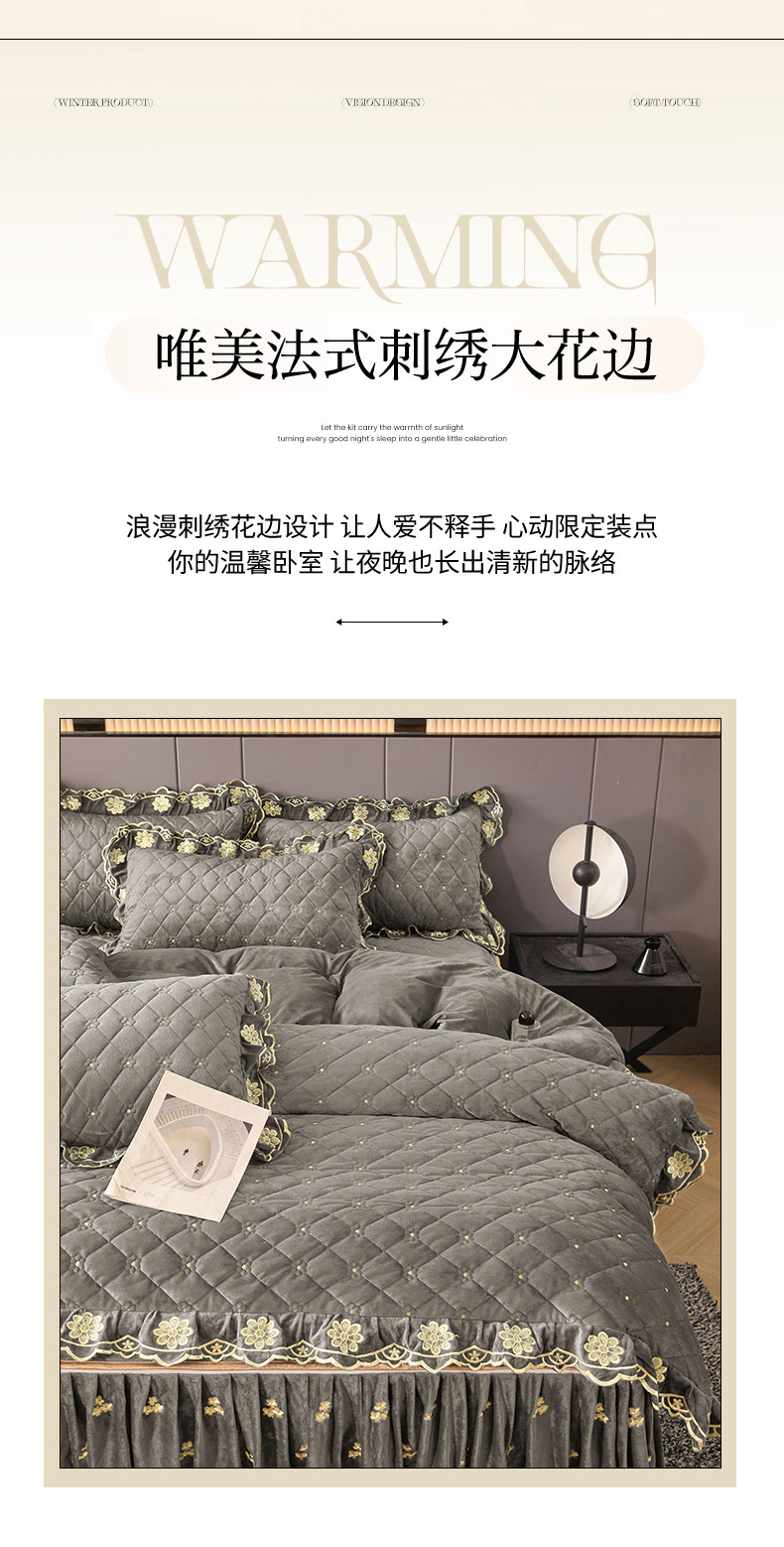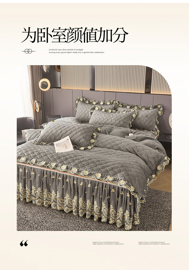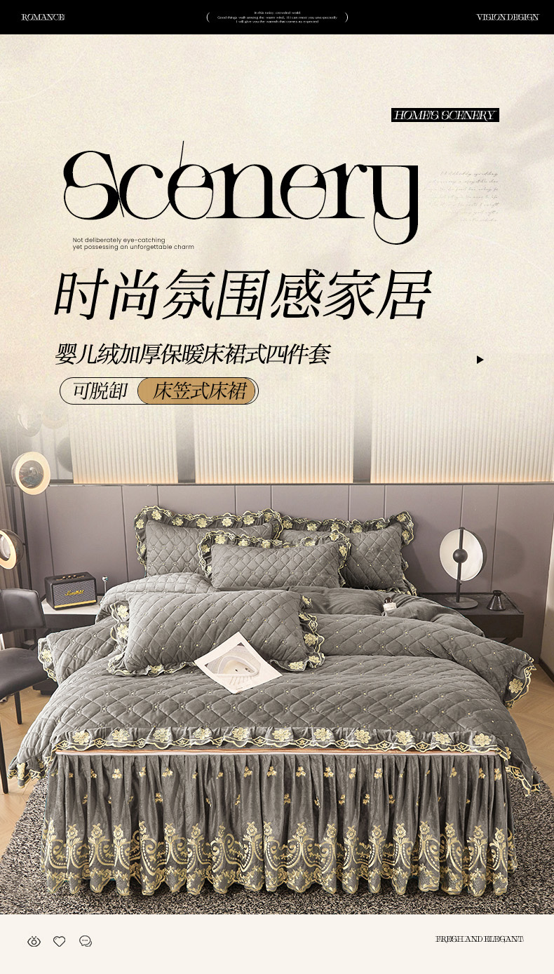 当前位置: 91家纺网 > 商品网购 > 床品套件 > 四件套 > 其它四件套 > 罗艺轩 2025新款婴儿绒加厚保暖床裙式四件套-心语 心语-高级灰