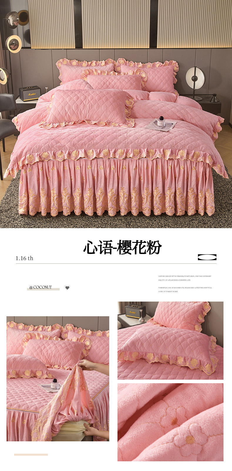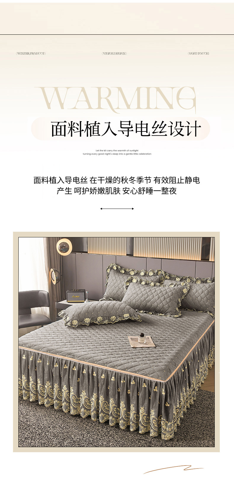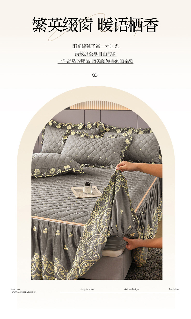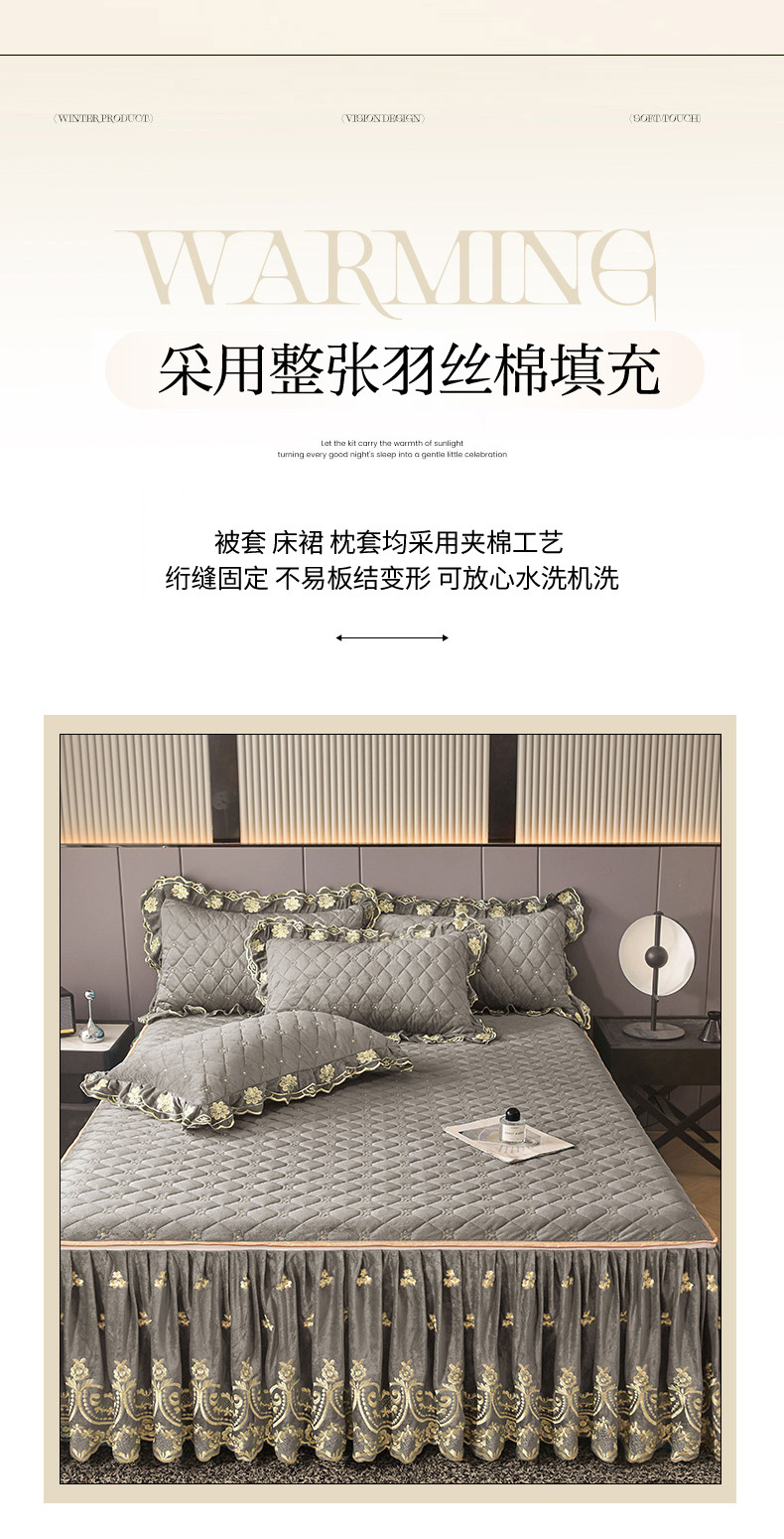 当前位置: 91家纺网 > 商品网购 > 床品套件 > 四件套 > 其它四件套 > 罗艺轩 2025新款婴儿绒加厚保暖床裙式四件套-心语 心语-高级灰