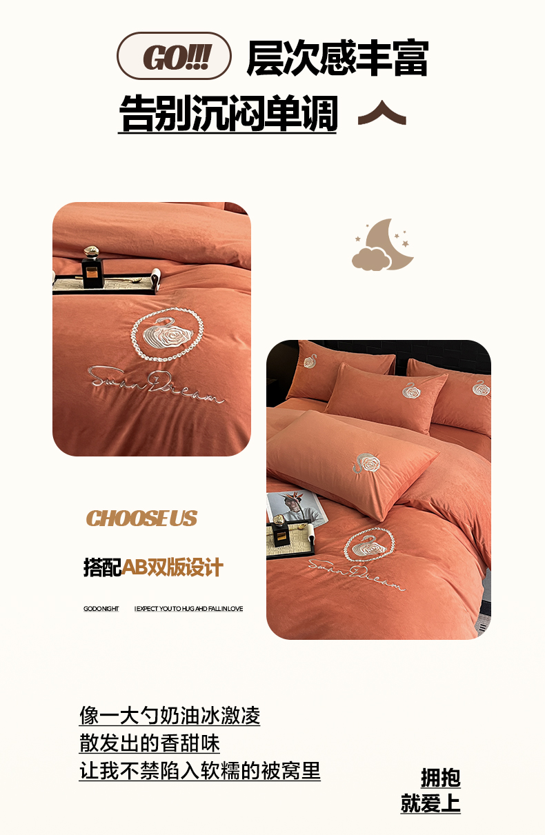 (总)如一 2025新款水晶绒双拼刺绣四件套轻羽系列-系列二,轻羽-典雅灰,轻羽-落日橙,轻羽-奶白咖,轻羽-深灰银,轻羽-雾蓝灰,轻羽-豆沙灰