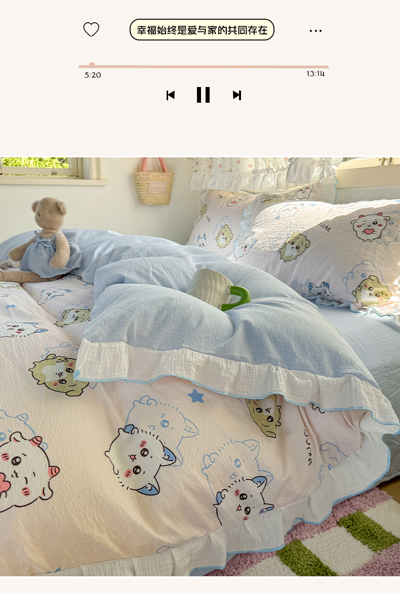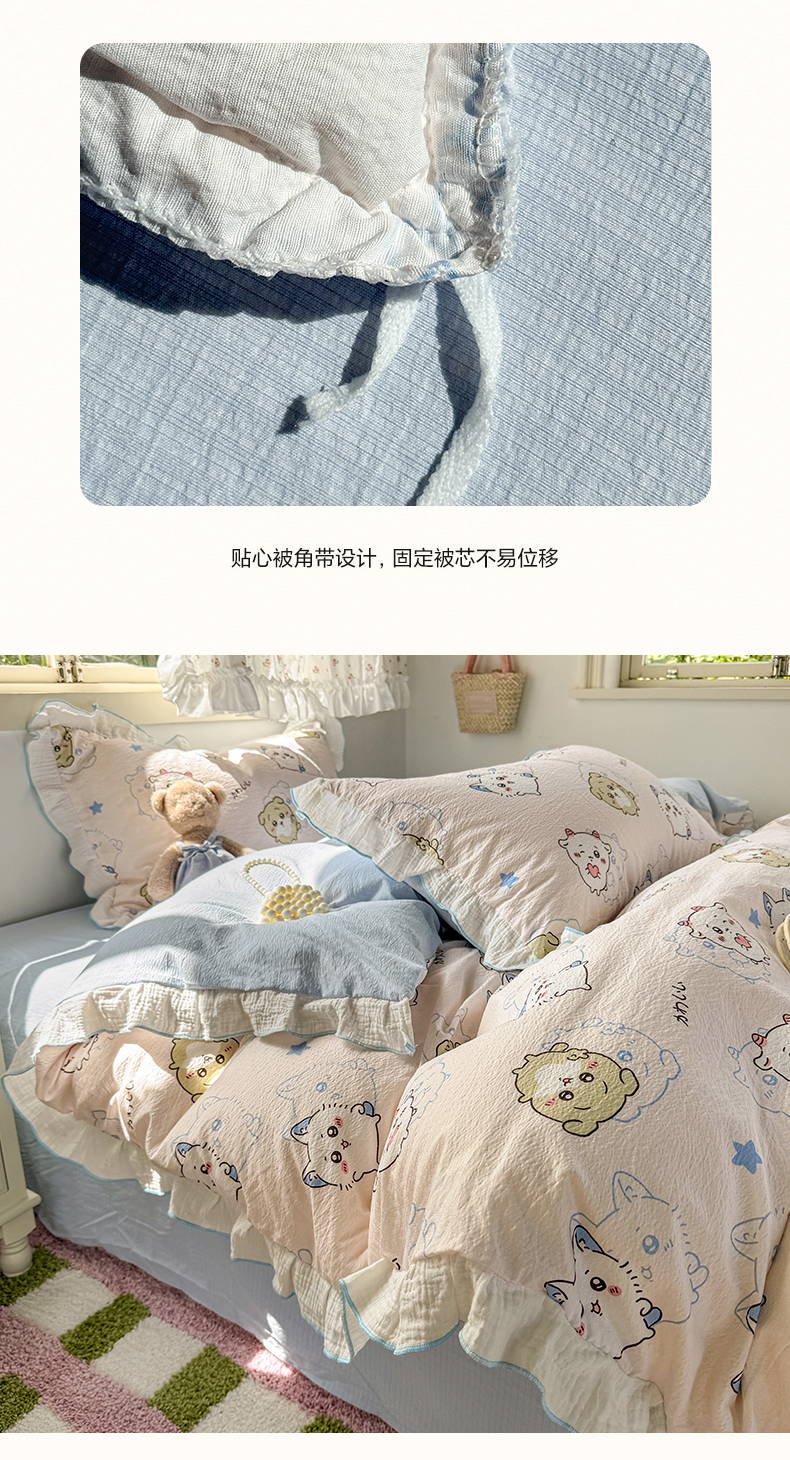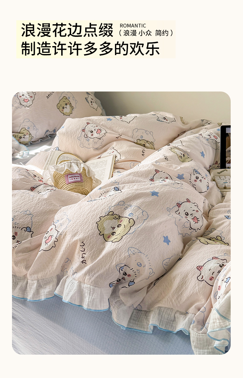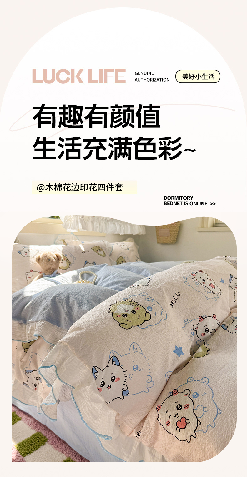 当前位置: 91家纺网 > 商品网购 > 床品套件 > 四件套 > 其它四件套 > 繁花家居 2025新款高弹线云感木棉多层纱花边超软四件套 三小只