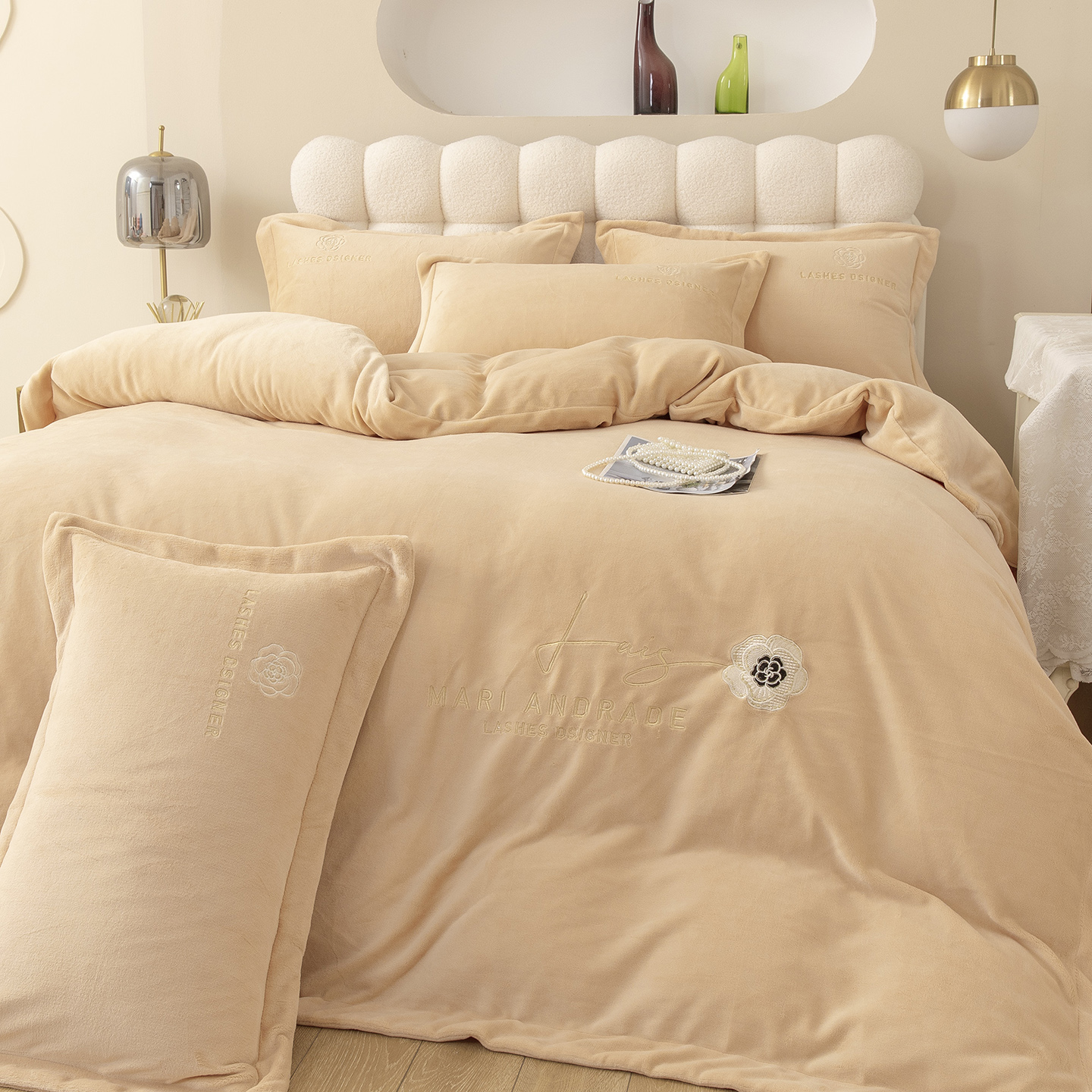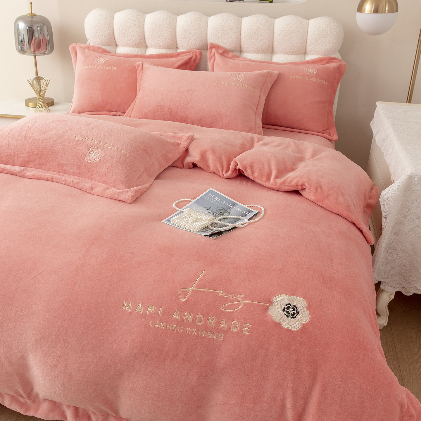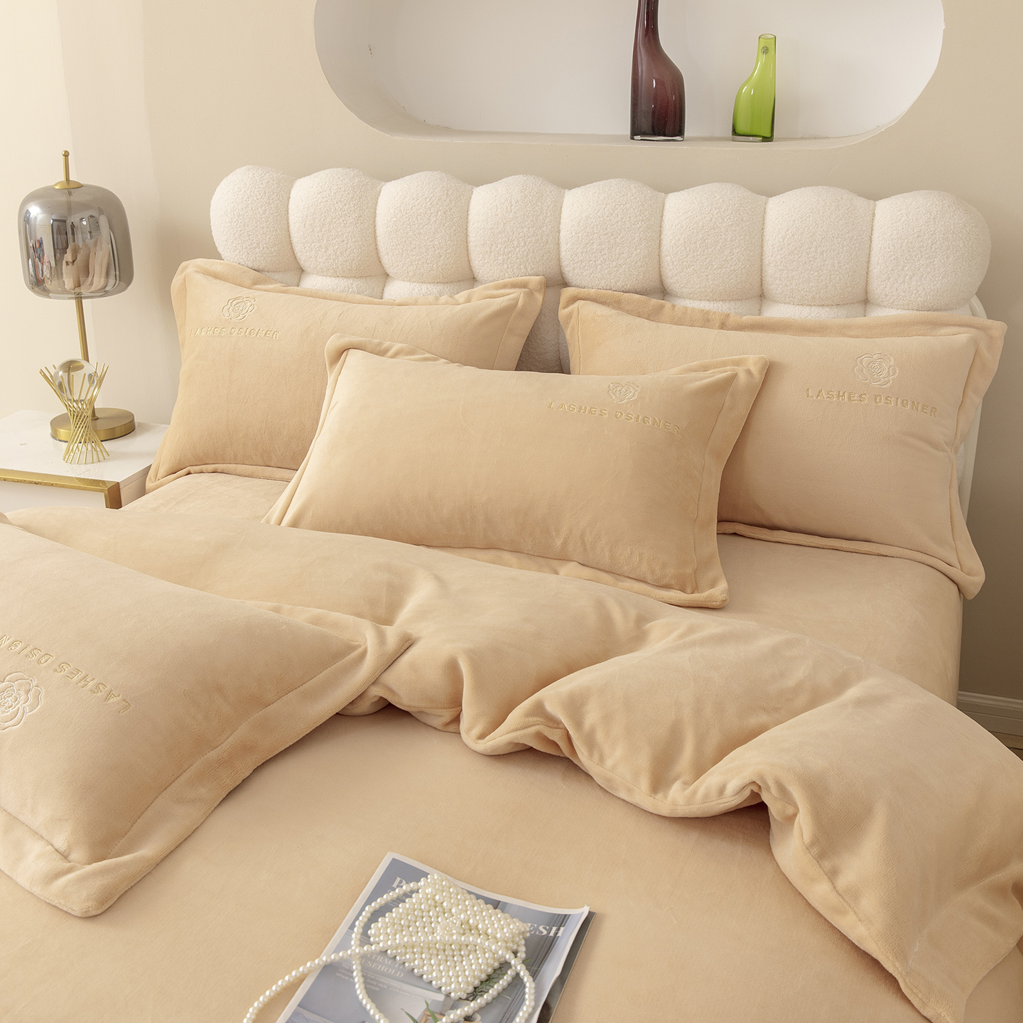 贝尔 2025新款纯色高克重牛奶绒刺绣四件套-羽魅 羽魅-豆沙,羽魅-豆沙