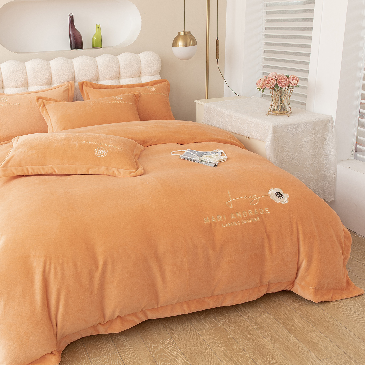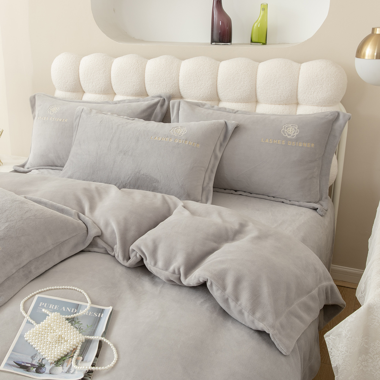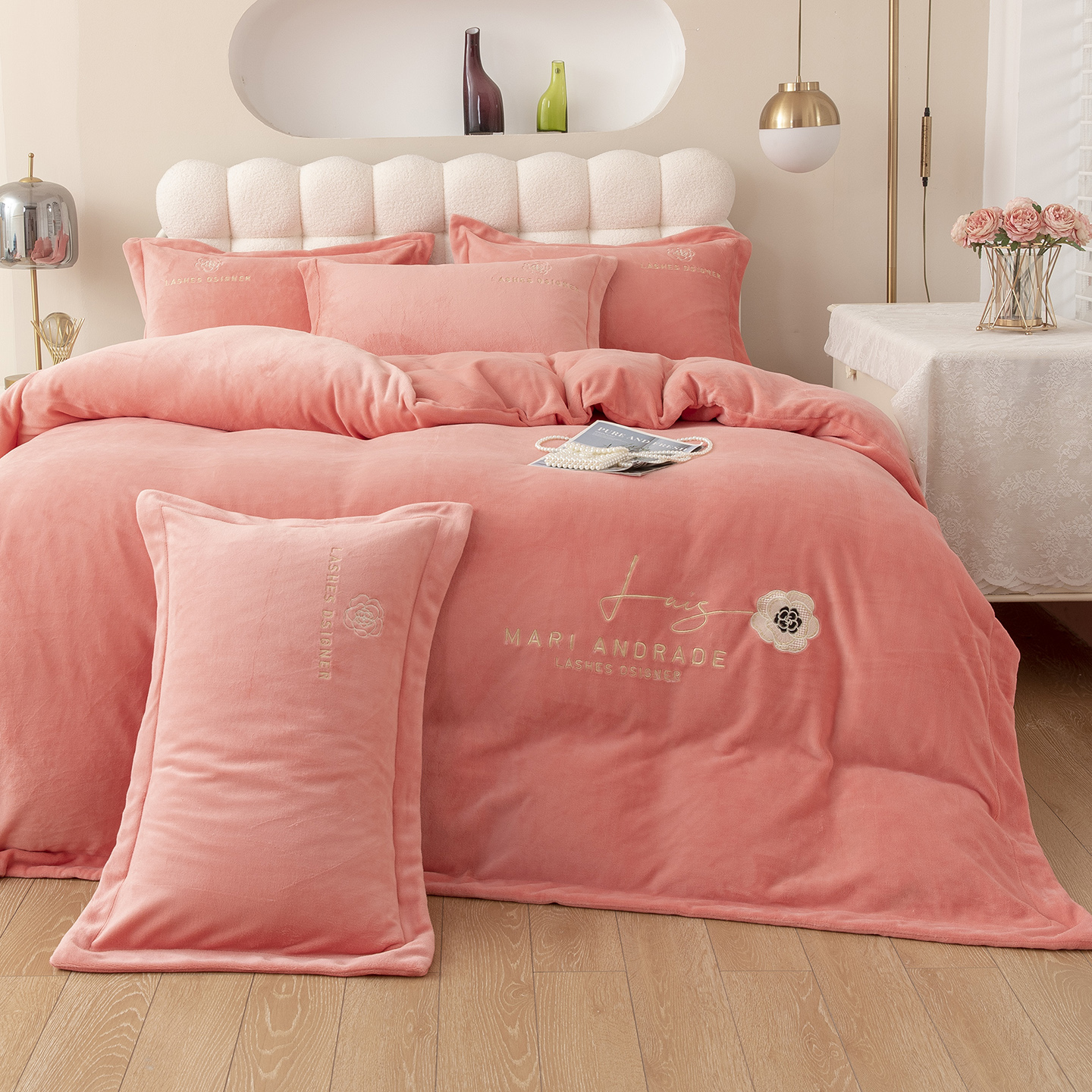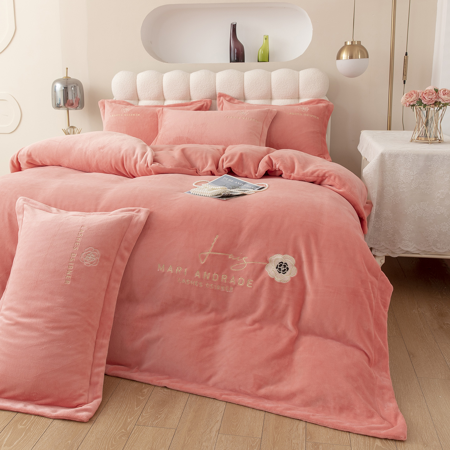 贝尔 2025新款纯色高克重牛奶绒刺绣四件套-羽魅 羽魅-豆沙,羽魅-豆沙