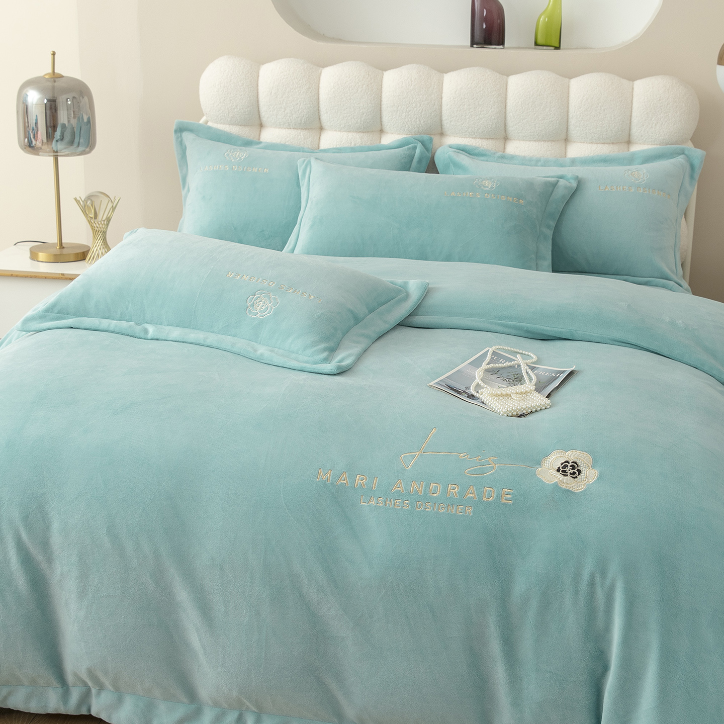 贝尔 2025新款纯色高克重牛奶绒刺绣四件套-羽魅 羽魅-浅绿,羽魅-浅绿