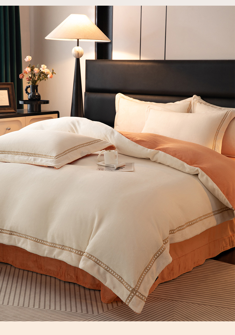(总)暖洋 2025新款240克高克重全工艺纯色织带花边款牛奶绒四件套,枫糖橙,卡其紫,米奇,柔草绿,绅士灰,天空蓝,樱花粉,云锦红
