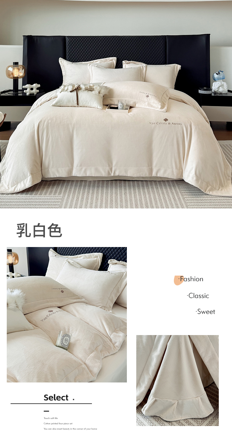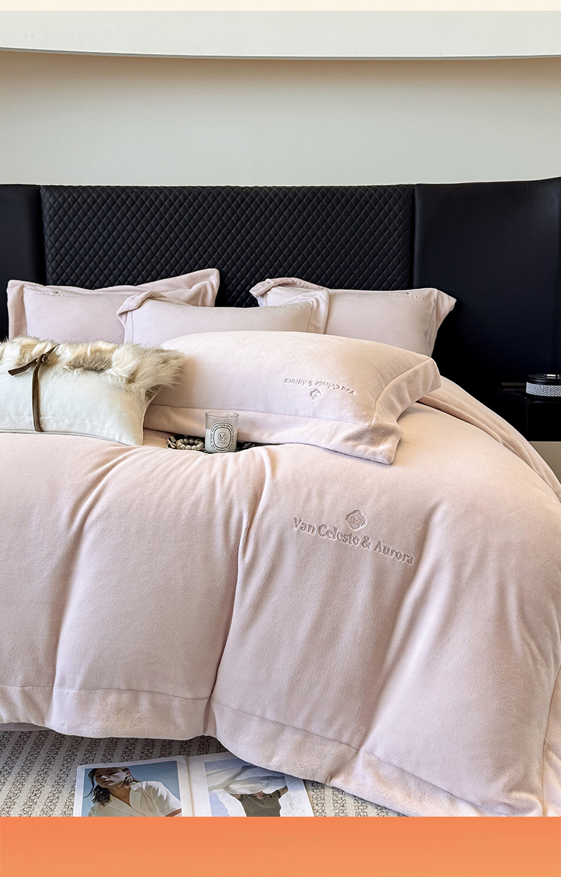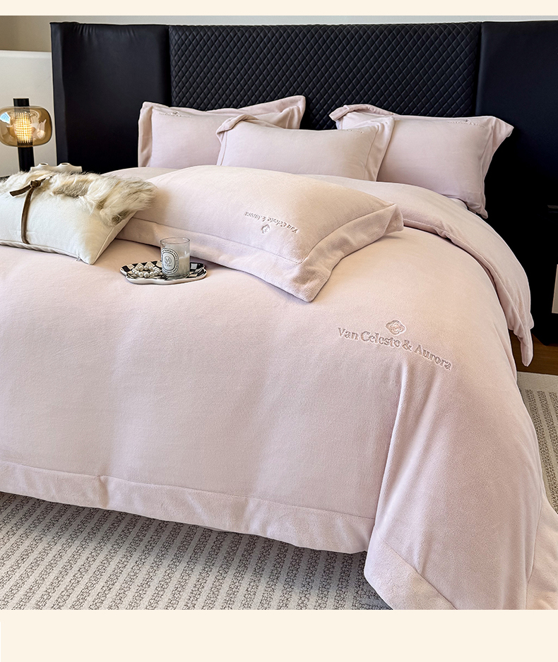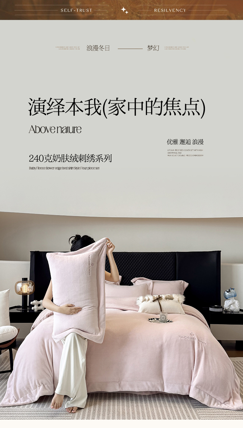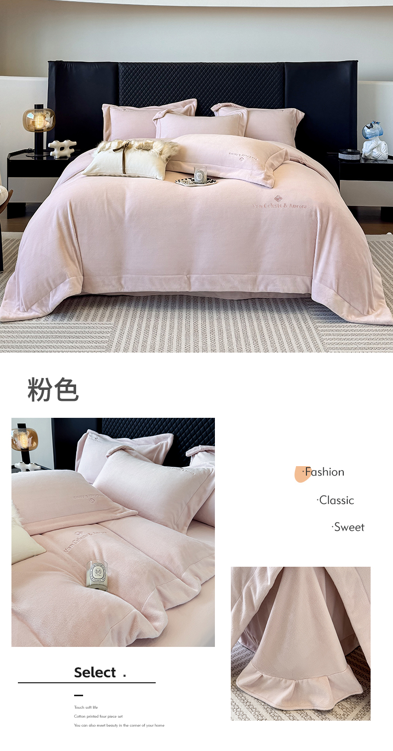 泽西家纺+V17798841158发大图 2025新品秋冬加厚保暖240克奶肤绒简约风刺绣牛奶绒四件套-梵克雅宝 梵克雅宝-粉色