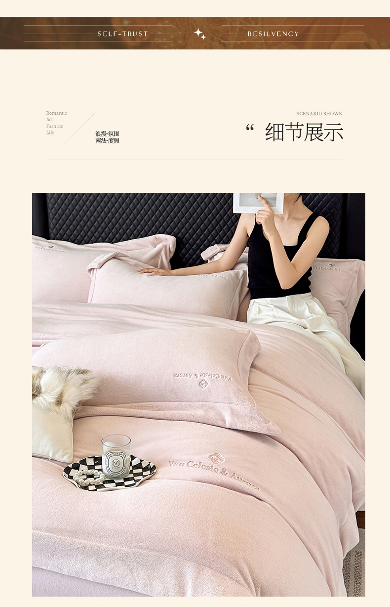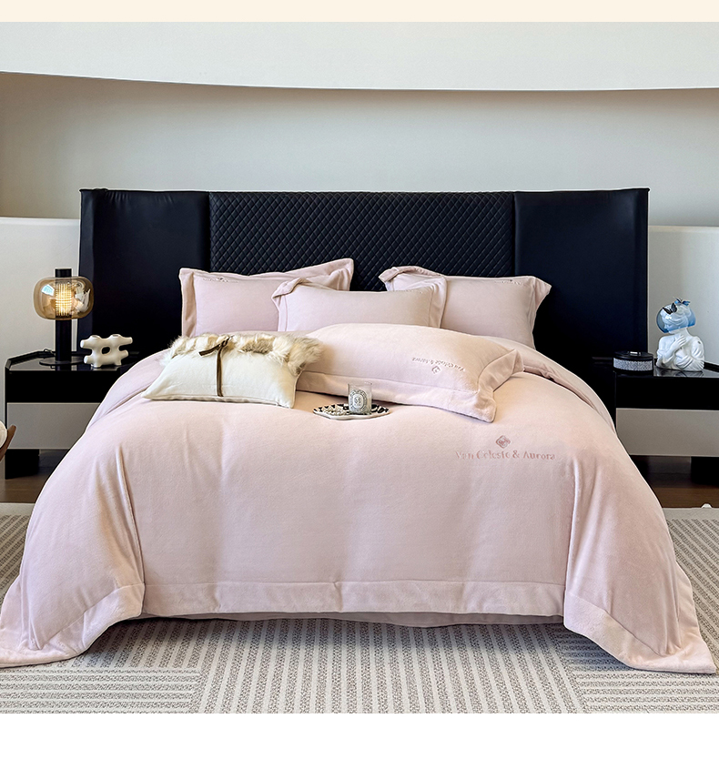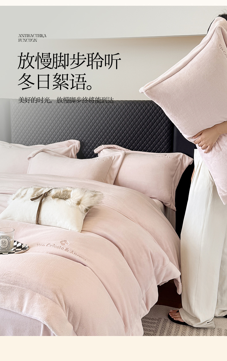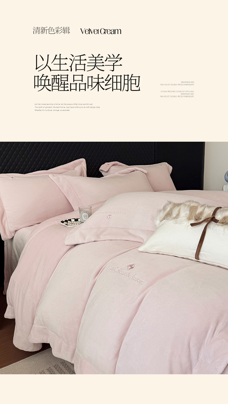 商品名称:泽西家纺+V17798841158发大图 2025新品秋冬加厚保暖240克奶肤绒简约风刺绣牛奶绒四件套-梵克雅宝 梵克雅宝-粉色