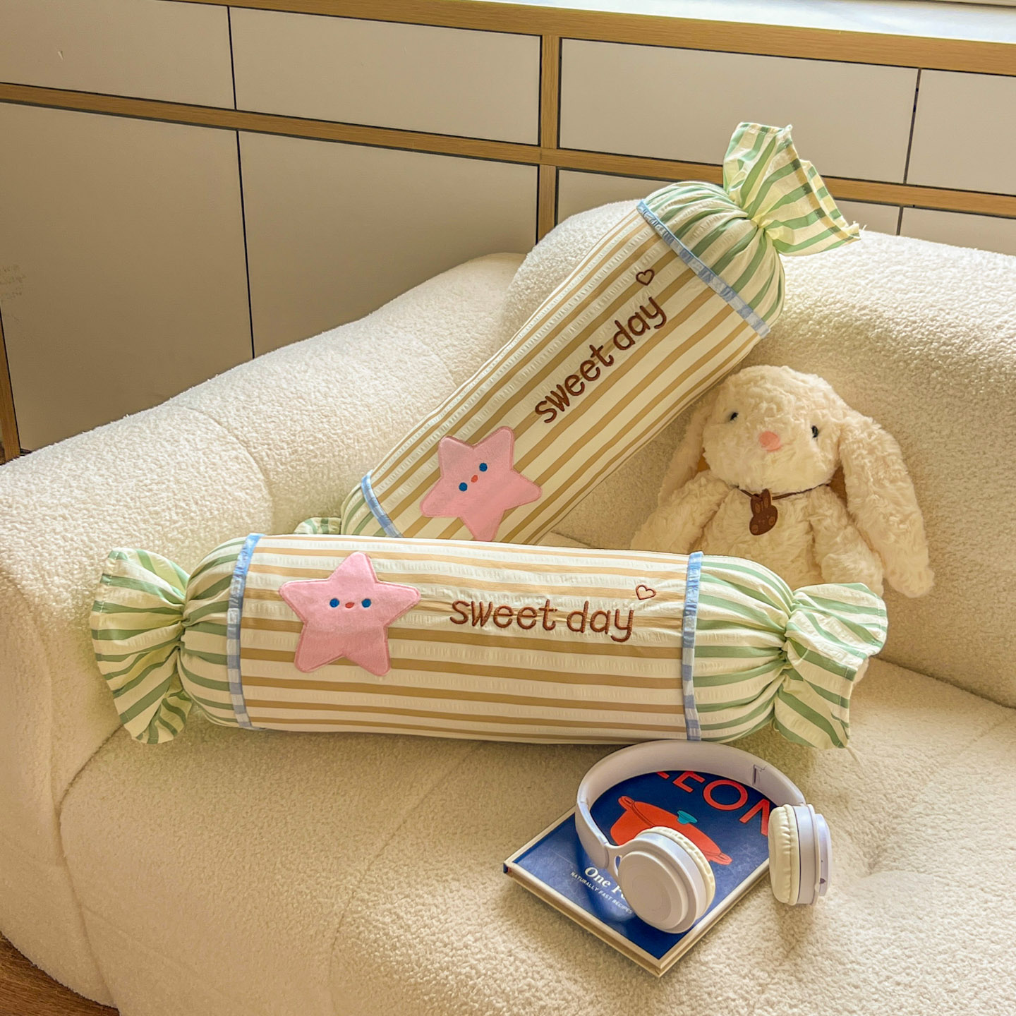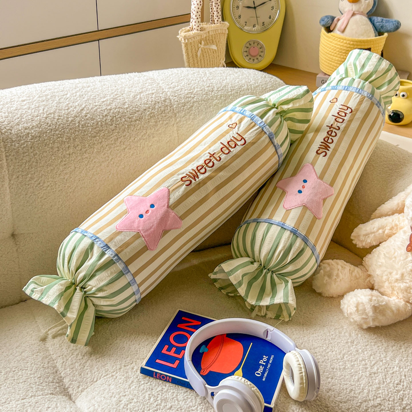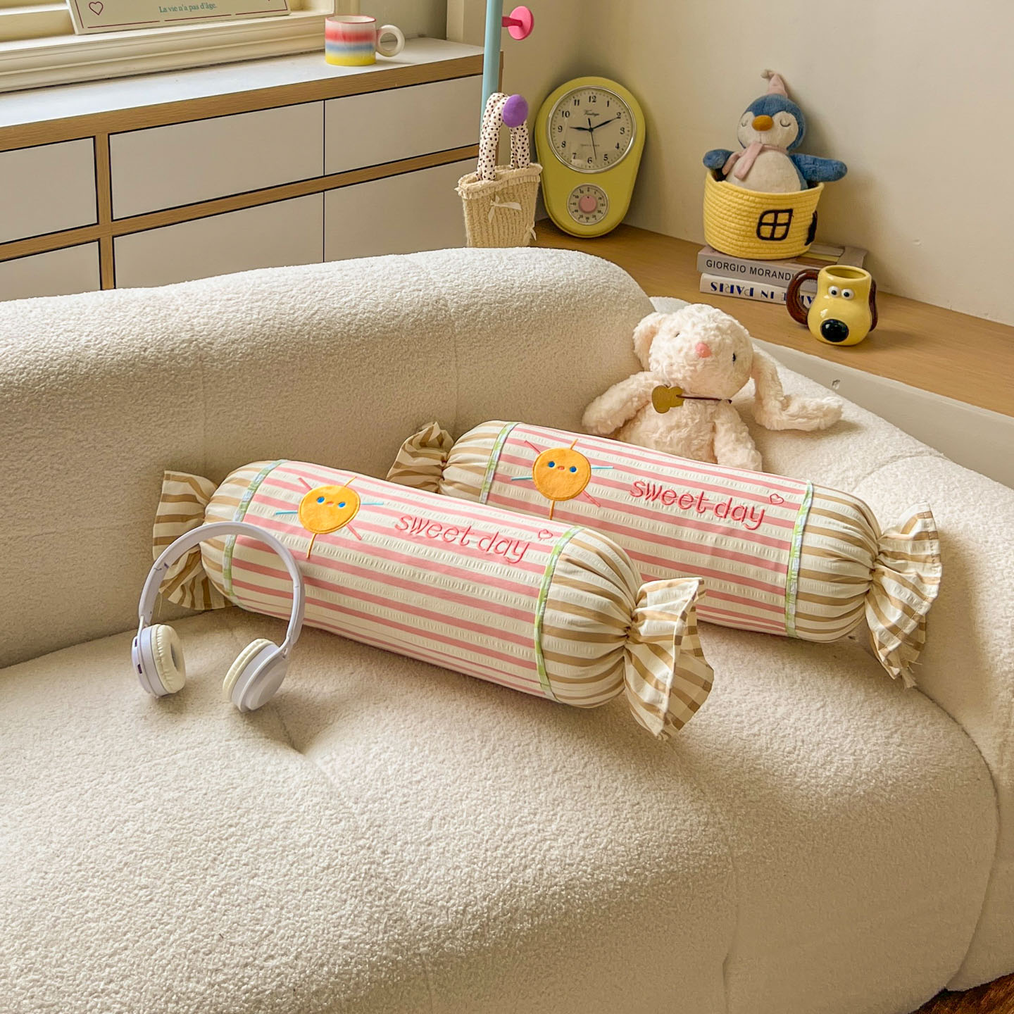 (总)希诺家居 2025新款ins奶油风奶糖枕糖果枕头枕芯,粉条纹太阳,黄条纹星星,蓝条纹云朵,绿条纹月亮,组合图
