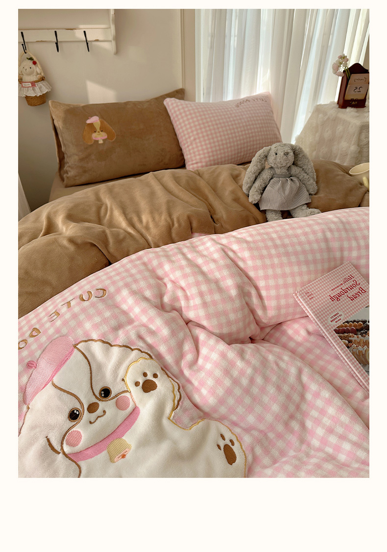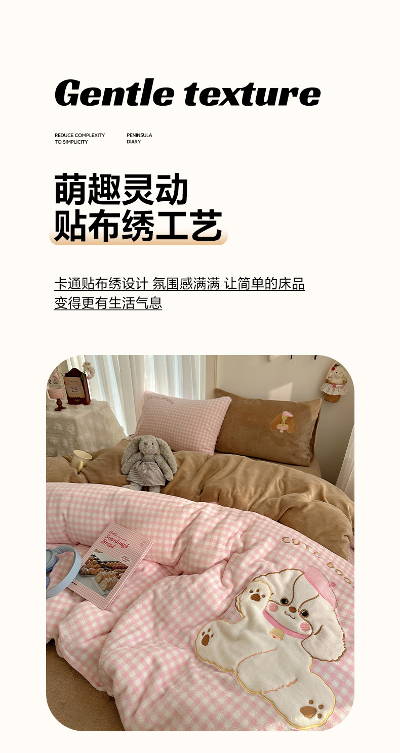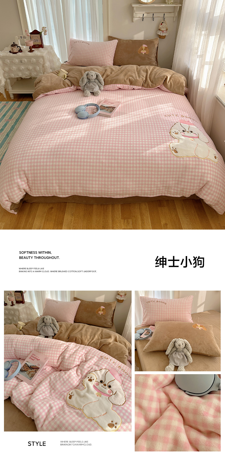 当前位置: 91家纺网 > 商品网购 > 床品套件 > 四件套 > 牛奶绒四件套 > 韩都家居 2025新款卡通贴布绣系列加厚牛奶绒四件套 绅士小狗