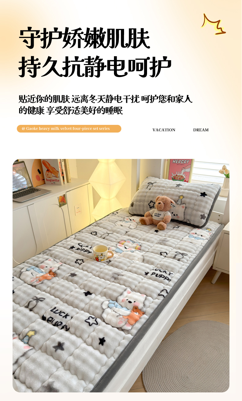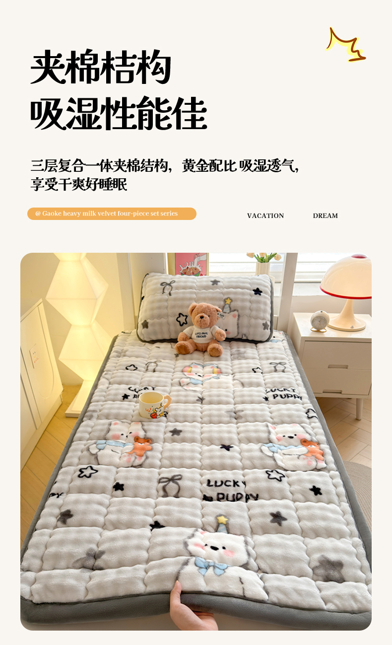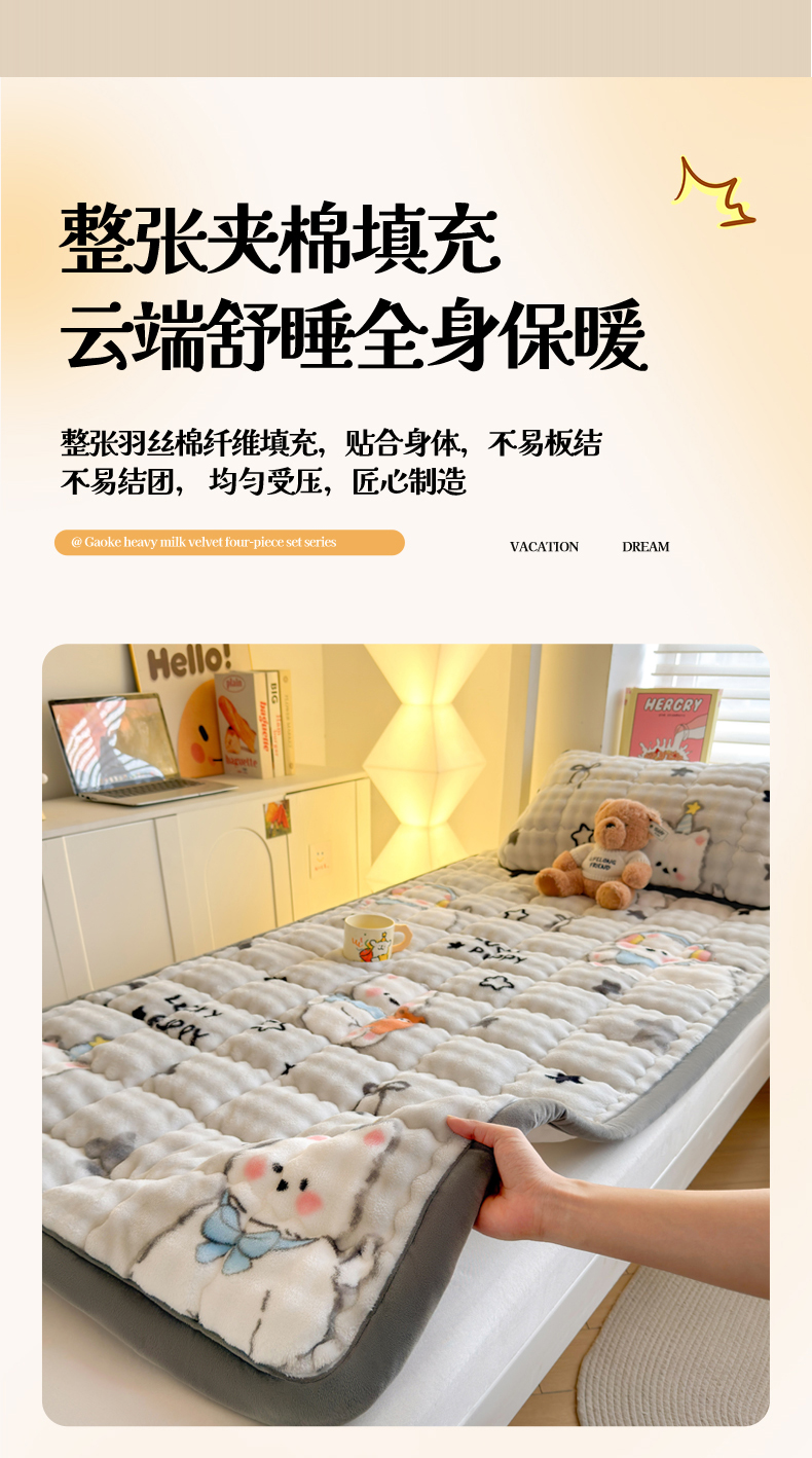 (总)奇丝雅 2025新款A类牛奶绒泡泡绒床褥床垫床盖兔毛绒家用学生宿舍上下铺寝室褥子软垫床护垫夹棉(大床)场景二,星星猫咪,月亮湾,趴趴狗,繁星,爱心咖,樱桃猫咪,幻影灰,暖绒蓝,清新绿,柔和蓝