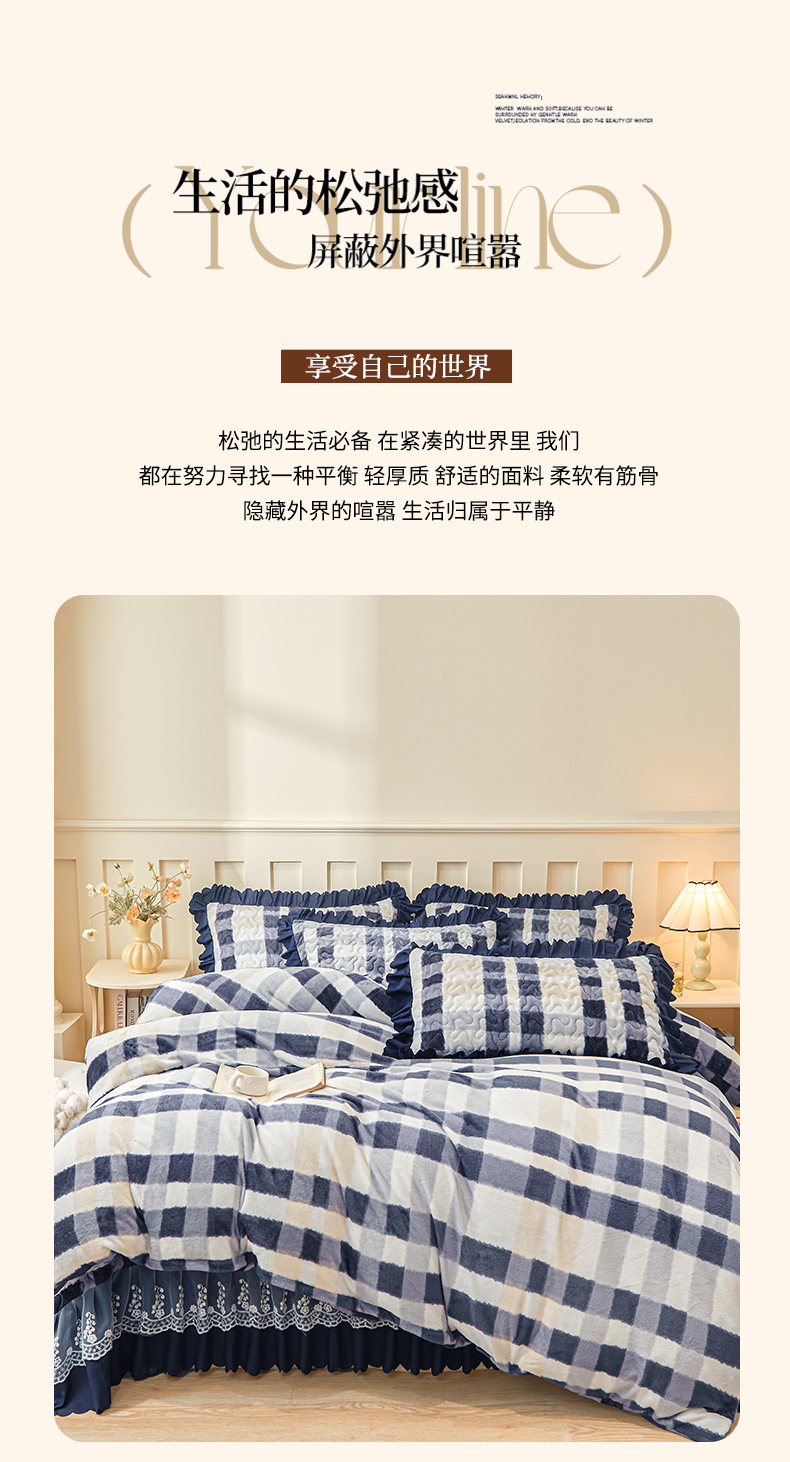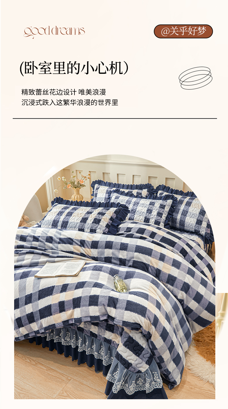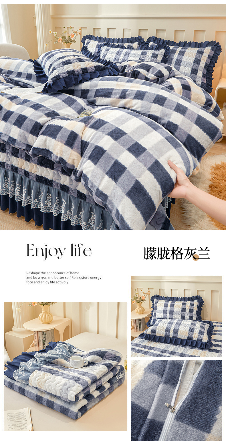 当前位置: 91家纺网 > 商品网购 > 床品套件 > 四件套 > 牛奶绒四件套 > 艾裙海 2025新款蕾丝边牛奶绒床盖四件套 朦胧格灰兰