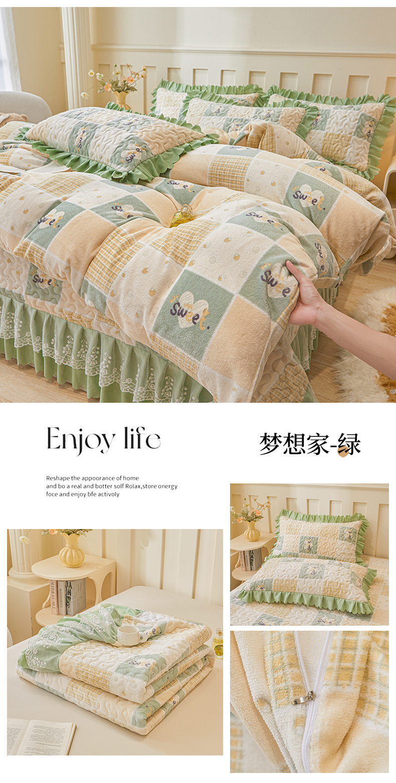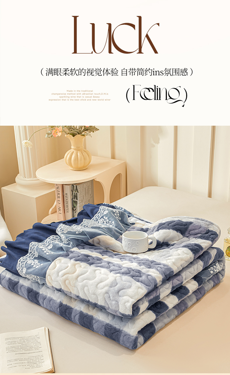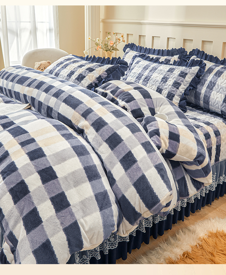 当前位置: 91家纺网 > 商品网购 > 床品套件 > 四件套 > 牛奶绒四件套 > 艾裙海 2025新款蕾丝边牛奶绒床盖四件套 朦胧格灰兰