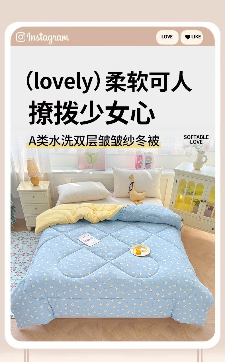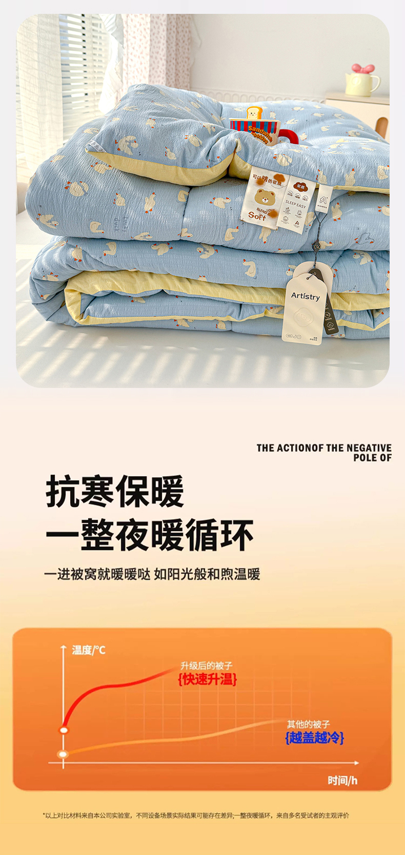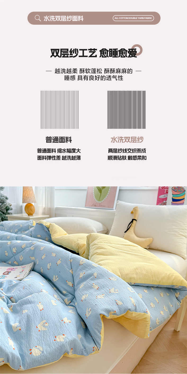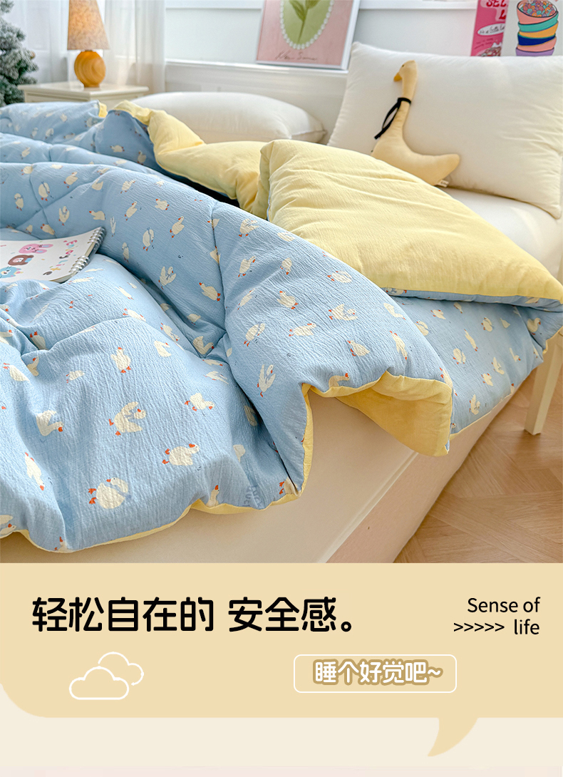 • 91家纺网 家纺一手货源 找家纺 桔禾家纺 2026新款云感有氧双层纱冬被抗菌被春秋被被子被芯 A类水洗双层皱皱纱冬被-鹅鹅鹅