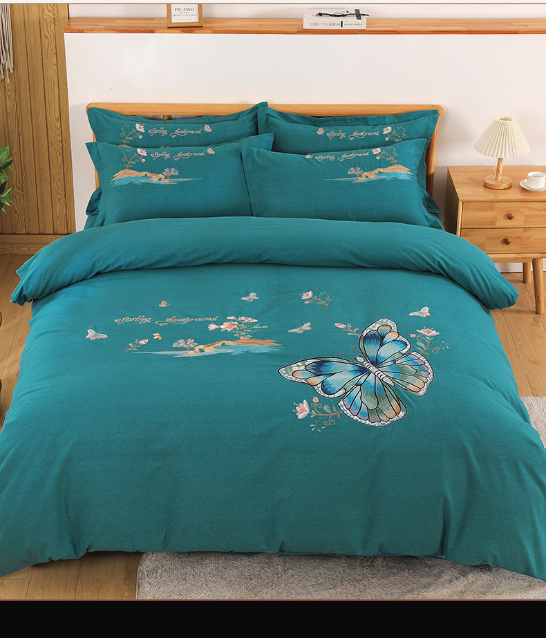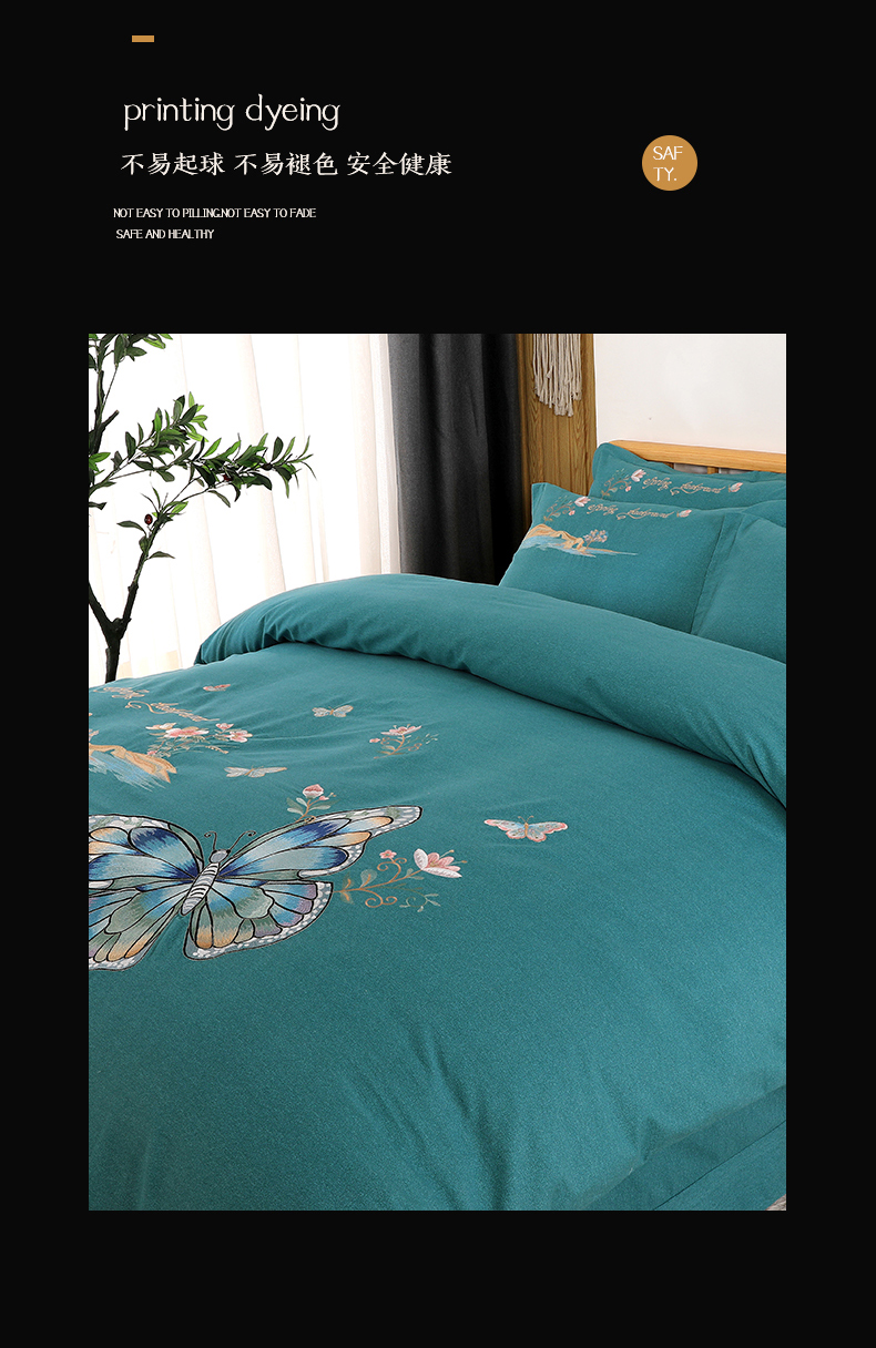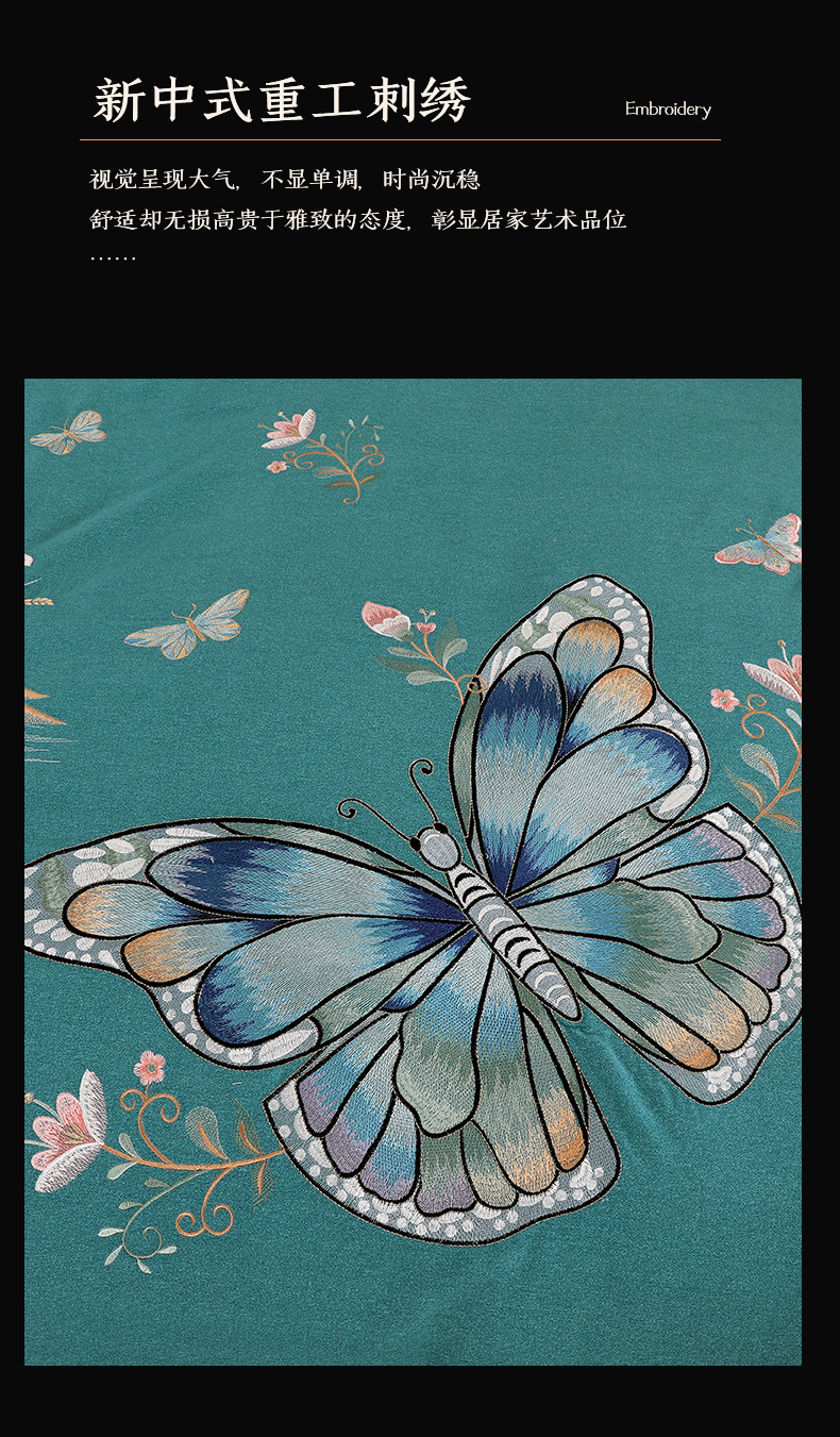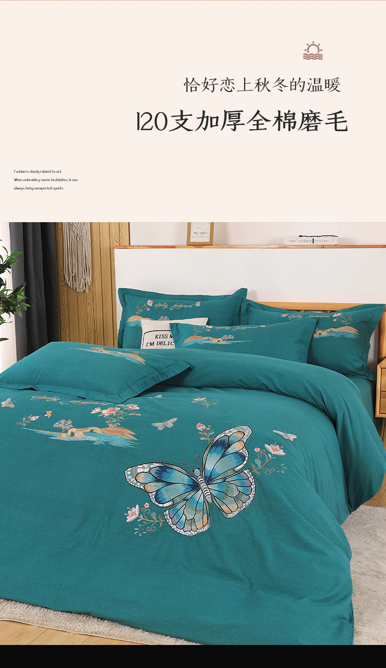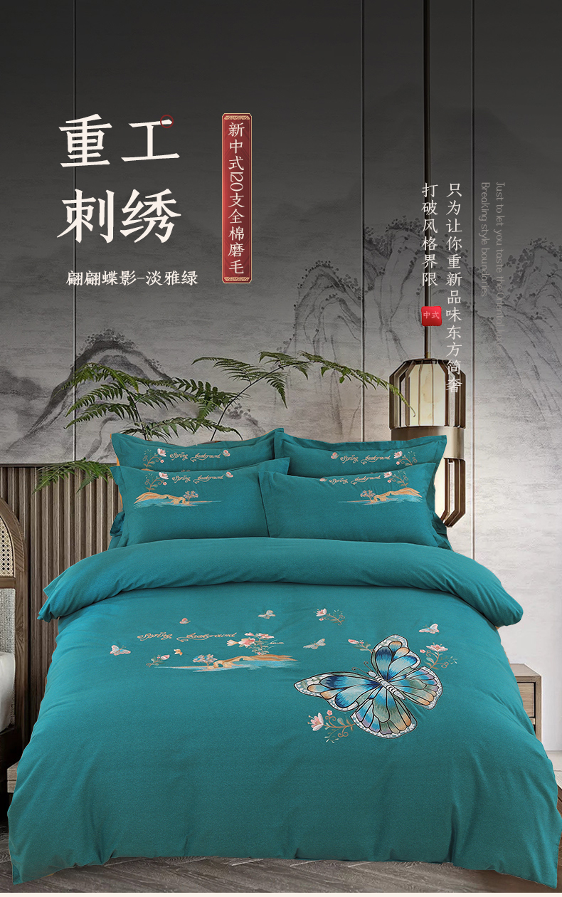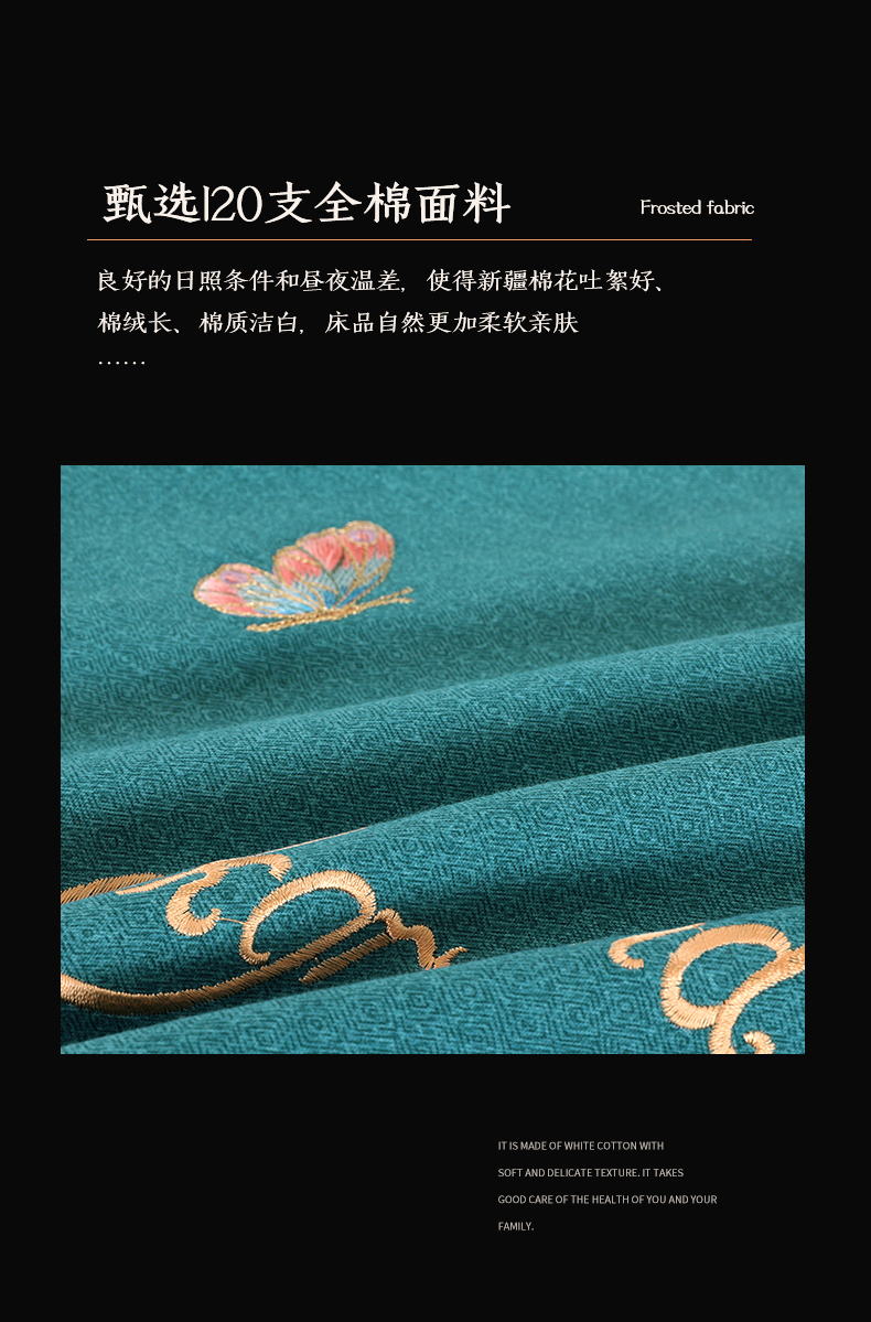 商品名称:浩情国际婚庆供货中心 2026新款秋冬60S高端全棉刺绣磨毛系列 翩翩蝶影-淡雅绿
