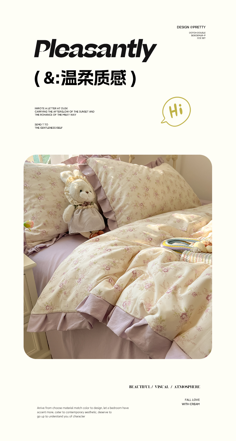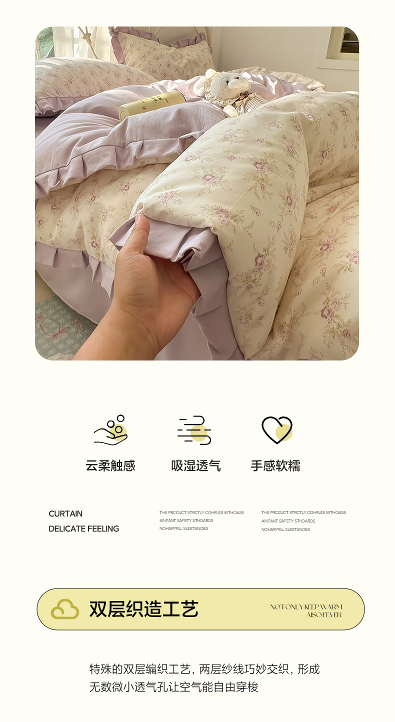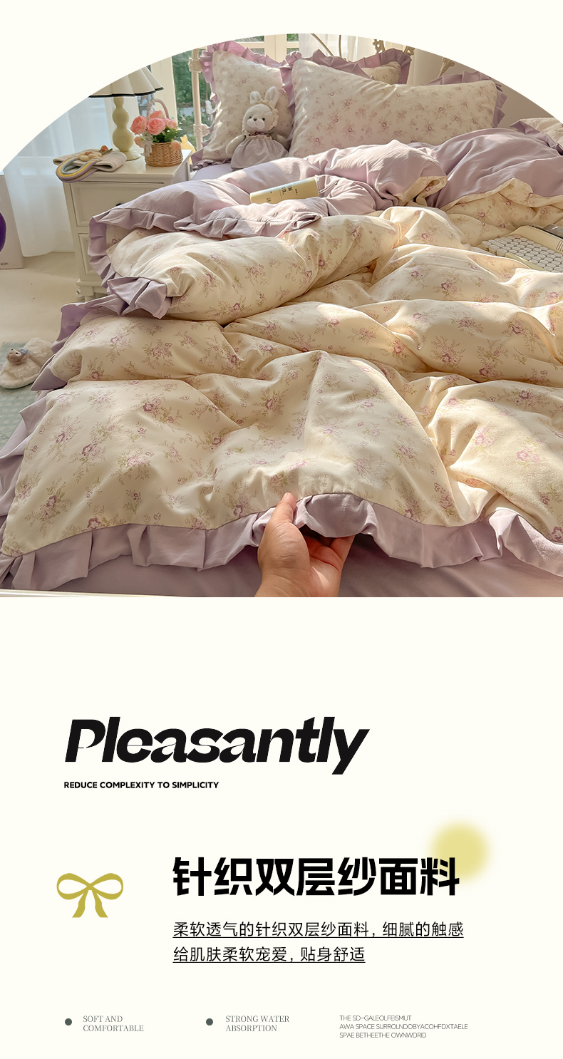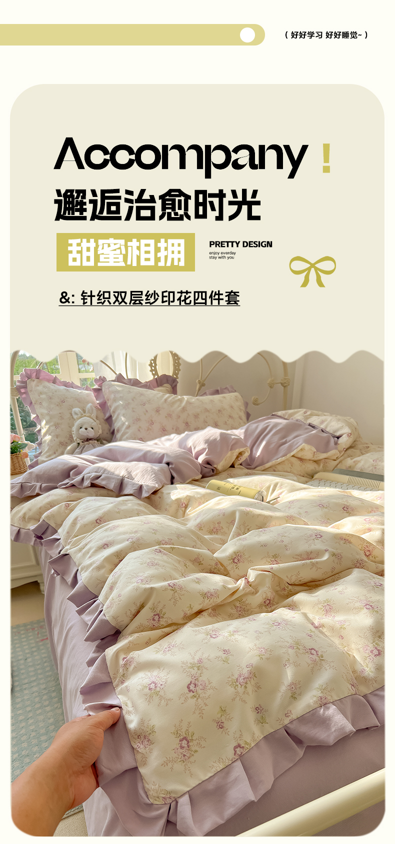 当前位置: 91家纺网 > 商品网购 > 床品套件 > 四件套 > 双层纱四件套 > 韩巢家纺 2026新款花边款针织双层纱四件套 春意花开