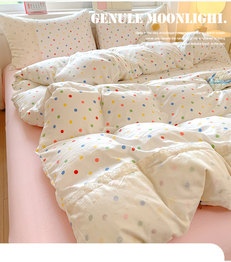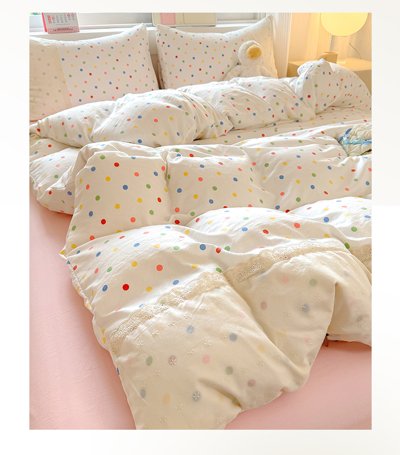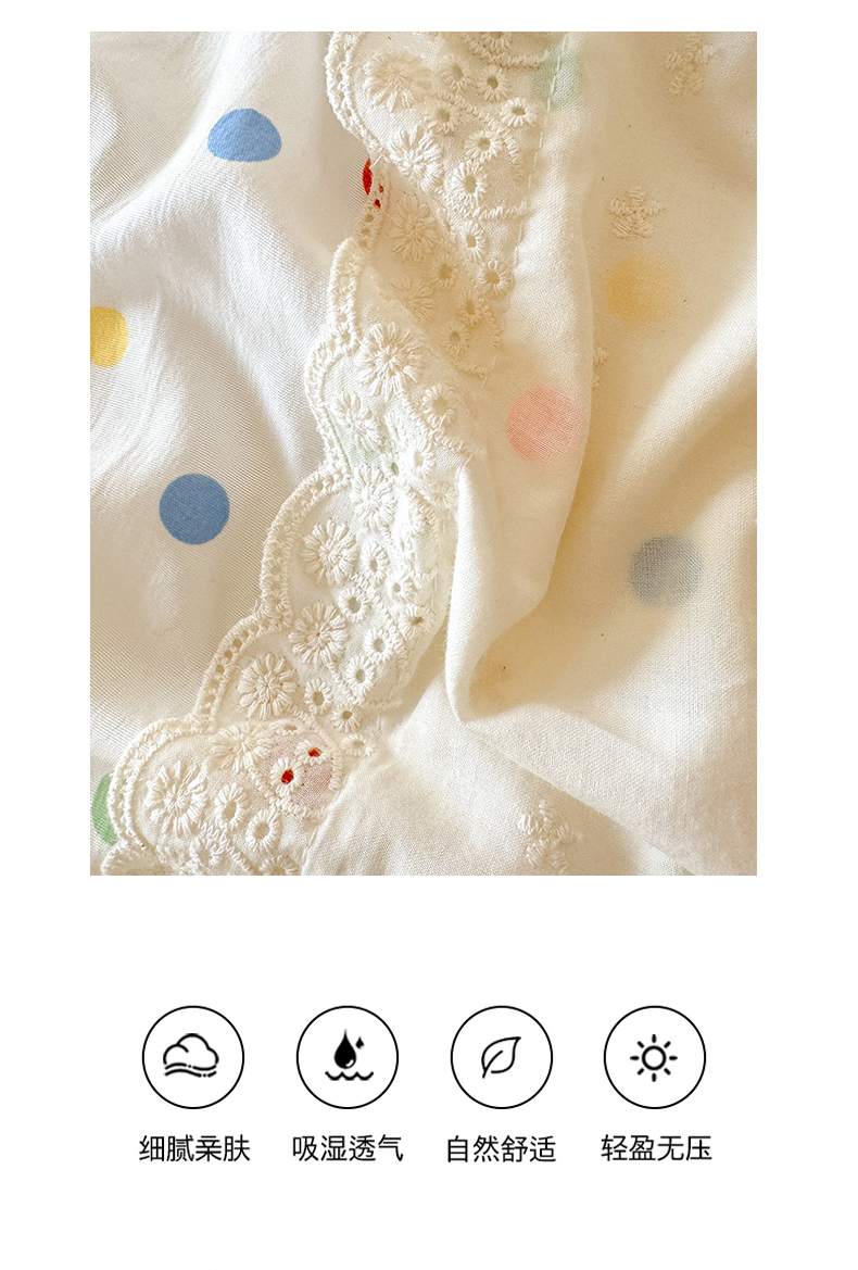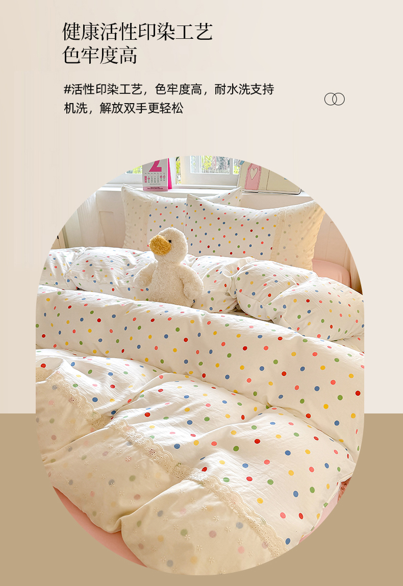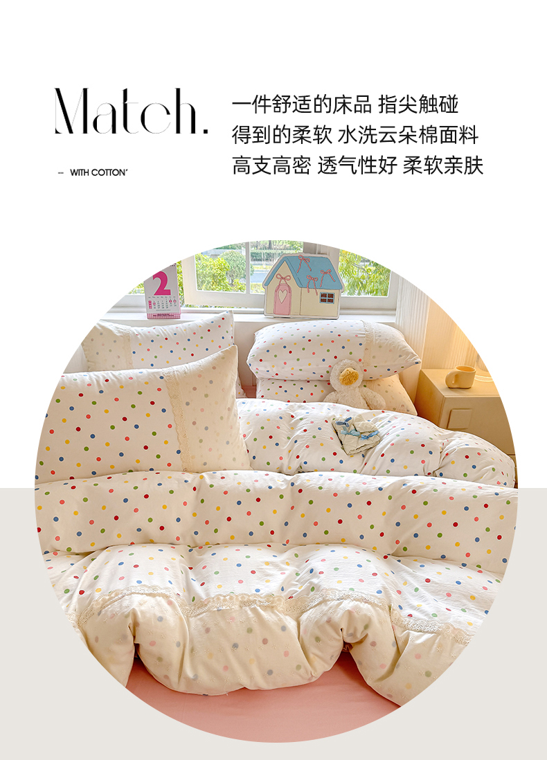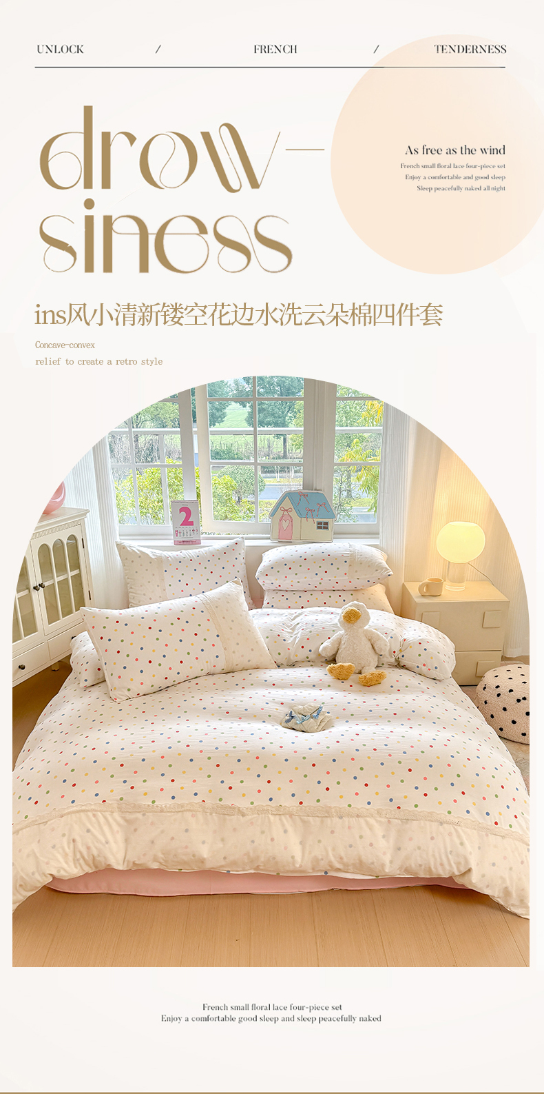 当前位置: 91家纺网 > 商品网购 > 床品套件 > 四件套 > 水洗棉四件套 > 温眠家纺 2025新款ins风小清新镂空花边水洗云朵棉四件套-风格一 奶油波点