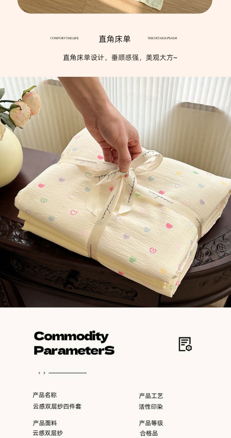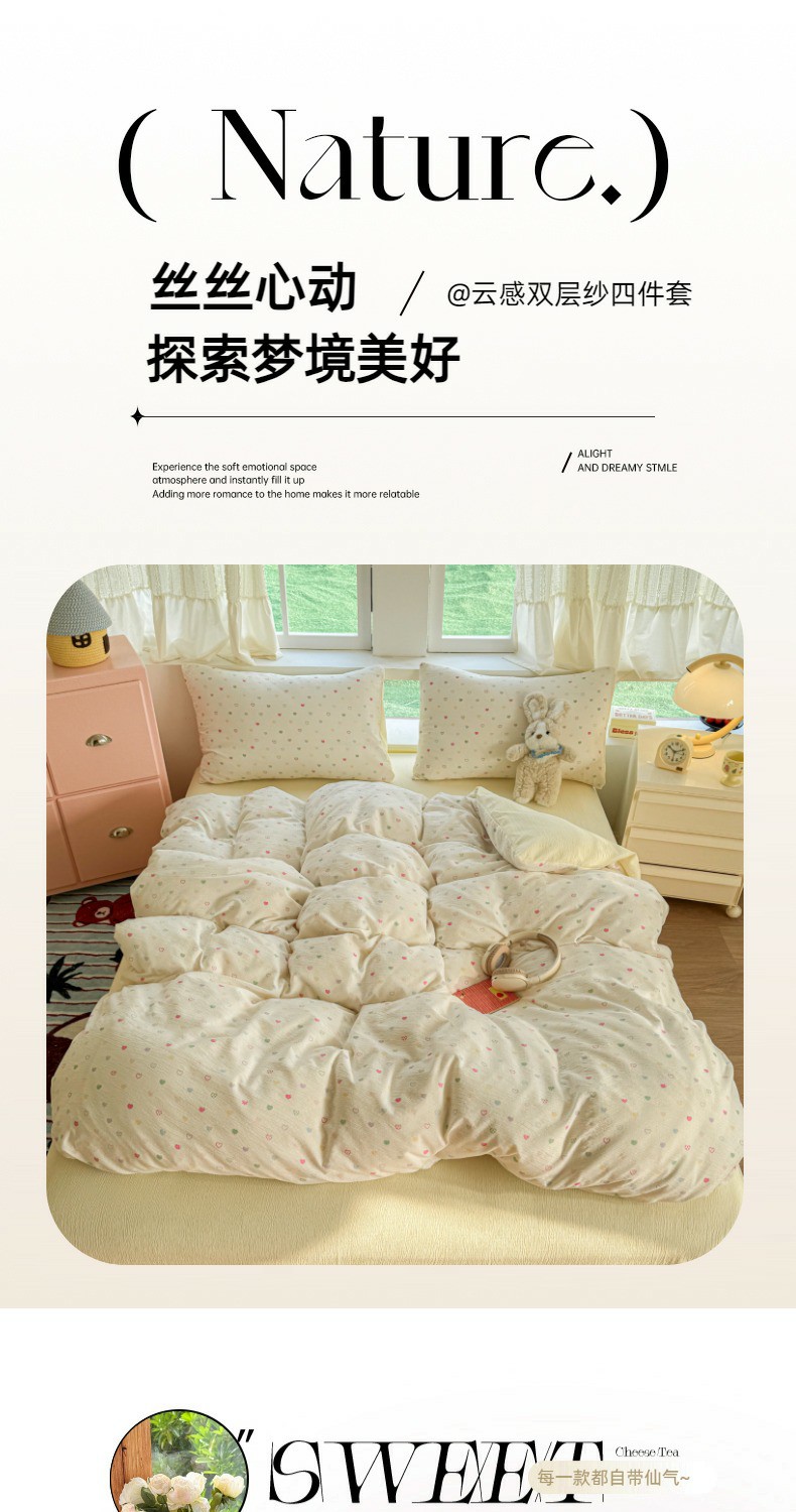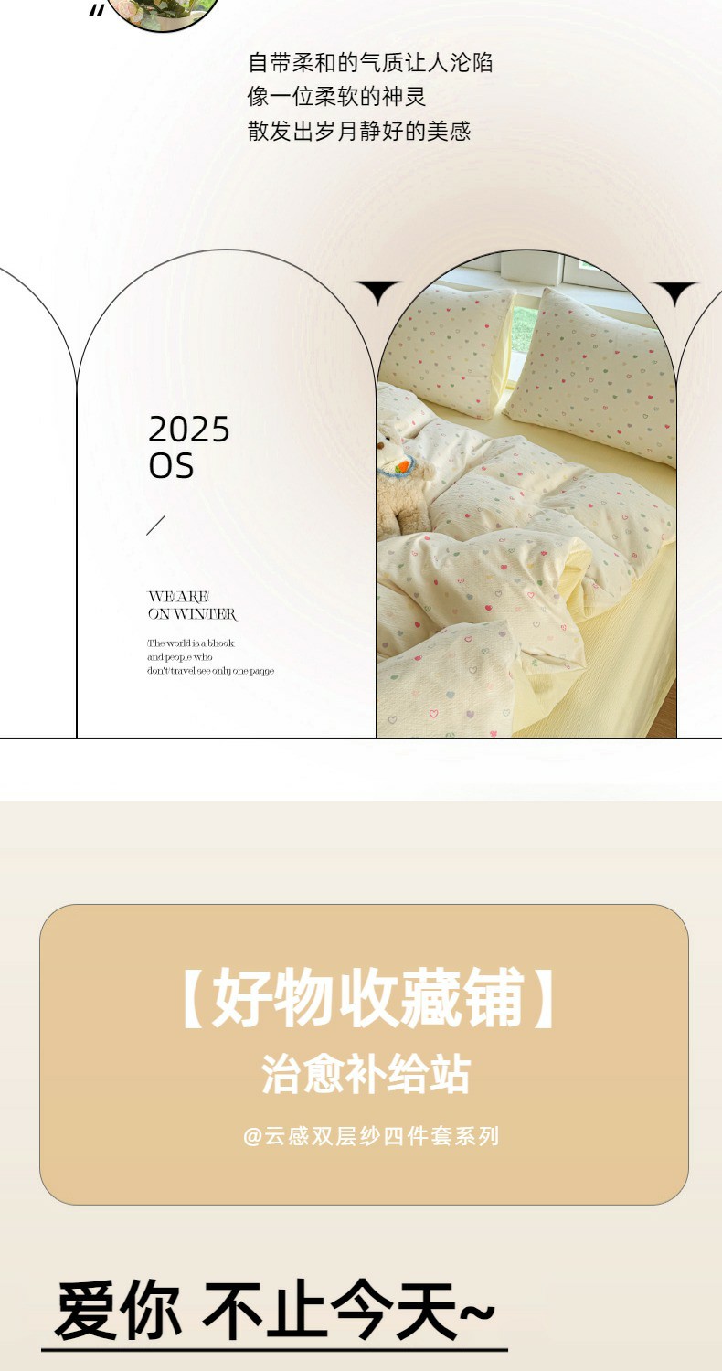 当前位置: 91家纺网 > 商品网购 > 床品套件 > 四件套 > 双层纱四件套 > 温眠家纺 2025新款云感针织双层纱四件套 浪漫邂逅