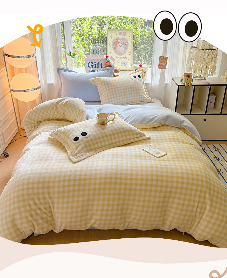 商品名称:温眠家纺 2025新款ins加厚毛巾绣大眼睛混搭撞色奶油格子牛奶绒四件套 绒-黄格天蓝