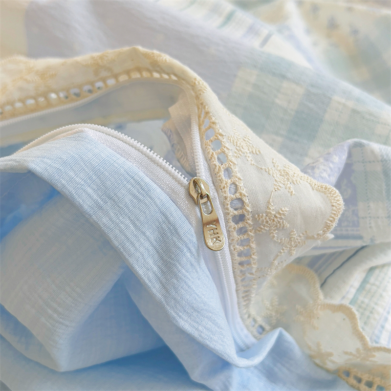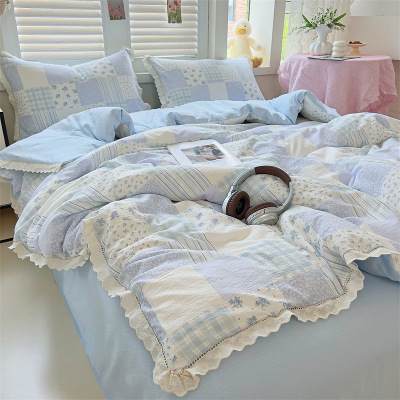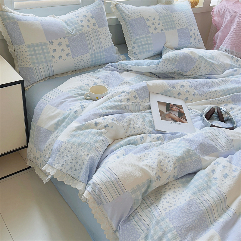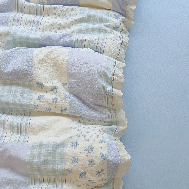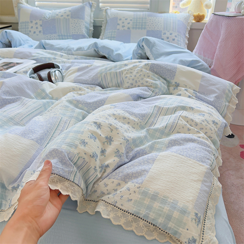 商品名称:壹号库家纺 2026新款云感木棉皱皱纱双层纱四件套-全棉花边款 百福(兰)
