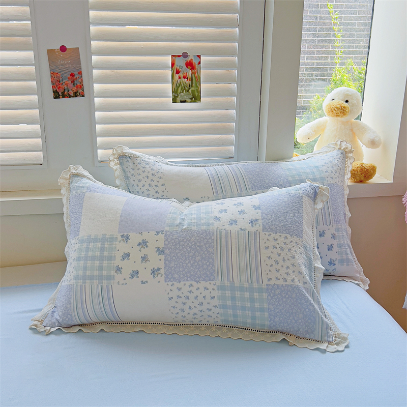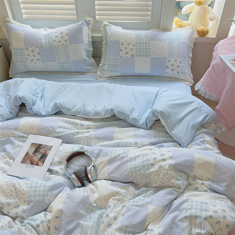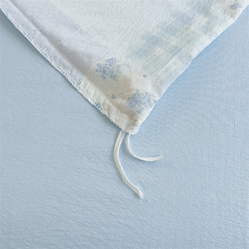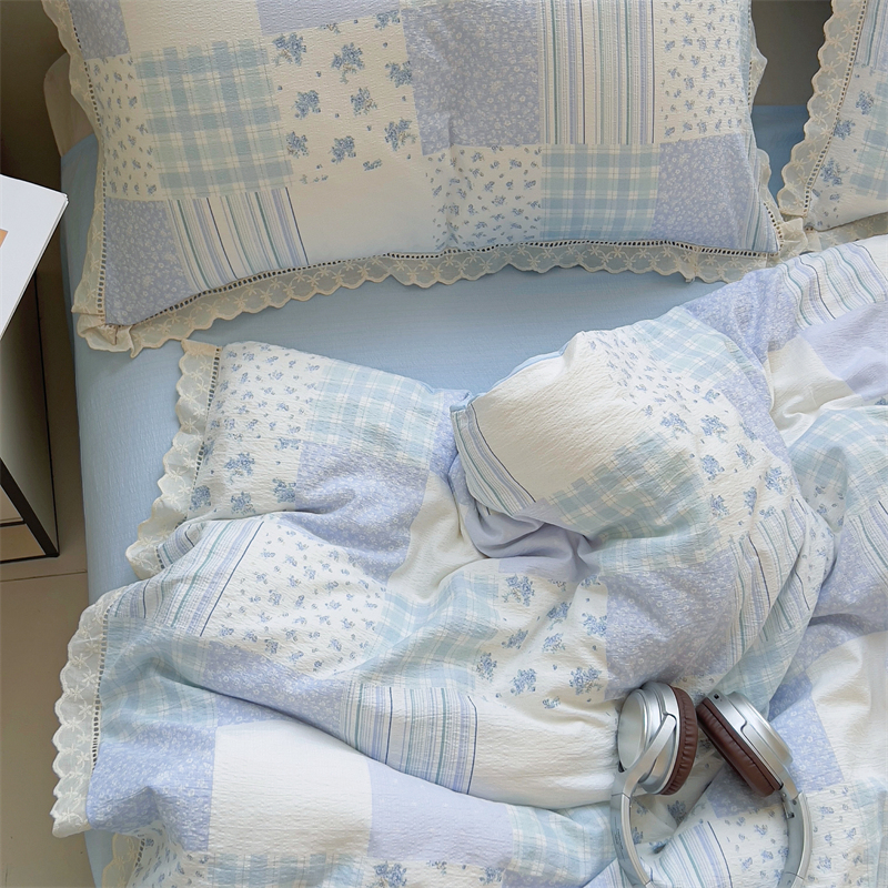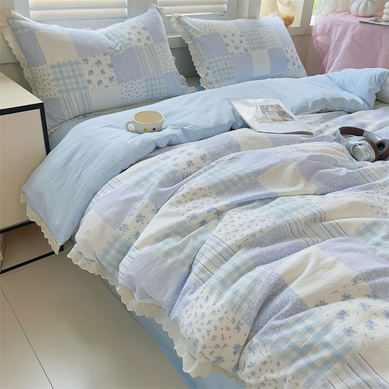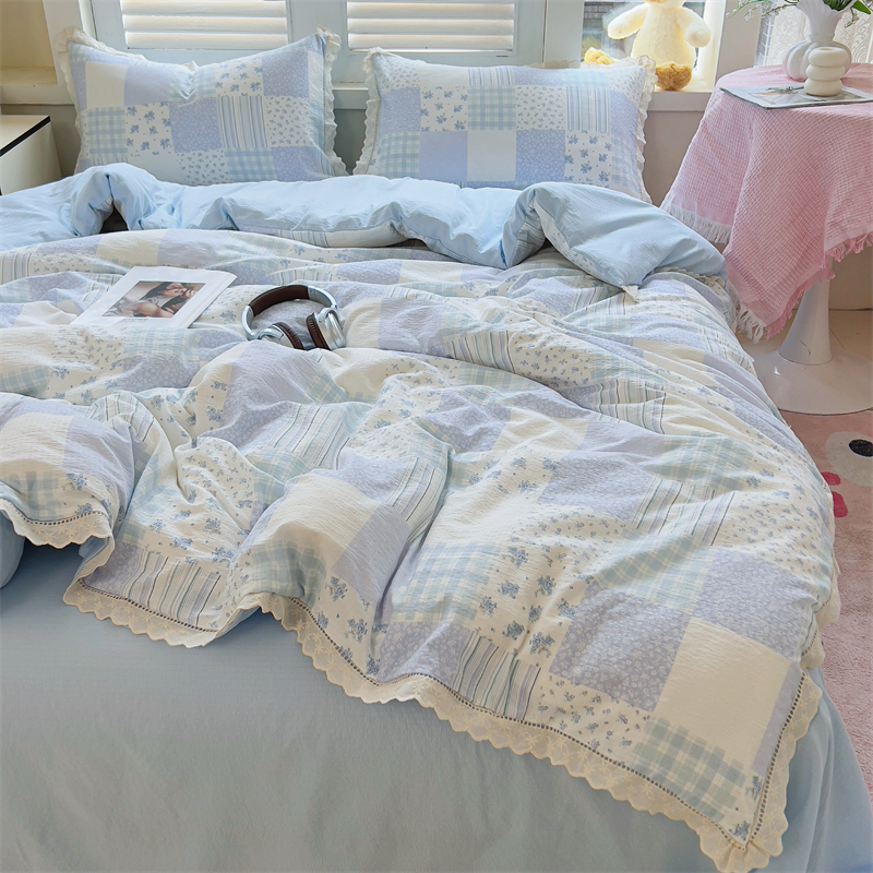 商品名称:壹号库家纺 2026新款云感木棉皱皱纱双层纱四件套-全棉花边款 百福(兰)