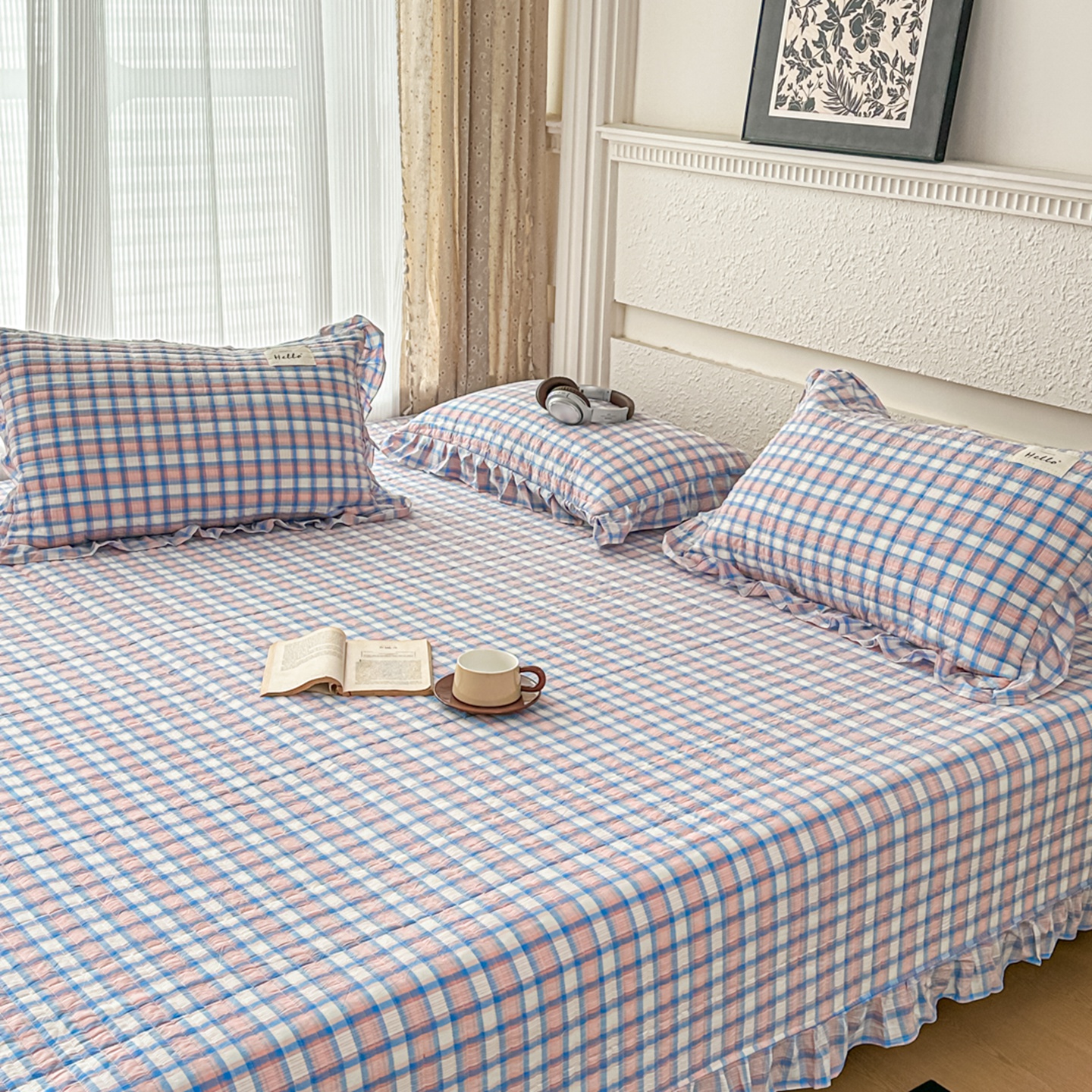 (总)暖居 2026新款大尺寸双层纱高温砂洗245X265床盖三件套,车厘子,粉绿格,洛璃,米妮,旺旺队,小丸子,樱桃可可,饼干熊,木马,小星星
