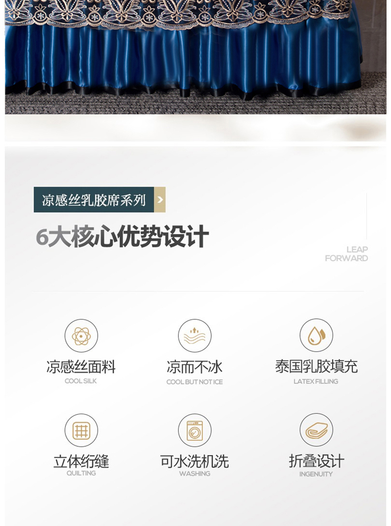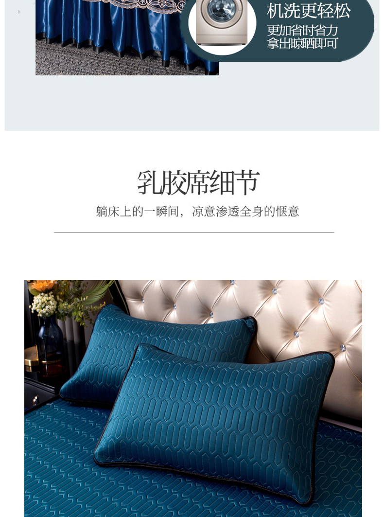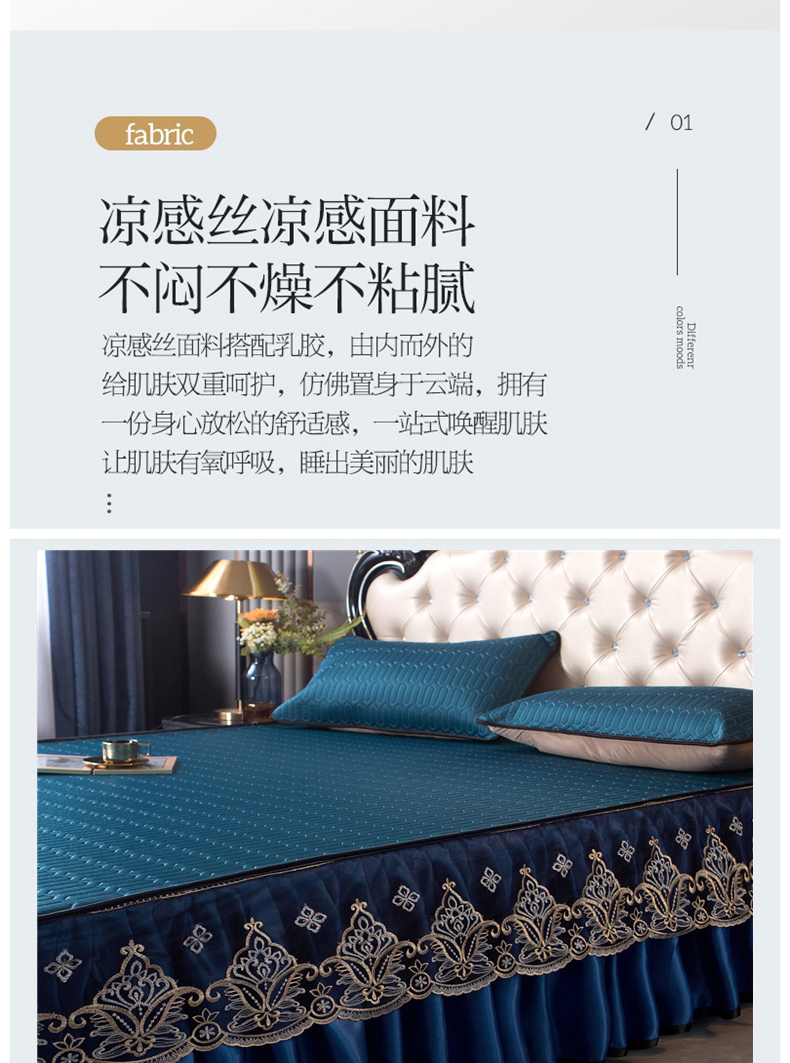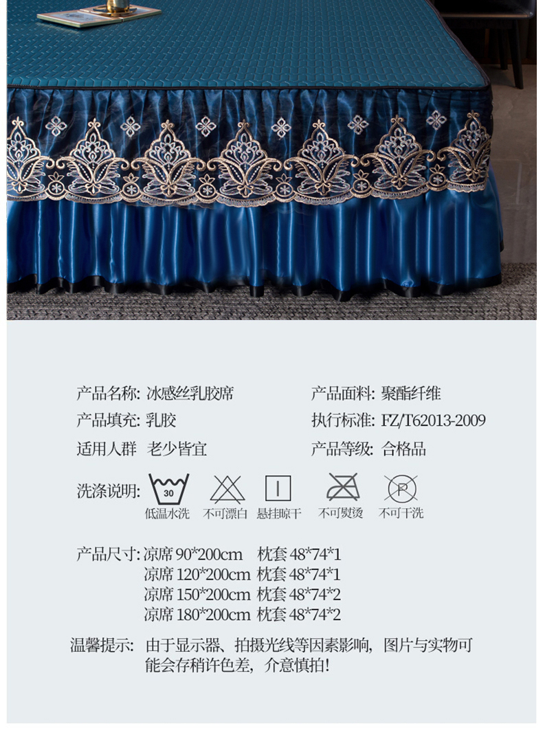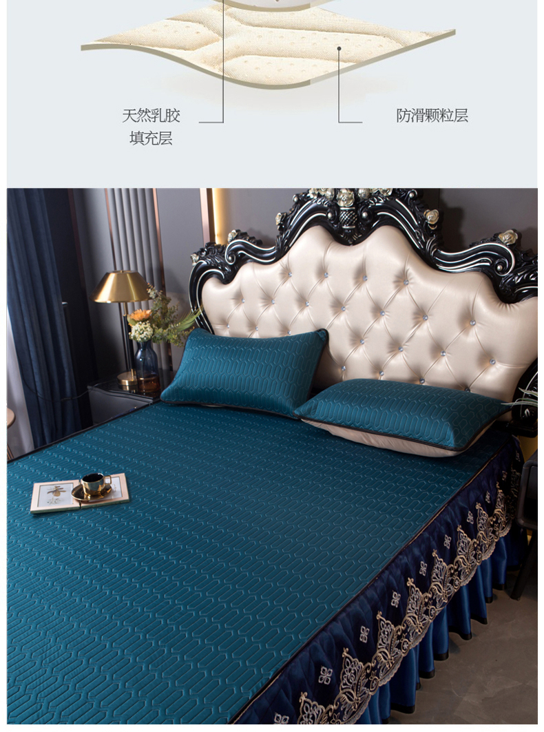 商品名称:能好家纺 2026春夏新款纯色+印花凉感丝乳胶凉席床裙款三件套 孔雀蓝