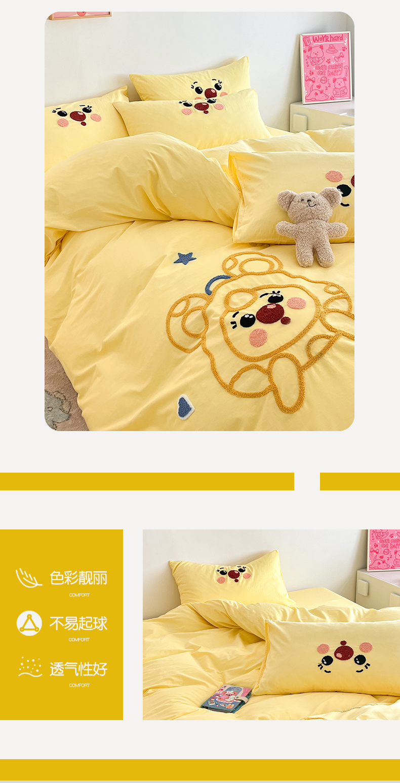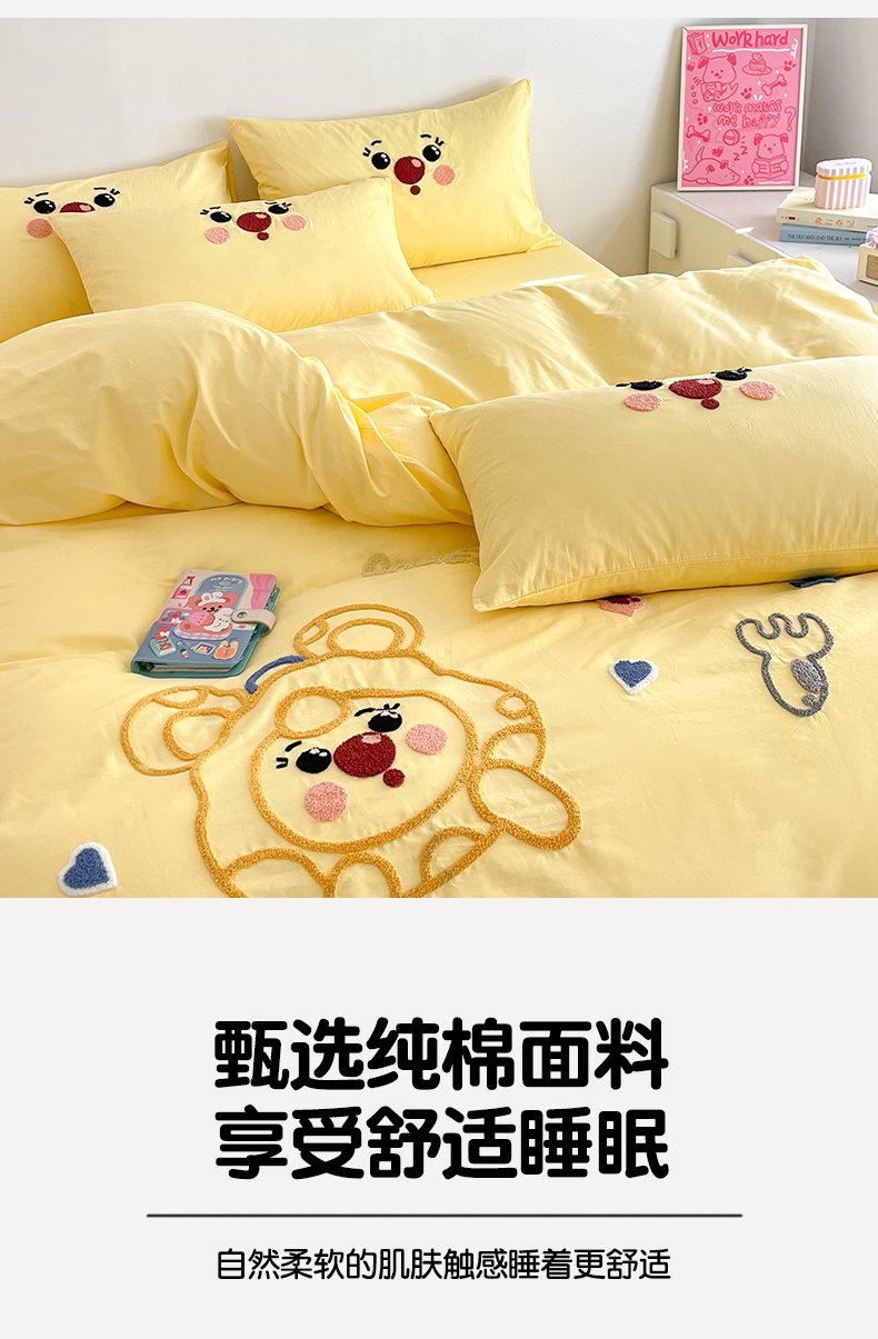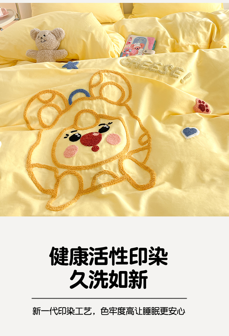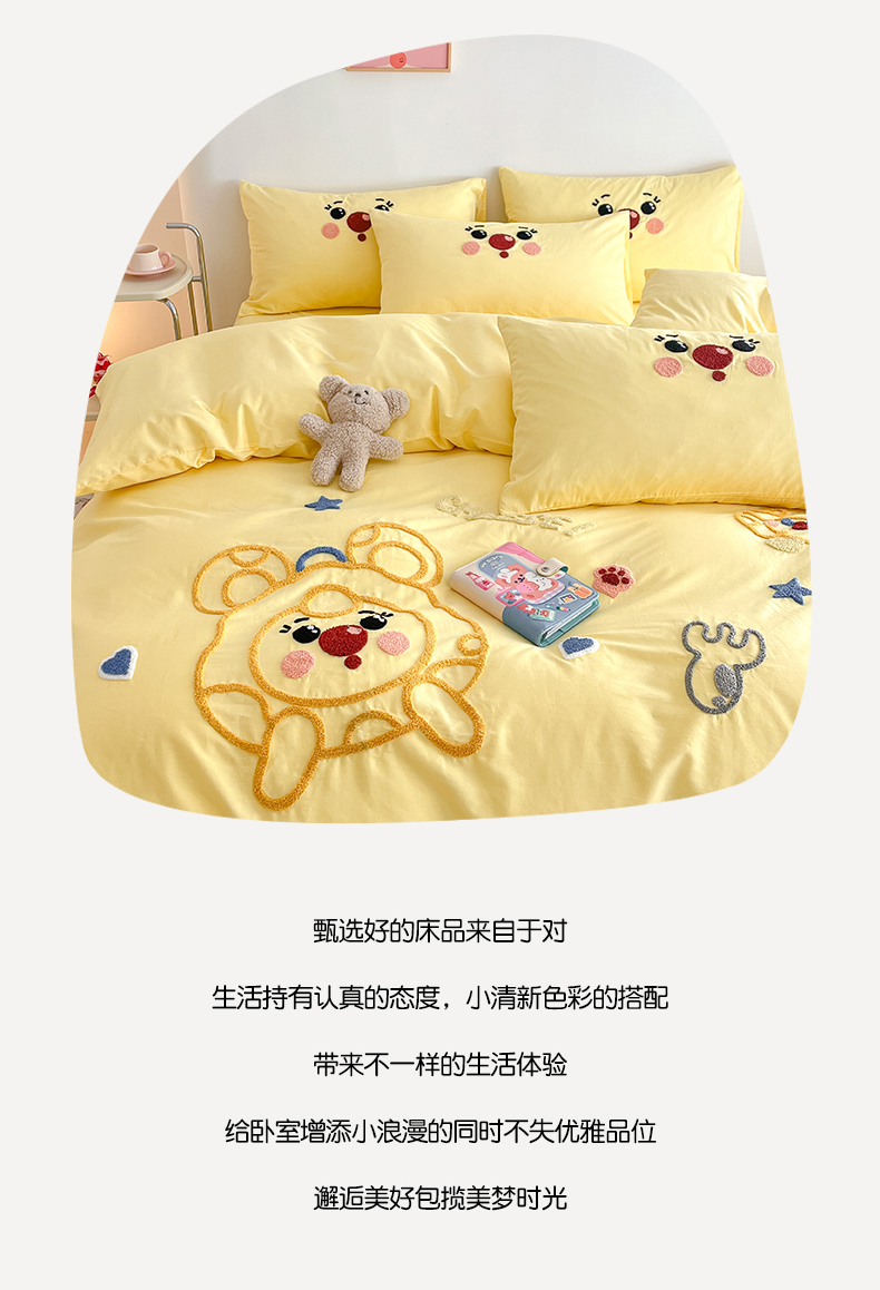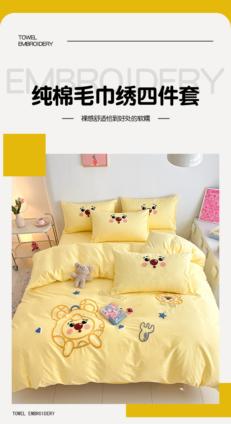 当前位置: 91家纺网 > 商品网购 > 床品套件 > 四件套 > 全棉普通四件套 > 琪格格纺织 2026新款卡通13372全棉纯棉毛巾绣四件套 调皮芝士奶黄