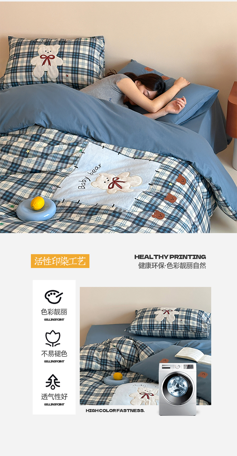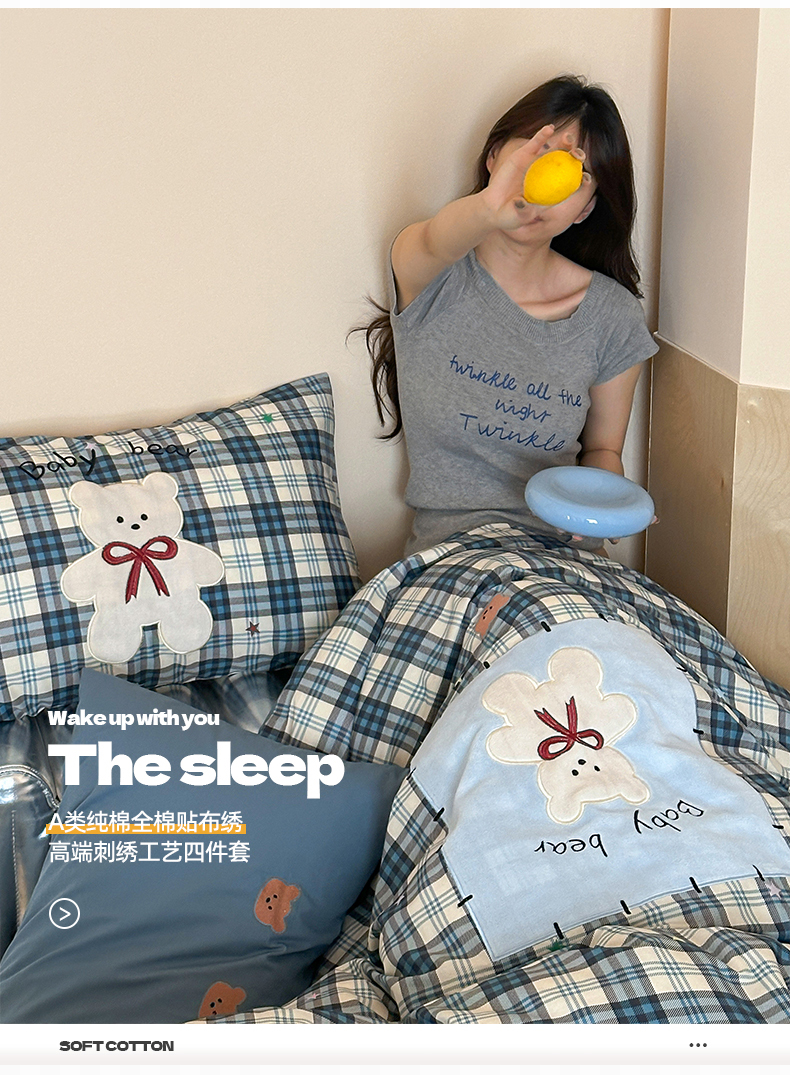 桃子家居 新款A类纯棉全棉元气小马贴布绣高端刺绣工艺四件套 棉贴布绣-蓝格小熊