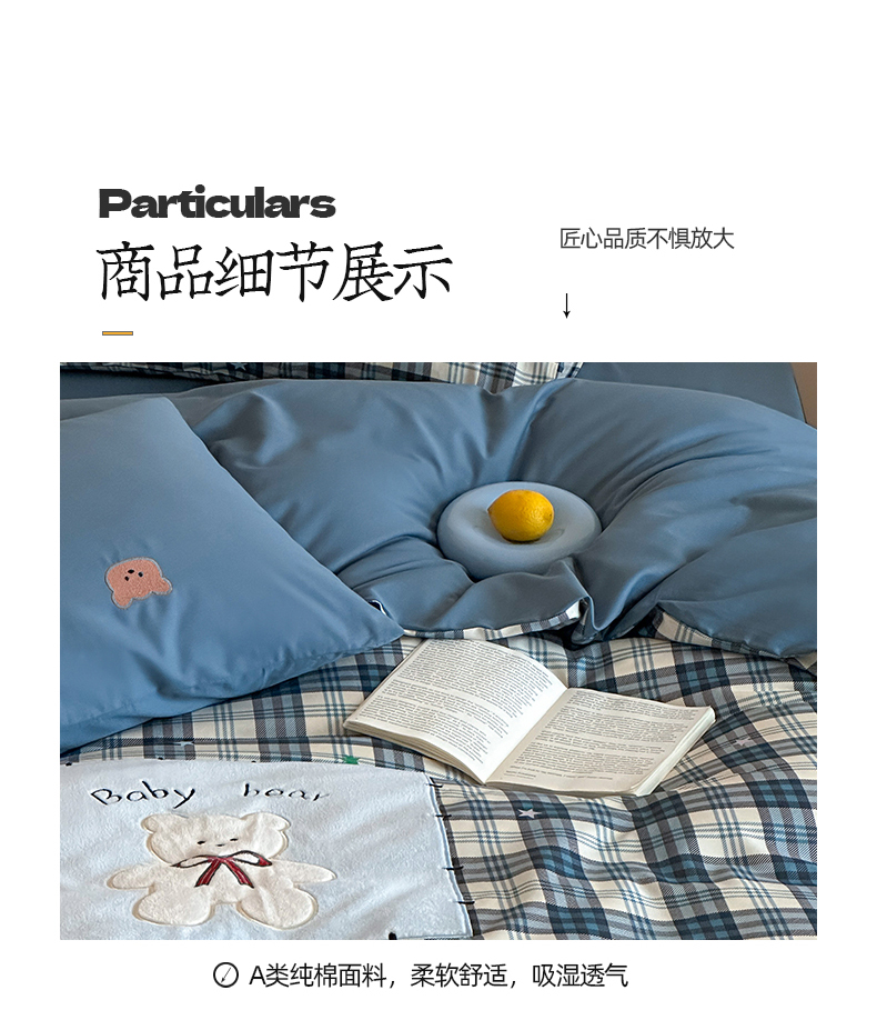 商品名称:桃子家居 新款A类纯棉全棉元气小马贴布绣高端刺绣工艺四件套 棉贴布绣-蓝格小熊