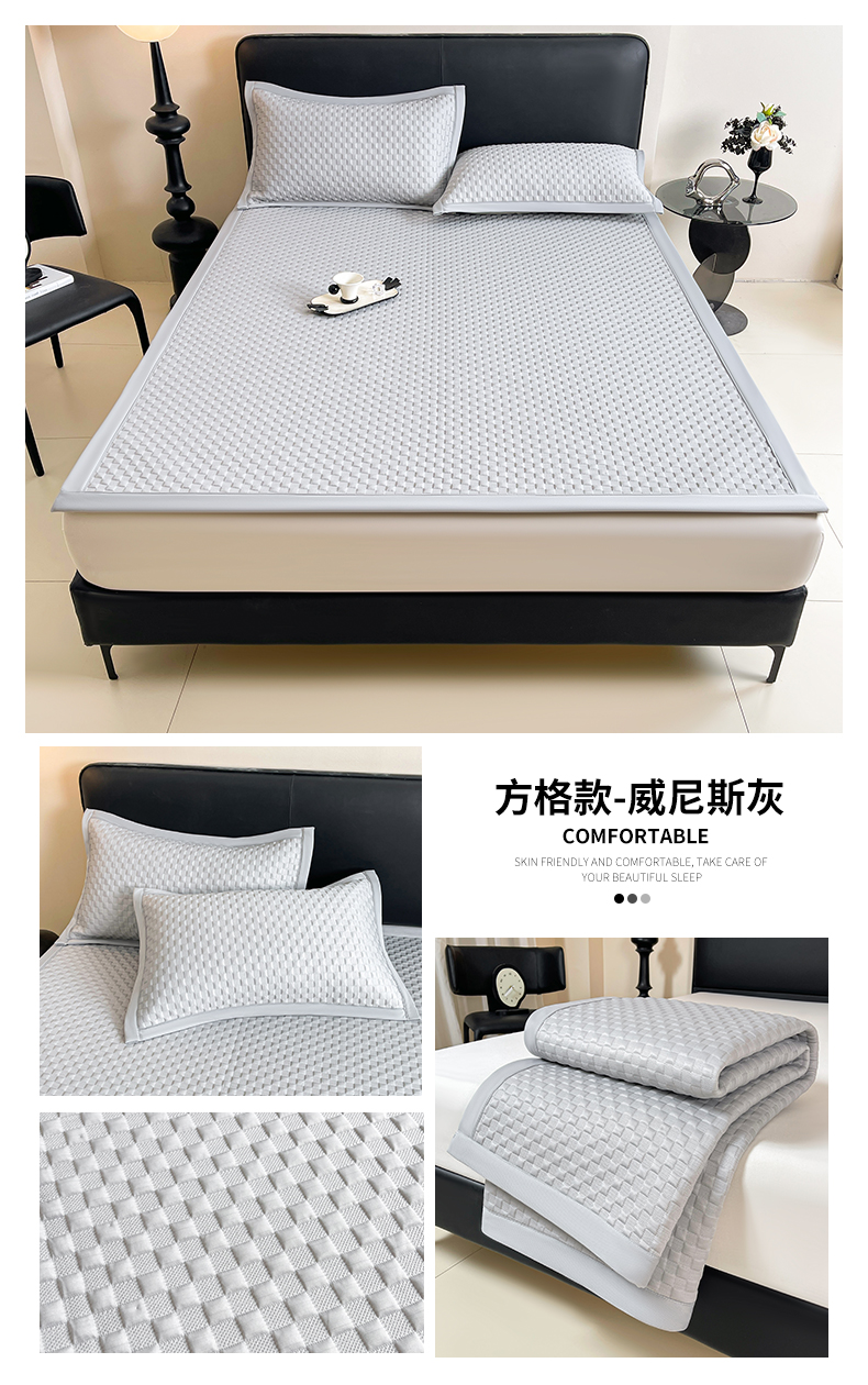 (总)雯豆家纺 2026新款A类PE凉席三件套冰豆豆席A类纯色凉豆豆席子可水洗空调软席,方格款-海涛蓝,方格款-玛莎粉,方格款-清新绿,方格款-威尼斯灰