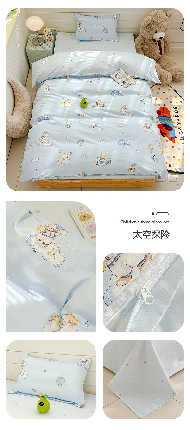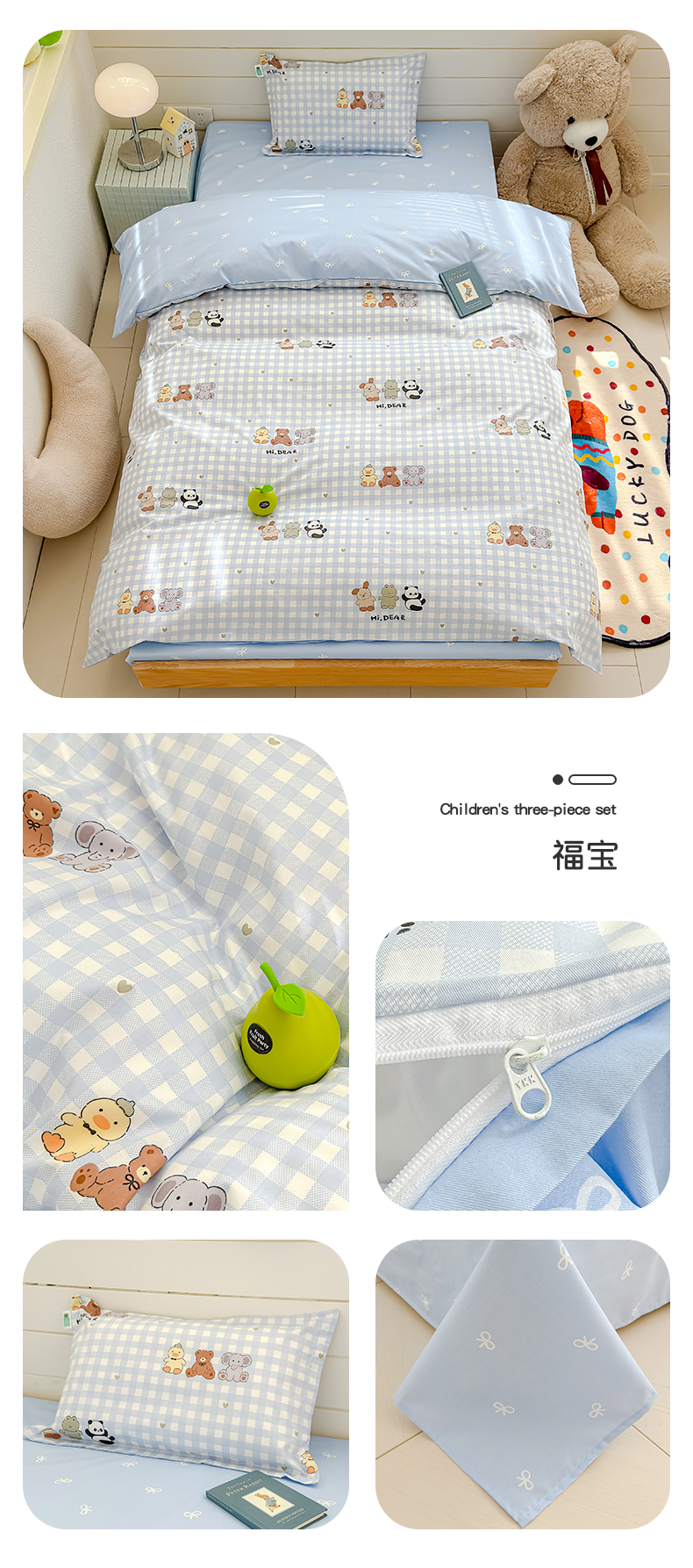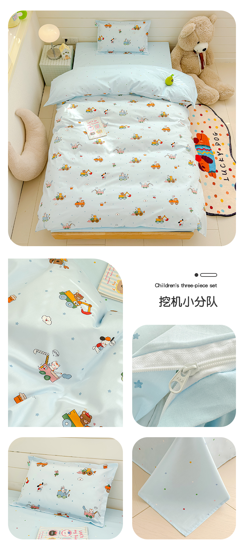 (总)良佐生活 2026年新款A类铂金精梳全棉学生三件套,甜心熊,挖机小分队,调皮象,福宝,乐兔粉,布布,太空探险,乐兔蓝