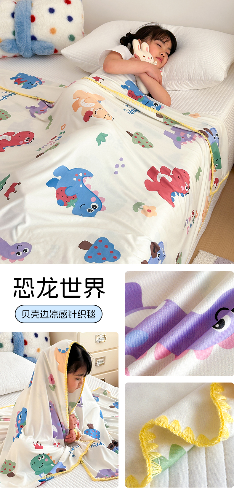 商品名称:嗨生活 2026新款贝壳边婴儿裸睡级凉感针织毯幼儿园夏被儿童夏被毯子盖毯午睡毯旅行毯夏凉 快乐恐龙