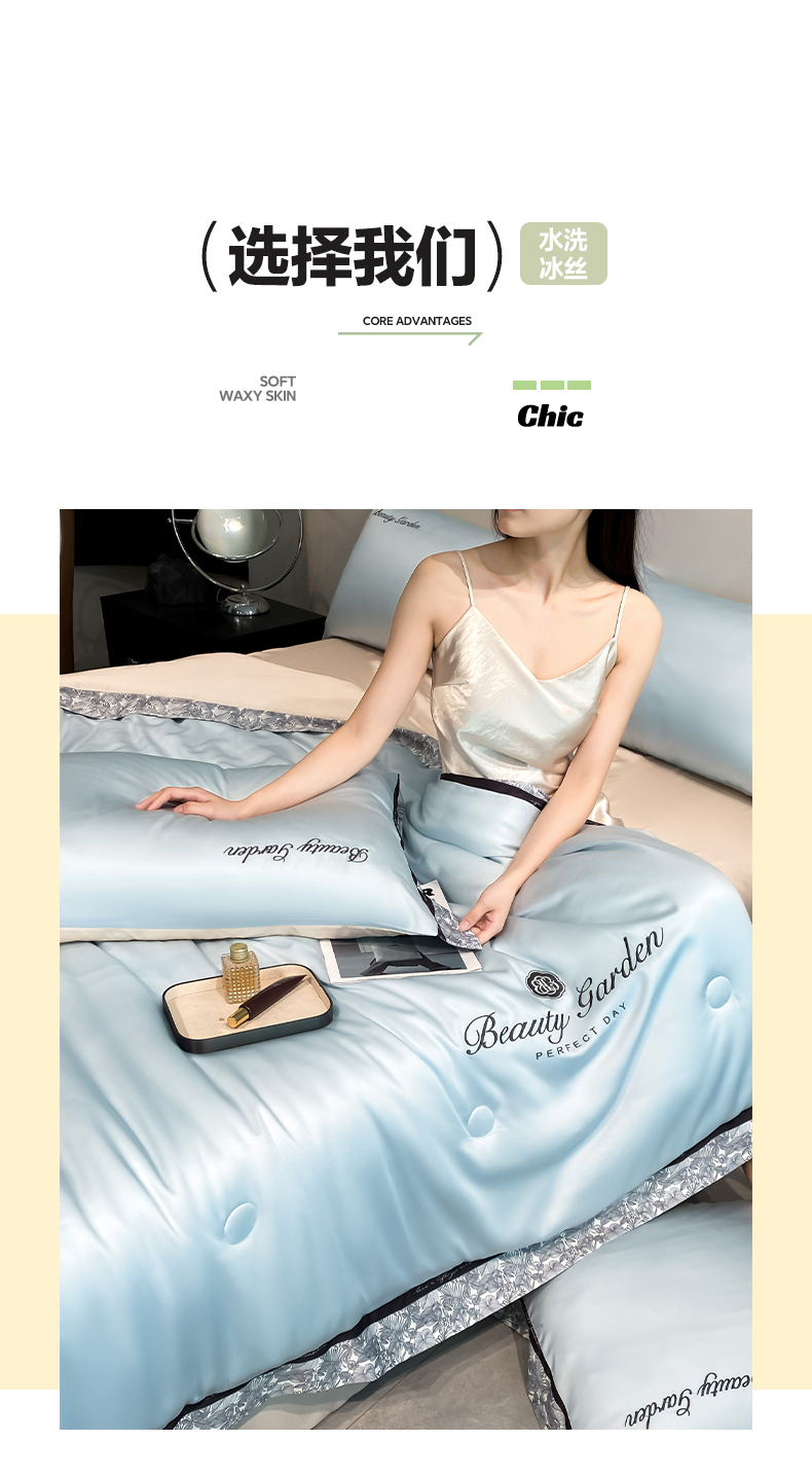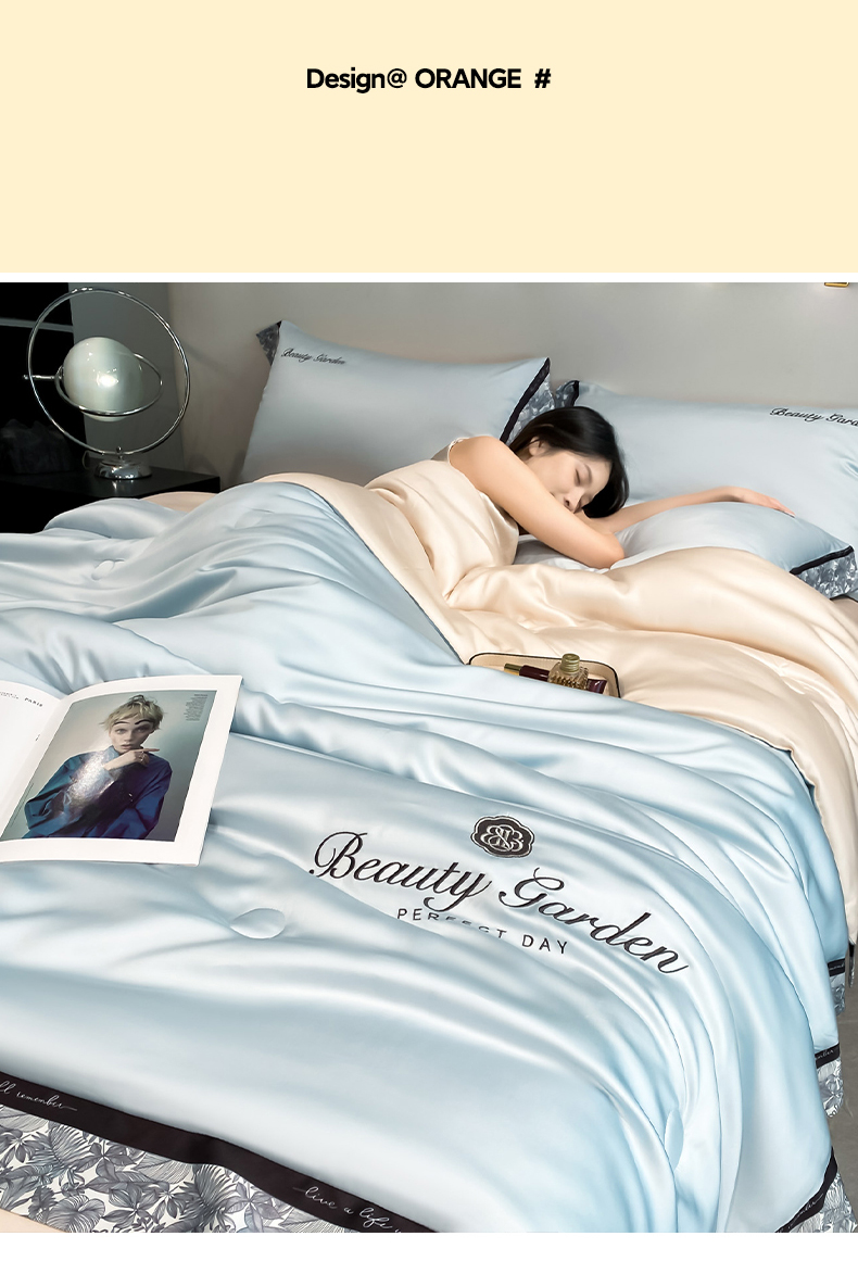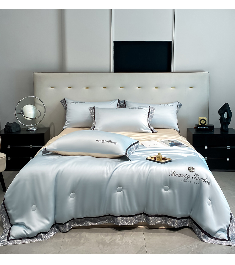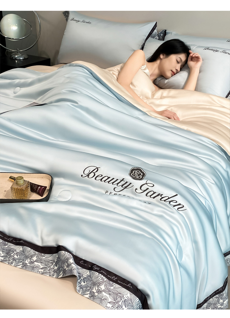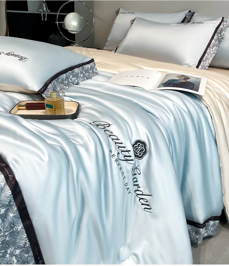 • 91家纺网 家纺一手货源 找家纺 云棉坊 2026新款水洗真丝冰丝夏被夏凉被空调被数码边刺绣款-琉光系列 琉光-天空蓝+梧桐杏
