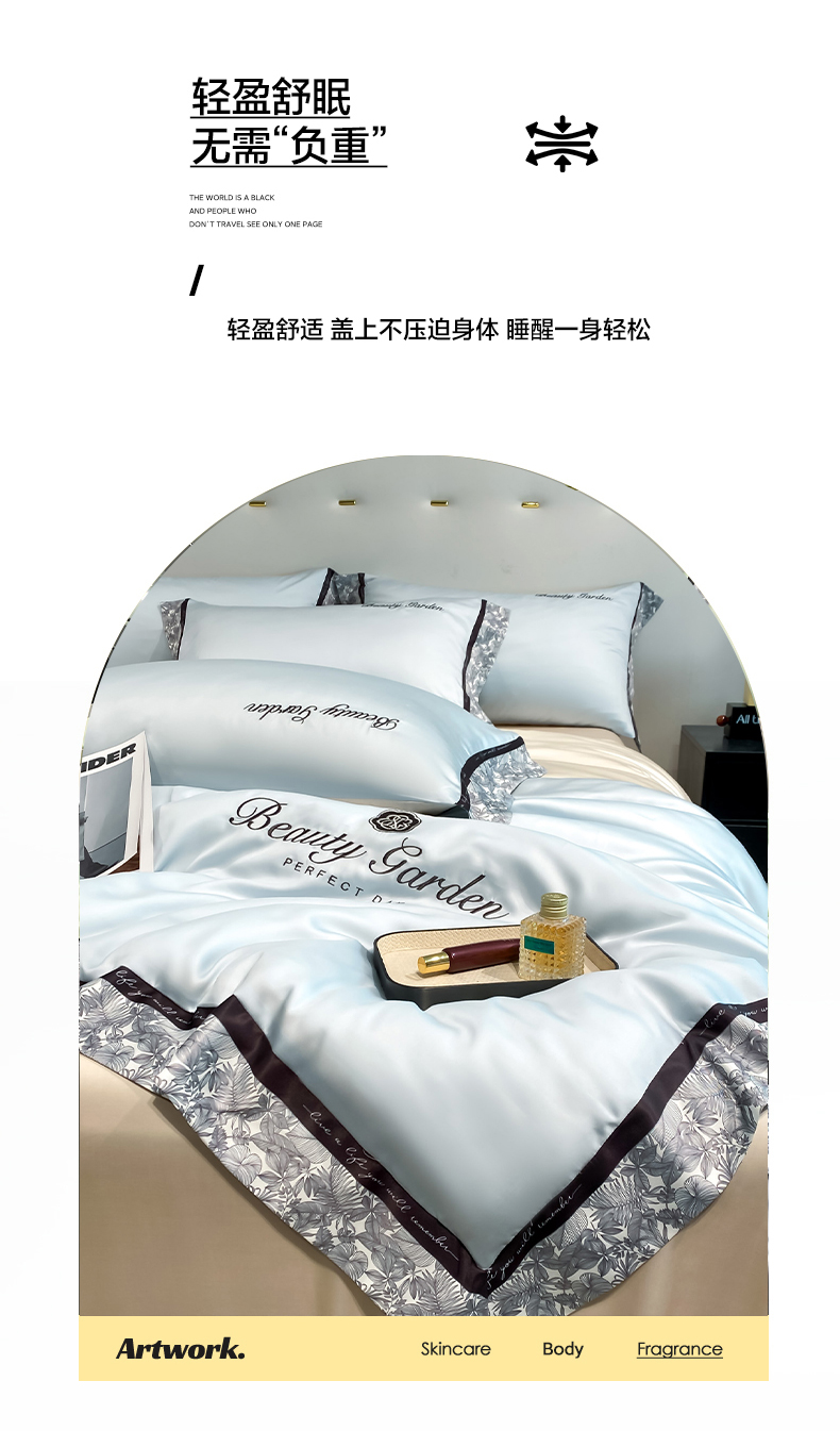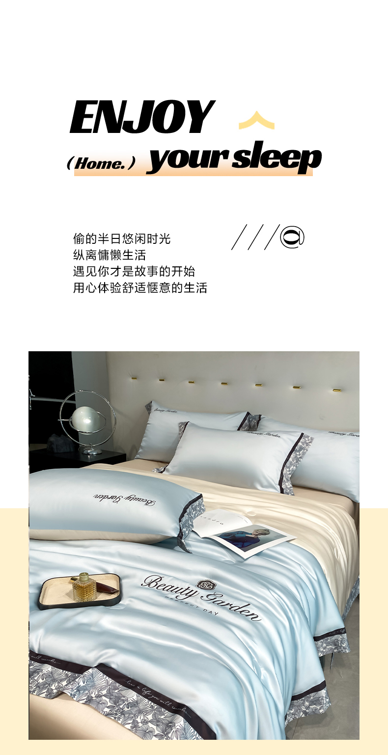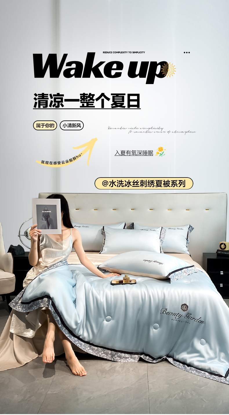 • 91家纺网 家纺一手货源 找家纺 云棉坊 2026新款水洗真丝冰丝夏被夏凉被空调被数码边刺绣款-琉光系列 琉光-天空蓝+梧桐杏