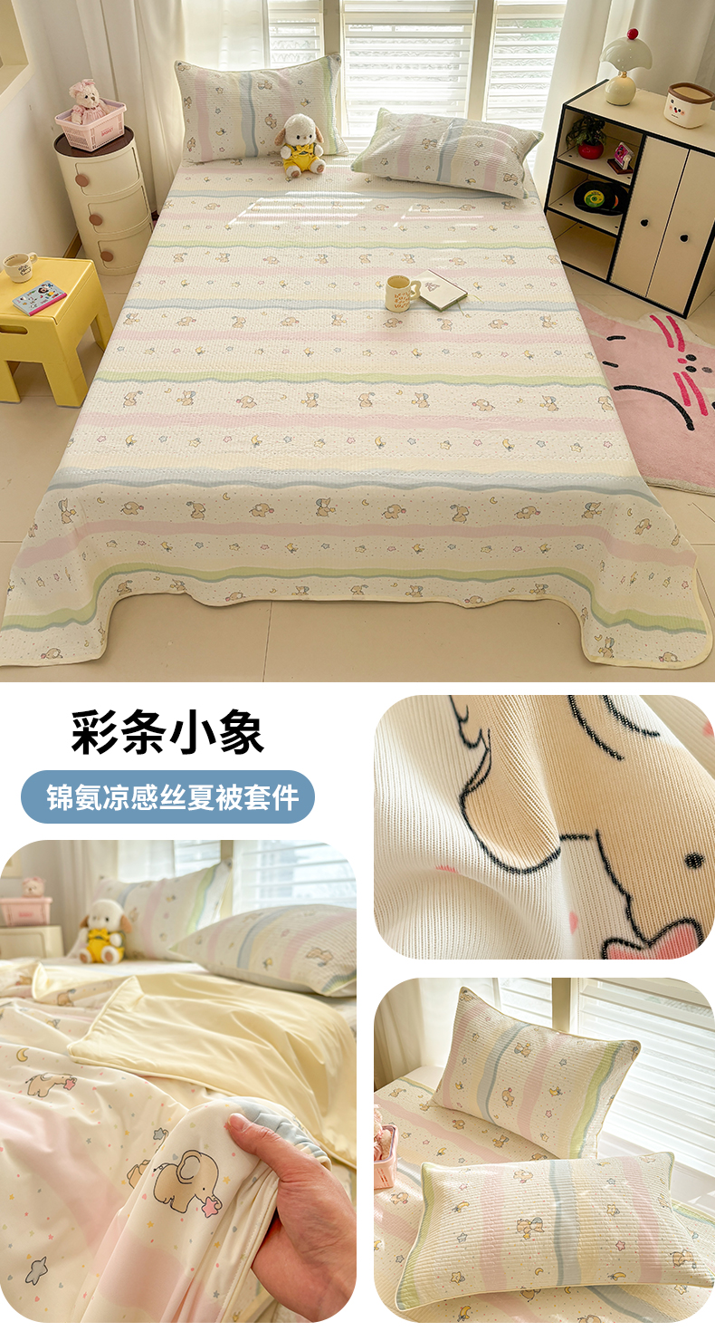 • 91家纺网 家纺一手货源 找家纺 (总)优悦生活馆 2026新款麻绳款锦氨凉感丝夏被,蝴蝶结小兔,彩条小象,飞马,水果小人,小猫花朵,小王子