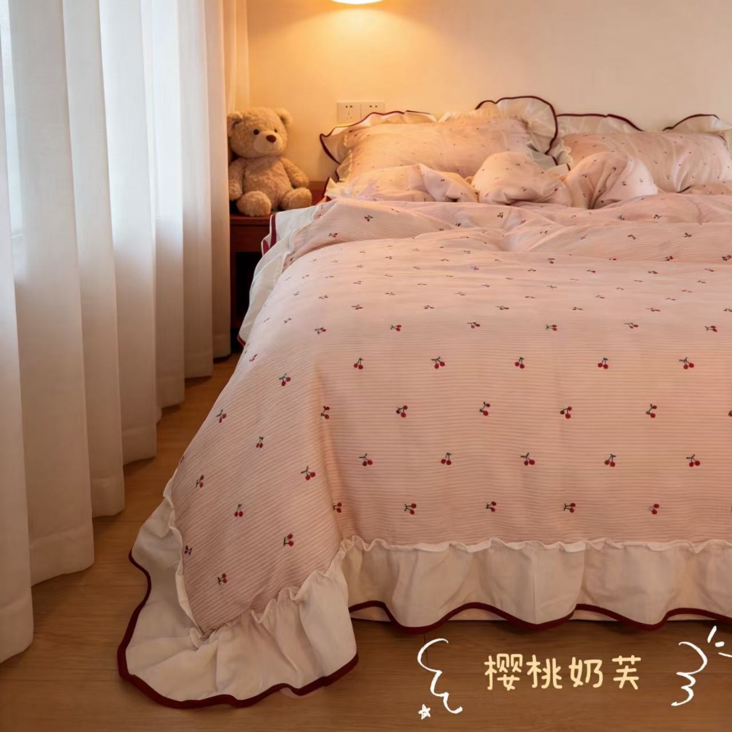 当前位置: 91家纺网 > 商品网购 > 床品套件 > 四件套 > 全棉普通四件套 > 荣轩家居 2026春夏新款韩式重工泡芙花边工艺款全棉纯棉双层纱四件套(铺床版) 山野小玫瑰