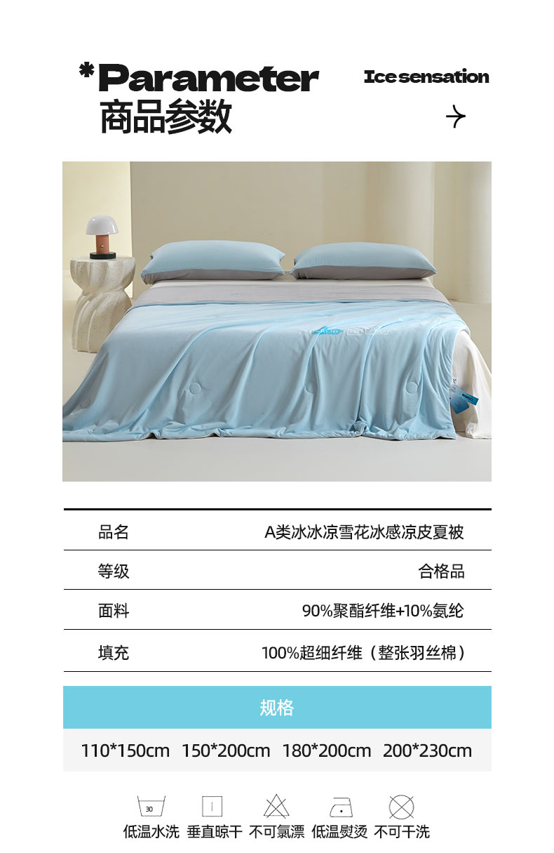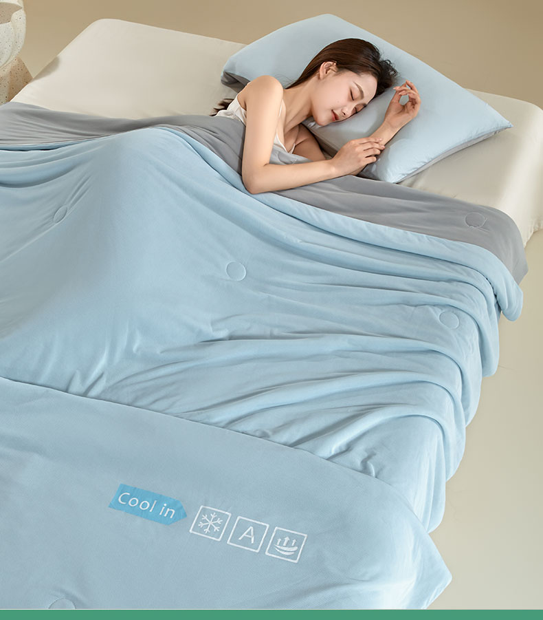 当前位置: 91家纺网 > 商品网购 > 被子 > 夏被 > 桃子家居 2026新款A类高品质冰冰凉雪花冰感凉皮双面加倍透气孔氨纶凉感夏被 冰感凉皮-天蓝灰(加倍透气)