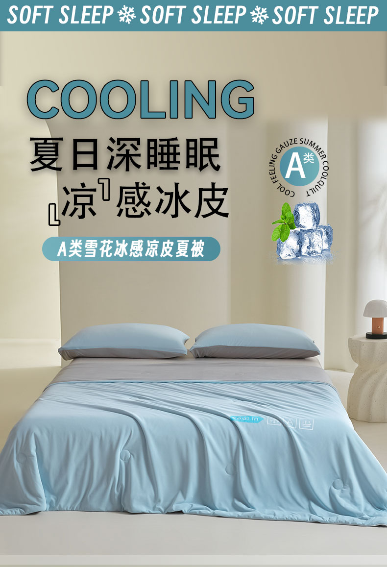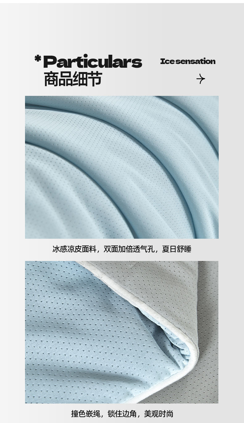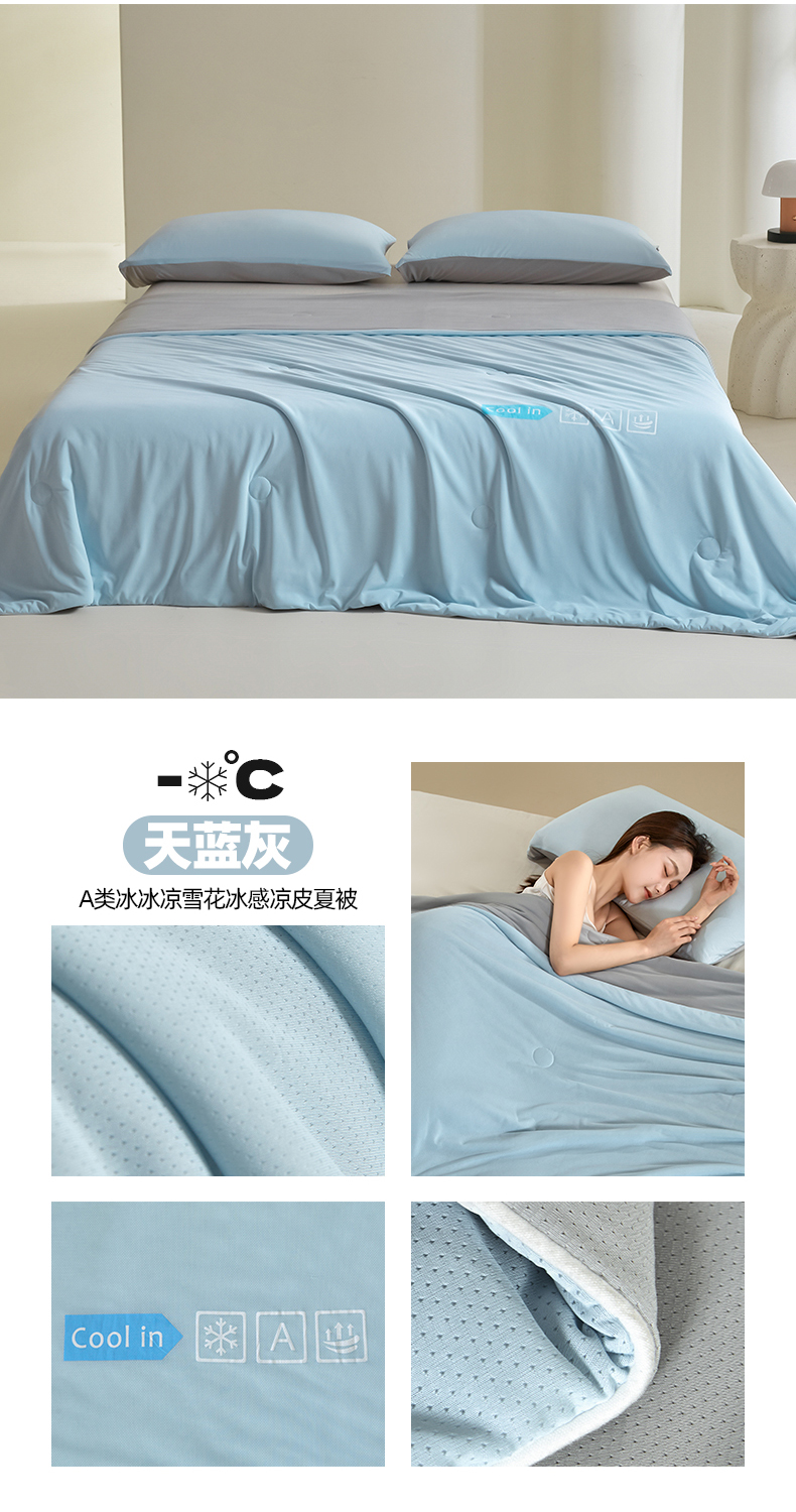 • 91家纺网 家纺一手货源 找家纺 桃子家居 2026新款A类高品质冰冰凉雪花冰感凉皮双面加倍透气孔氨纶凉感夏被 冰感凉皮-天蓝灰(加倍透气)